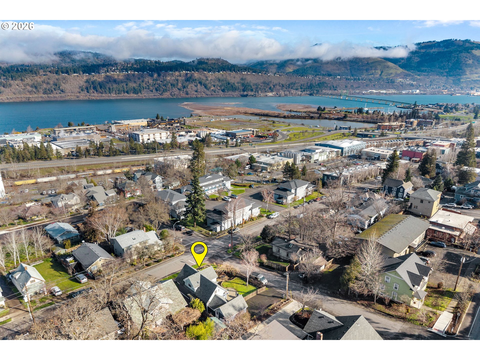 Experience the charm of Hood River living in this character-filled 1900s Craftsman-inspired home. Graced with peek-a-boo views of the Columbia River, 10-foot ceilings, and original hardwood floors throughout the living room, dining room, bedrooms, and staircase, this home offers warmth and timeless appeal. The flexible floor plan includes a main-level bedroom and full bathroom, ideal for guests or everyday living. The kitchen and bathrooms feature newer flooring and offer a great opportunity to update and personalize. Multiple system improvements provide year-round comfort and ease. Start your mornings on the covered front porch taking in the views or unwind on the private patio surrounded by seasonal blooms including wisteria, lavender, and tulips. Situated on a corner lot, the property offers off-street parking, an attached garage with loft storage areas, and an unfinished basement/crawl space with exterior access—perfect for additional storage. Located just blocks from downtown Hood River, this home places you with-in blocks of local shops, dining, and events and minutes from waterfront recreation, trails, and the outdoor lifestyle the Columbia River Gorge is known for. A wonderful opportunity to own a character-rich home with room to make it your own in one of Hood River’s most desirable neighborhoods.