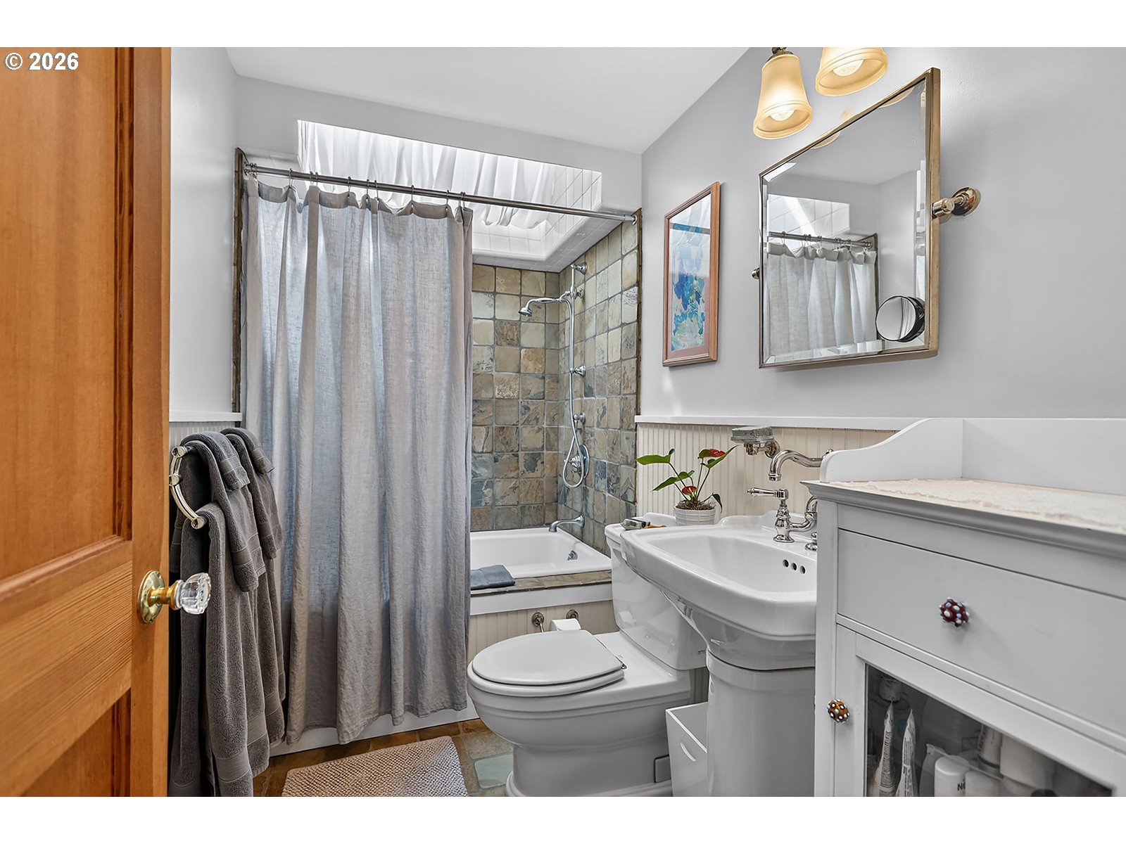 GarageDoorOpener, HardwoodFloors, Laundry, Skylight, SlateFlooring, Wainscoting, WasherDryer