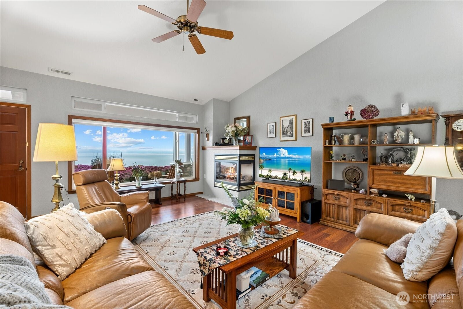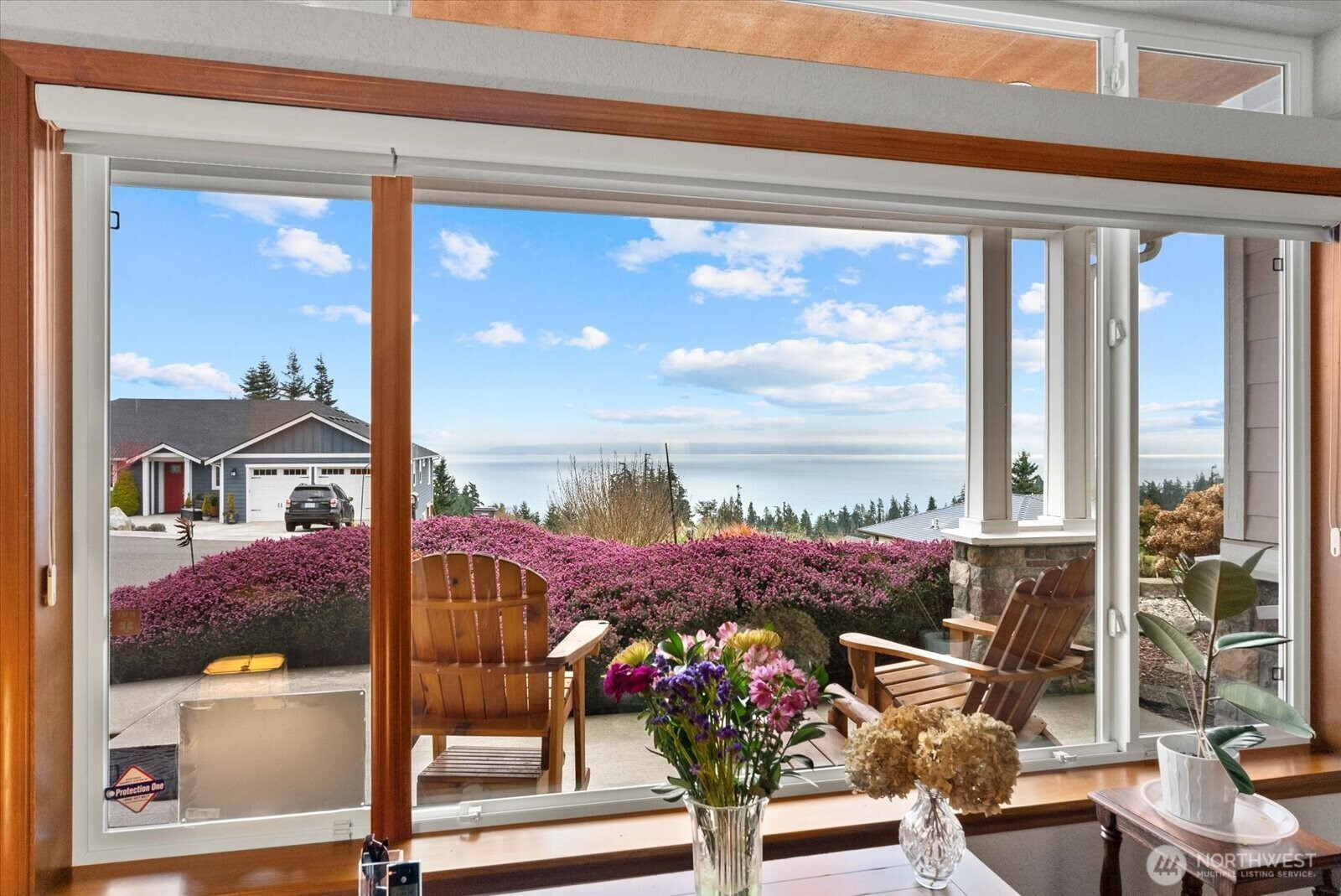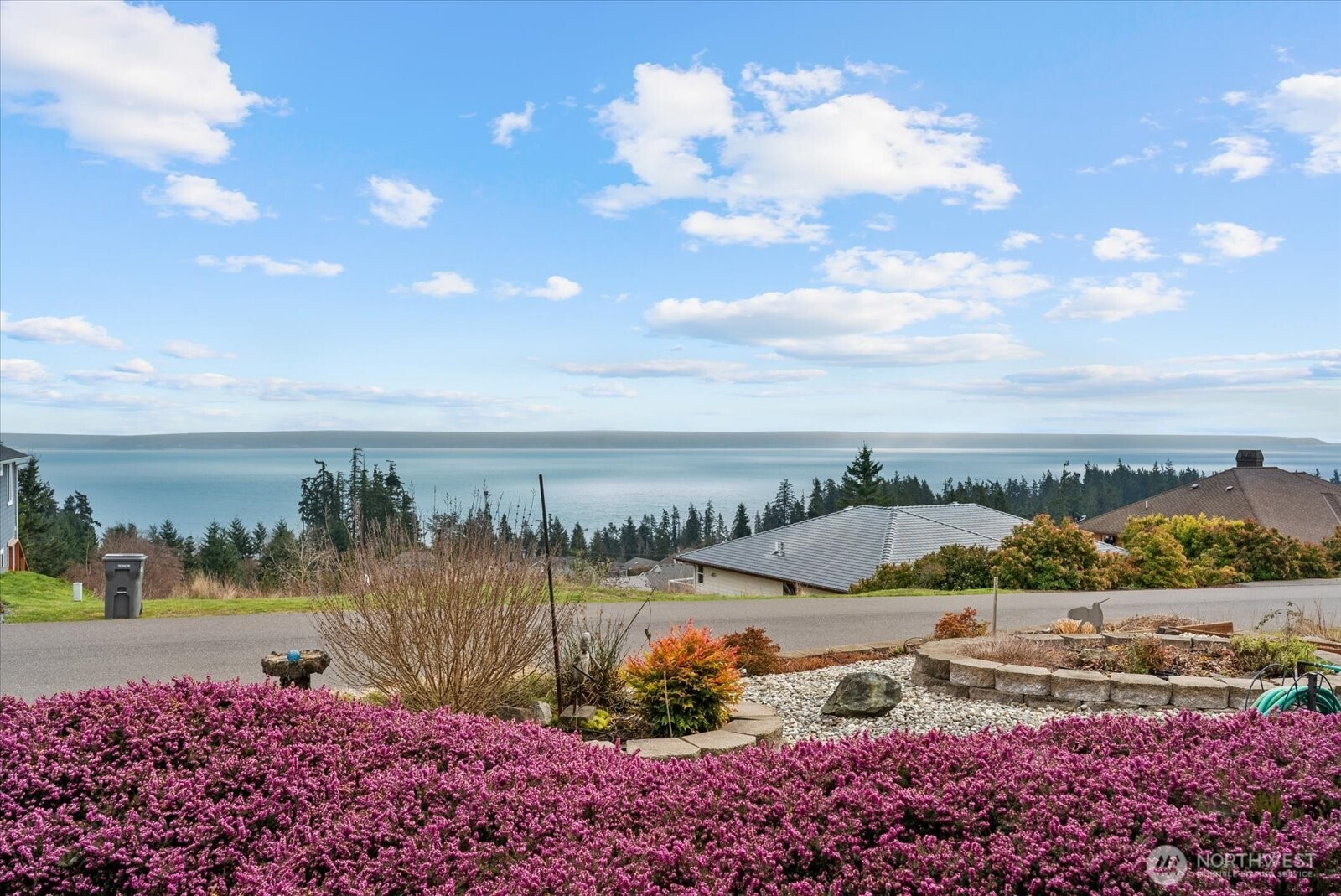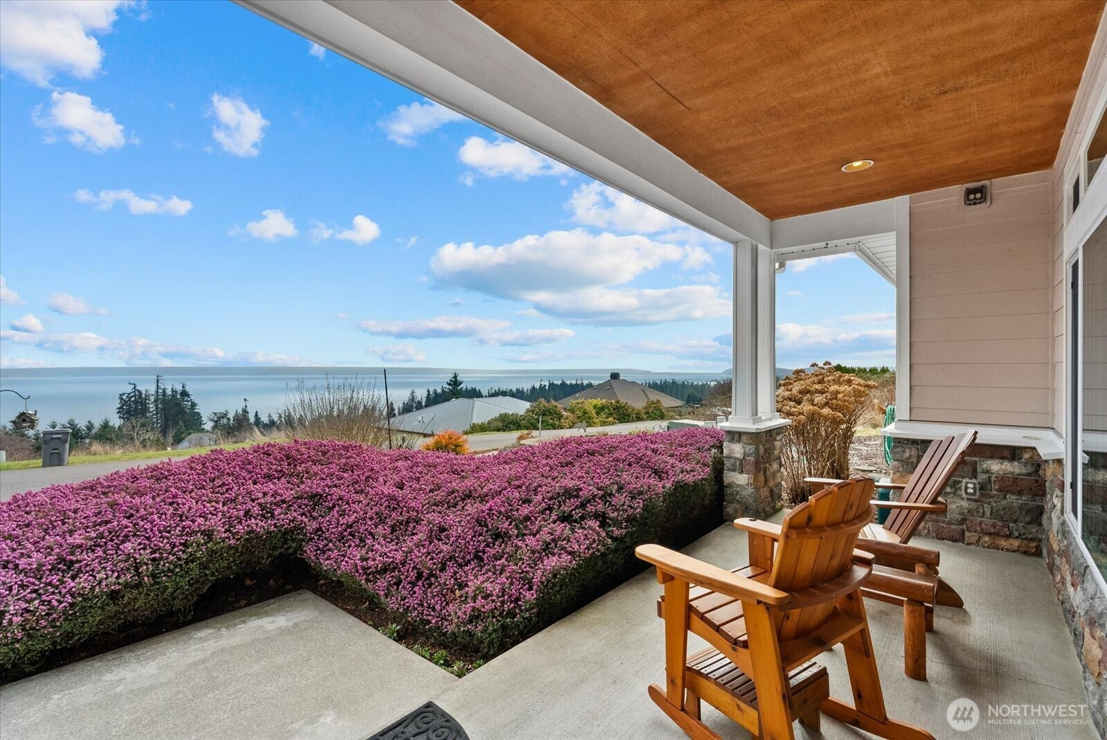 Sweeping views of Port Susan and the Cascade Mountains can be enjoyed from this meticulously maintained, well-appointed custom one-story home on Camano Island, offered for the first time. Tucked into a quiet cul-de-sac, this 3-bedroom, 1.75-bath rambler provides privacy, comfort, and effortless single-level living. Spanning 2,080 sq ft, the home features vaulted ceilings, skylights, and expansive windows that fill the interior with natural light while framing stunning water and mountain vistas. The open-concept layout is designed for easy living, with spacious rooms, wide hallways and doorways, and thoughtful accessibility (including for mobility devices) throughout. Gleaming laminate wood flooring and solid maple cabinetry highlight the home’s quality and craftsmanship. The great room is anchored by an inviting fireplace, while a second fireplace in the primary suite creates a private retreat complete with a luxurious 5-piece en-suite bath featuring a soaking tub. Year-round comfort is ensured with a heat pump and A/C, a brand-new roof, and an auto-start generator for peace of mind. Outdoor living is enhanced by covered front and rear porches, mature landscaping, and a dedicated garden area ideal for relaxing or entertaining. The oversized, extra-wide 895 sq ft three-car garage offers ample space for storage, hobbies, recreational gear, and a functional workspace. A rare opportunity to own a home that blends quality, comfort, and a peaceful setting.