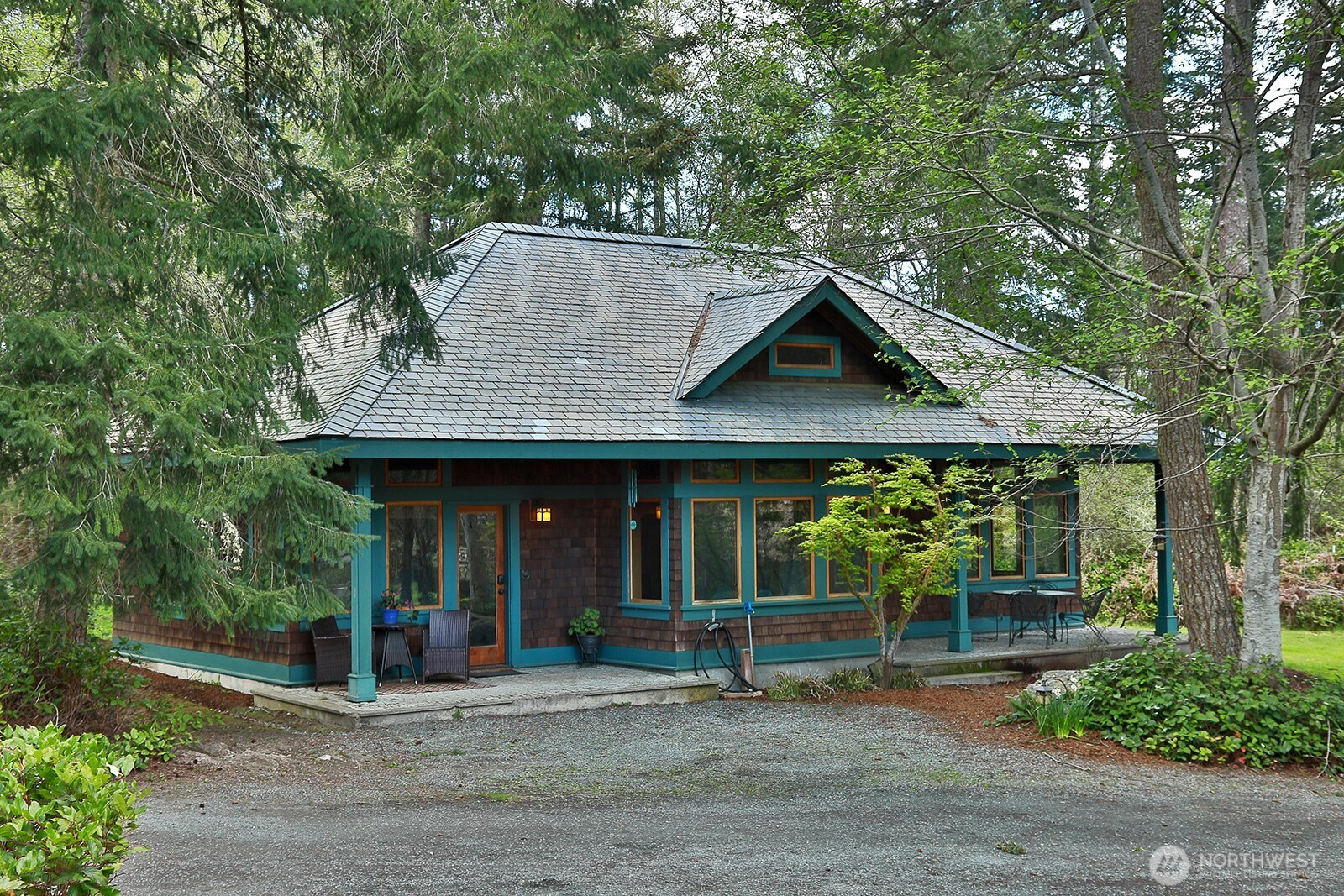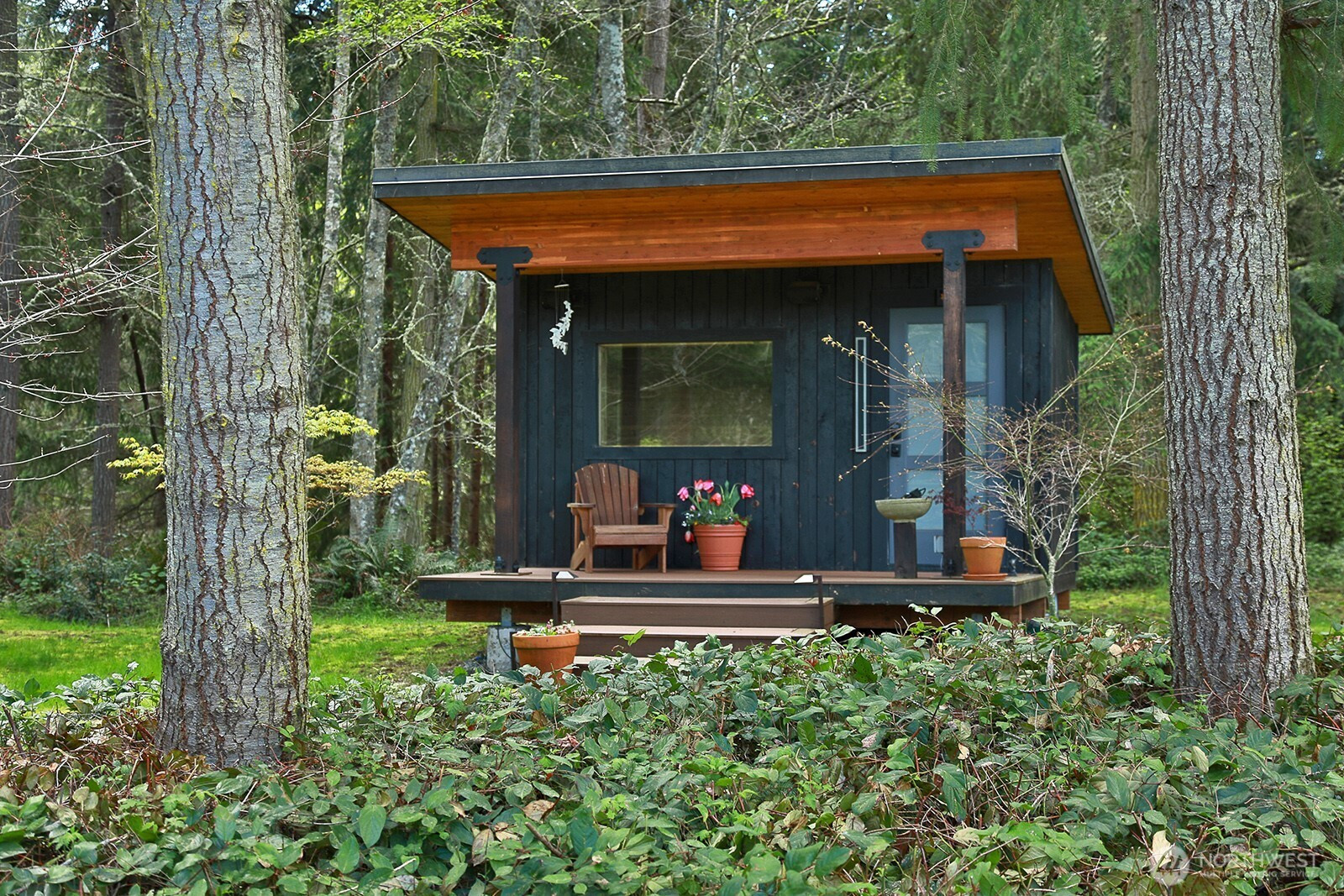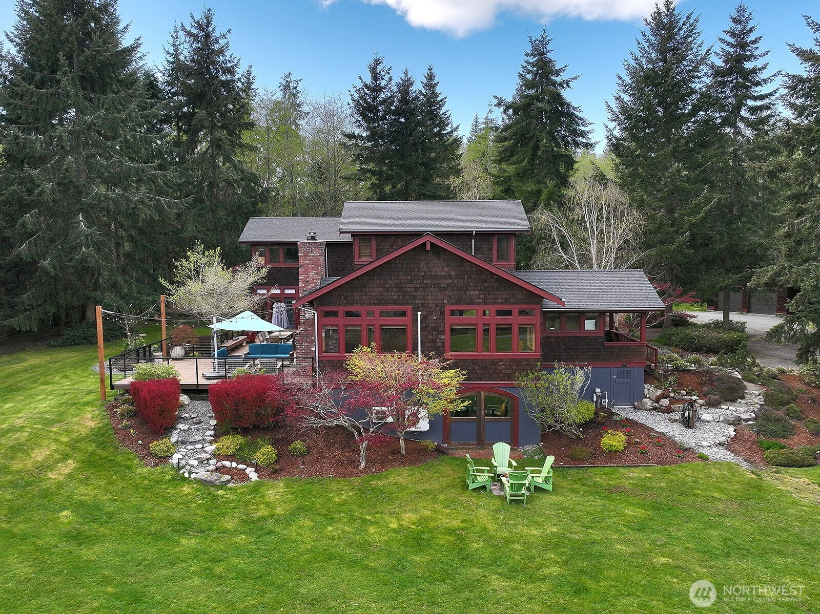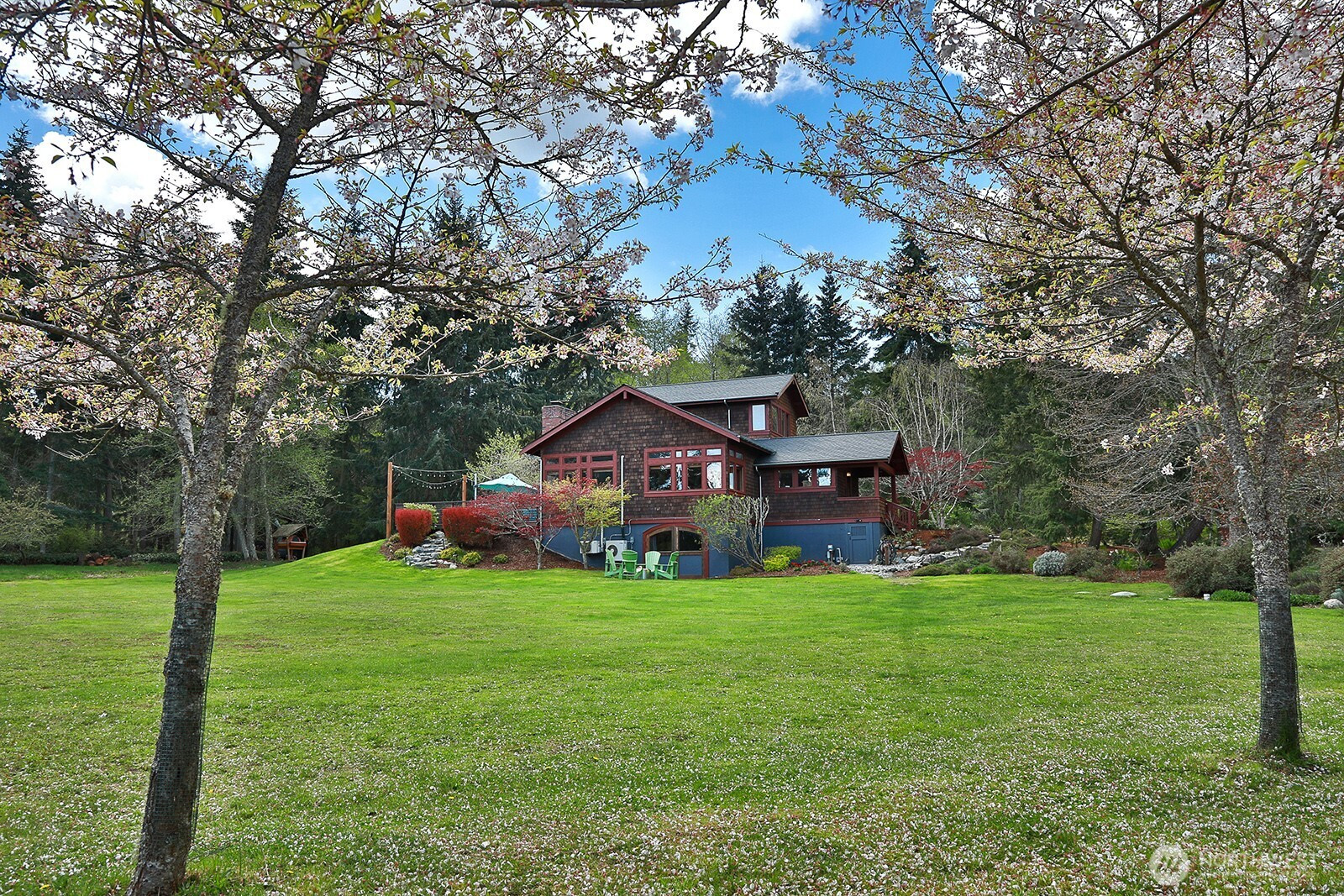 The Tanager House -- Set just shy of 10-acres and built by the nationally recognized artist, Kent Lovelace, the home blends artistry, craftsmanship, and intentional living. Inspired by Frank Lloyd Wright, it was created to dissolve boundaries between indoors and out. Local fir, island stone, and American clay walls root the home to the land while enhancing wellness and comfort. Hydronic radiant heat, mini-splits and smart home systems bring modern ease to natural materials. The landscape is a painter’s canvas; seasonally shifting in color and texture. Summer unfolds on the expansive deck overlooking a pond and evergreens; in winter, the trees and stonework create a serene backdrop. The quiet is profound, protected by the forest behind the home and framed by territorial garden, and pastoral views. Flexible multi-level living allows single level ease or expansion. Entertainment flows from deck and lawn to bar, pool table, and media area, with wellness supported by a sauna, gym, and a fenced quarter-acre garden with greenhouse and automated irrigation. The self-sufficient ADU adds an additional 1231 (+/-) sq.ft. and offers a full kitchen, new bathroom, and private outdoor space; ideal for guests or added revenue. A private, idyllic blend of town and country, The Tanager House is a living work of art for those who value nature inspired design and quiet beauty.
