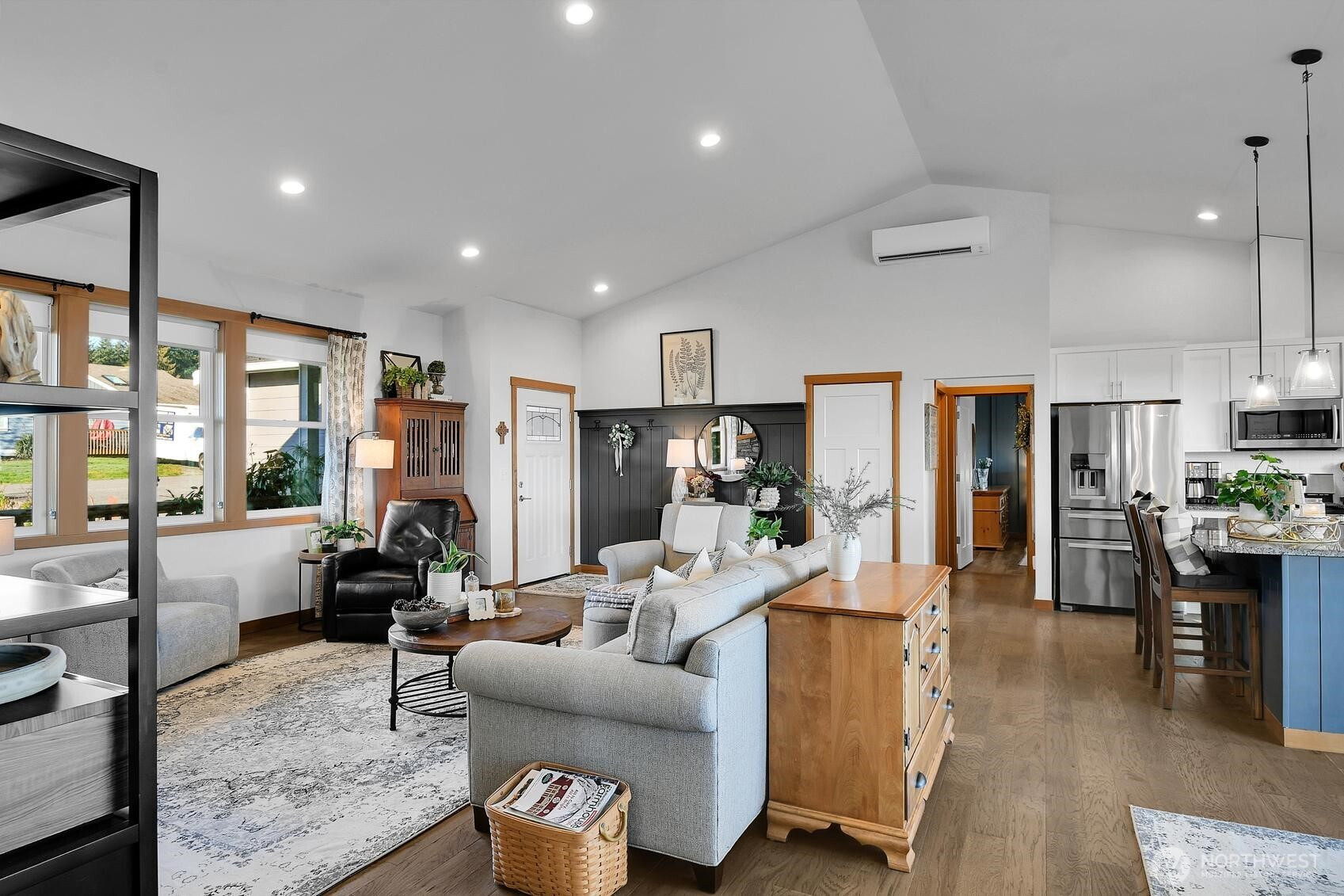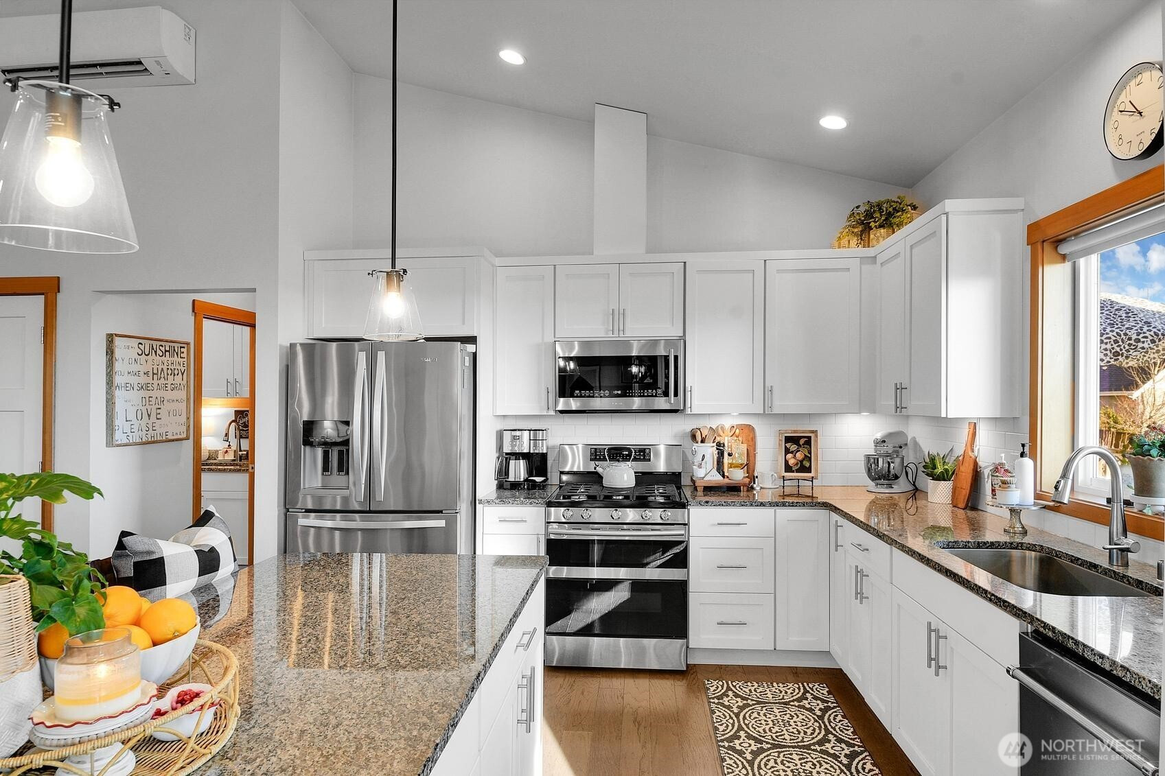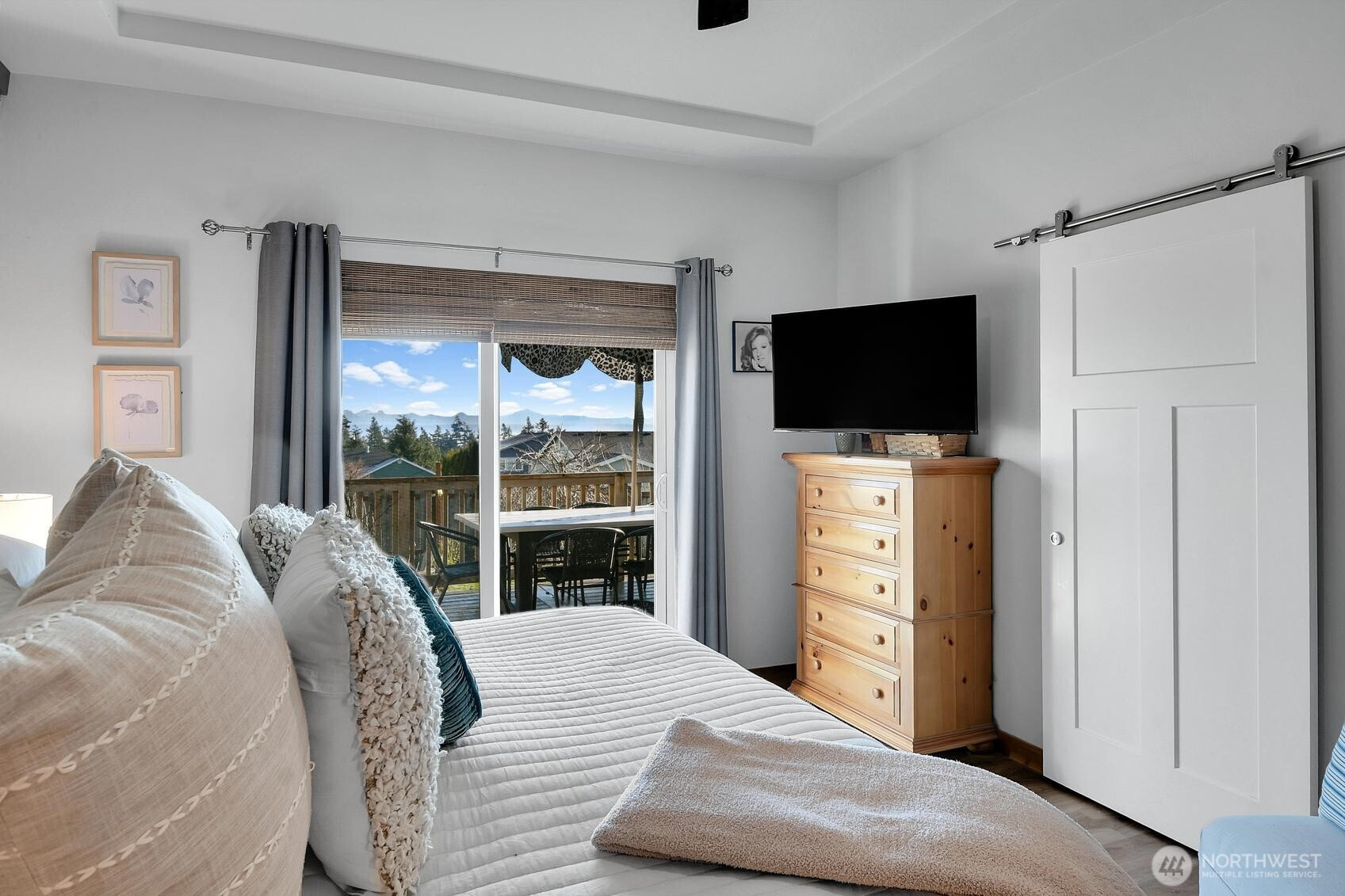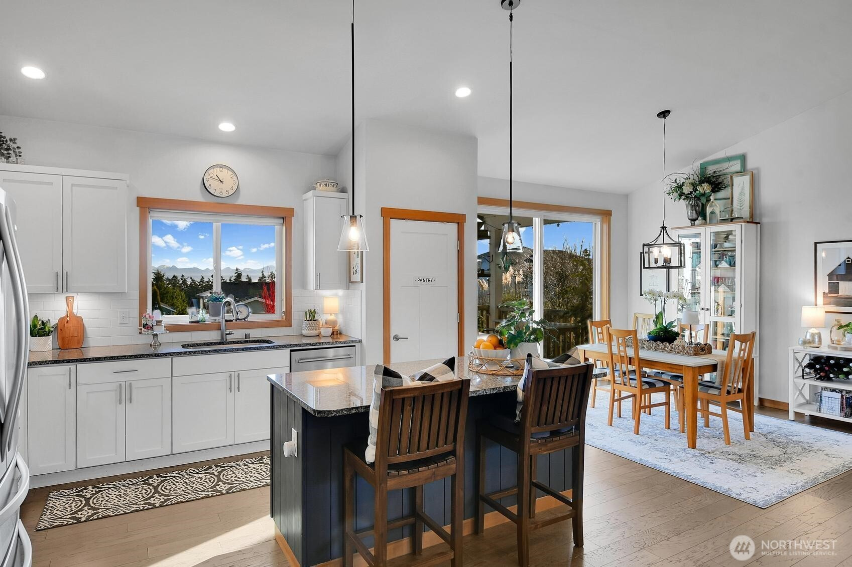 On the sunlit east facing side of Camano Island, where bald eagles soar overhead and neighbors linger on evening walks, this refined 3-bedroom rambler with mountain views offers a life shaped by nature and community. Vaulted ceilings rise above a warm, light-filled great room anchored by a gas fireplace and thoughtful millwork, creating an effortless flow into the kitchen with white shaker cabinetry, granite counters, subway tile, and a generous island for gathering. A welcoming covered front porch sets the tone for westerly facing sunset skies, while the back deck welcomes views of breathtaking sunrises and the Cascade mountains. The covered portion of the back deck serves as an outdoor living room—perfect for summer dinners, garden views, and nearby fireside conversations at the fire pit. The serene primary suite opens to the deck and features a spa-inspired bath and walk-in closet. A rare third garage bay has been transformed into a heated art studio, inviting you to fully embrace the artist culture so prominent on Camano and its creative rhythm of island living.