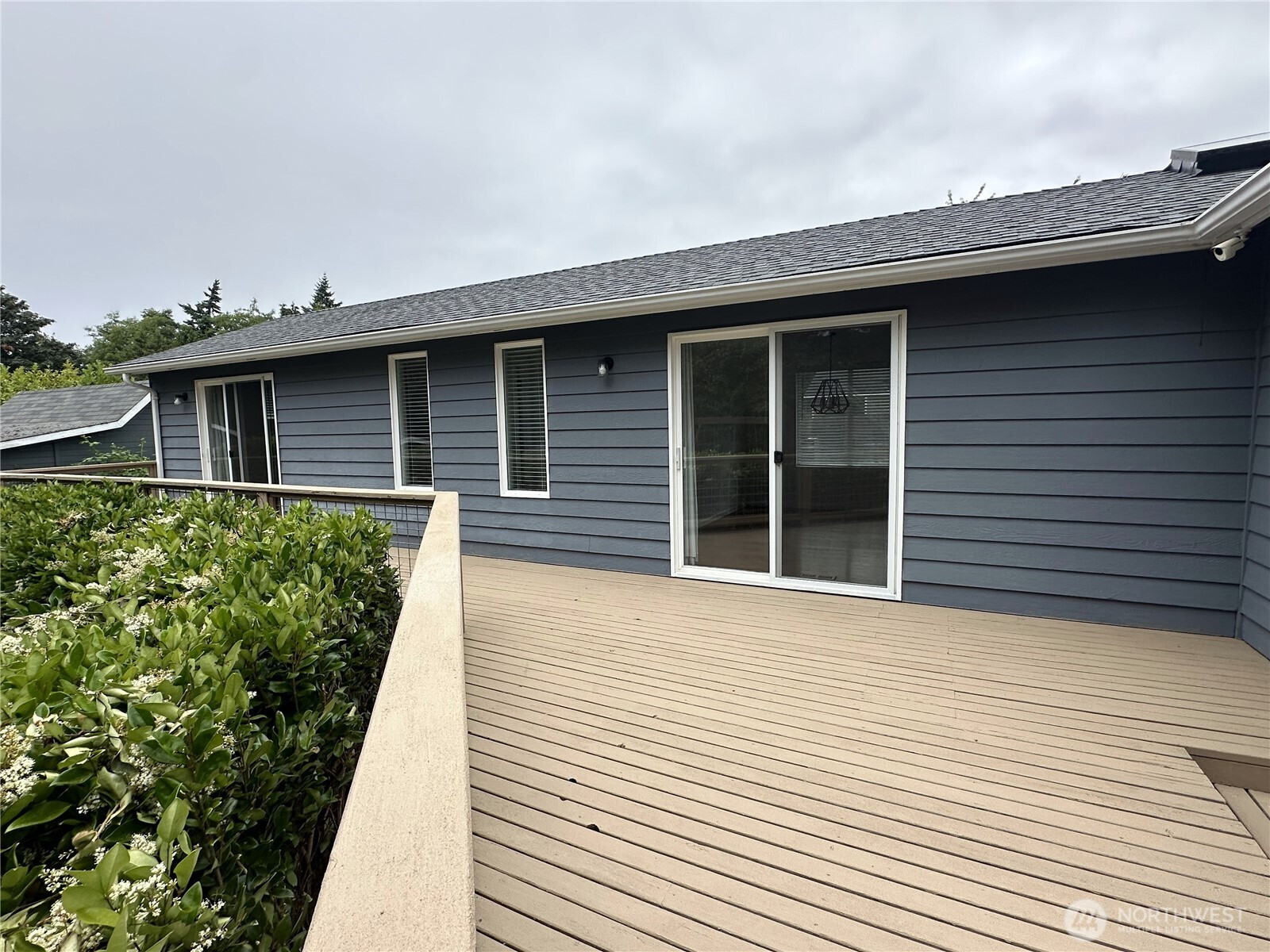 A light filled house that is spacious and provides for privacy with the two bedrooms and bathrooms at opposite ends of the house. Sliding doors from the living room, dining room and master bedroom lead onto a large deck that spans the back yard and overlooks the garden and firepit area. The bathrooms and kitchen have all been stylishly updated. The master bedroom has an en suite bathroom and a walk in closet. As part of the Admiral's Cove community, you will have access to the beach, pool, clubhouse and playground. The one side of the front entry porch is a gate, so a ramp could be built to allow disabled access. Most of the interior of the house is on one level, but there is a step down into the living room.