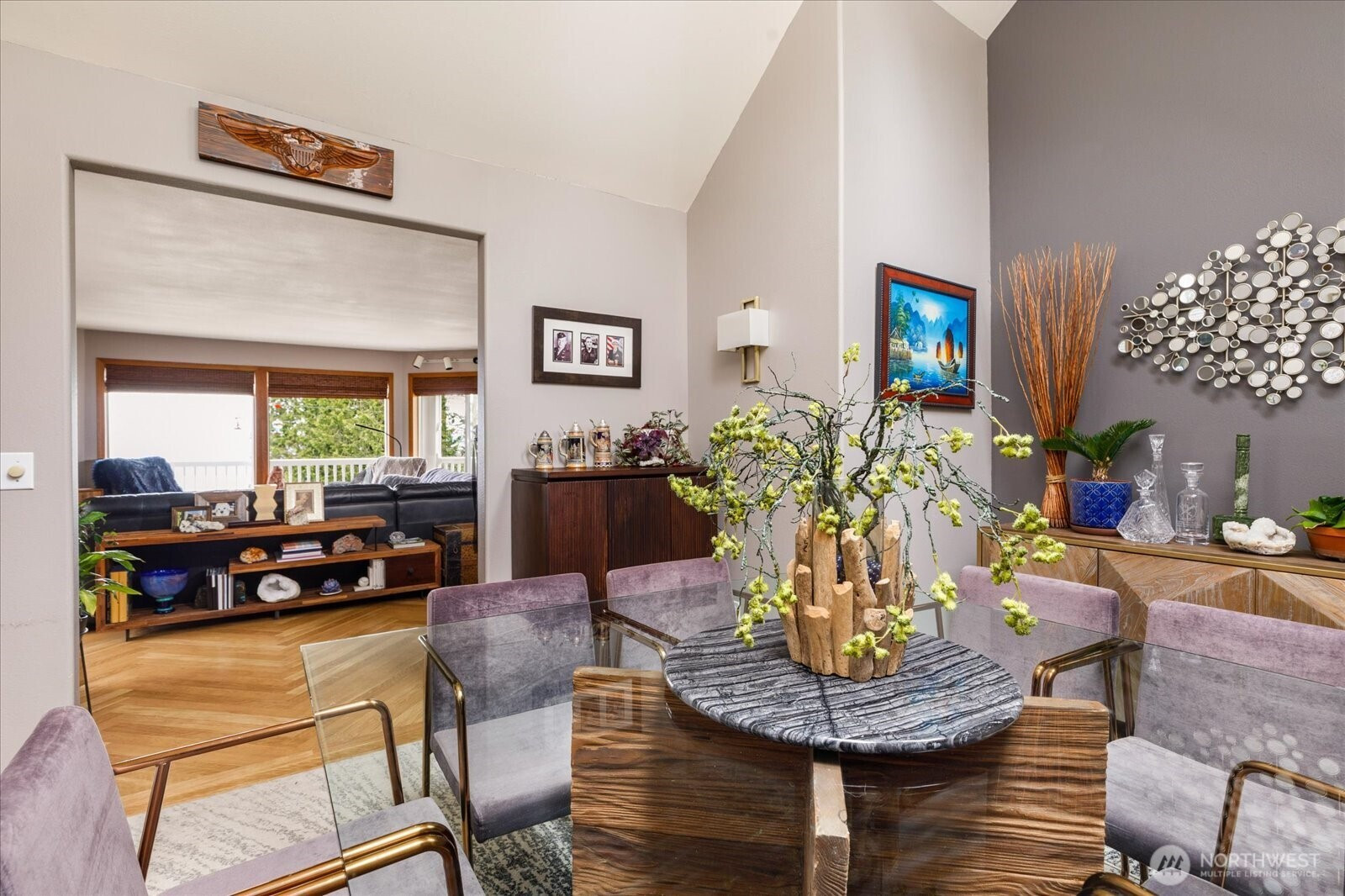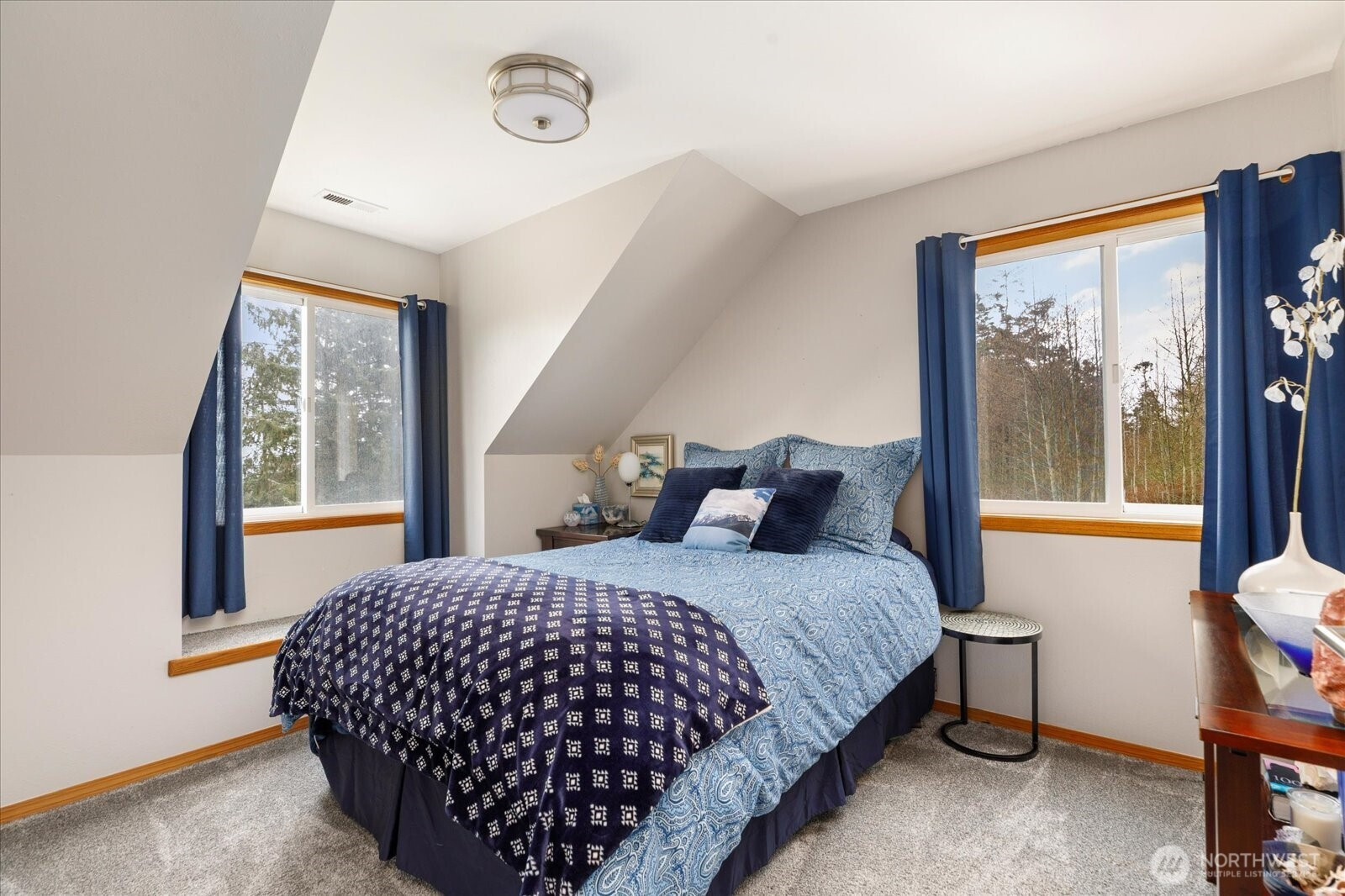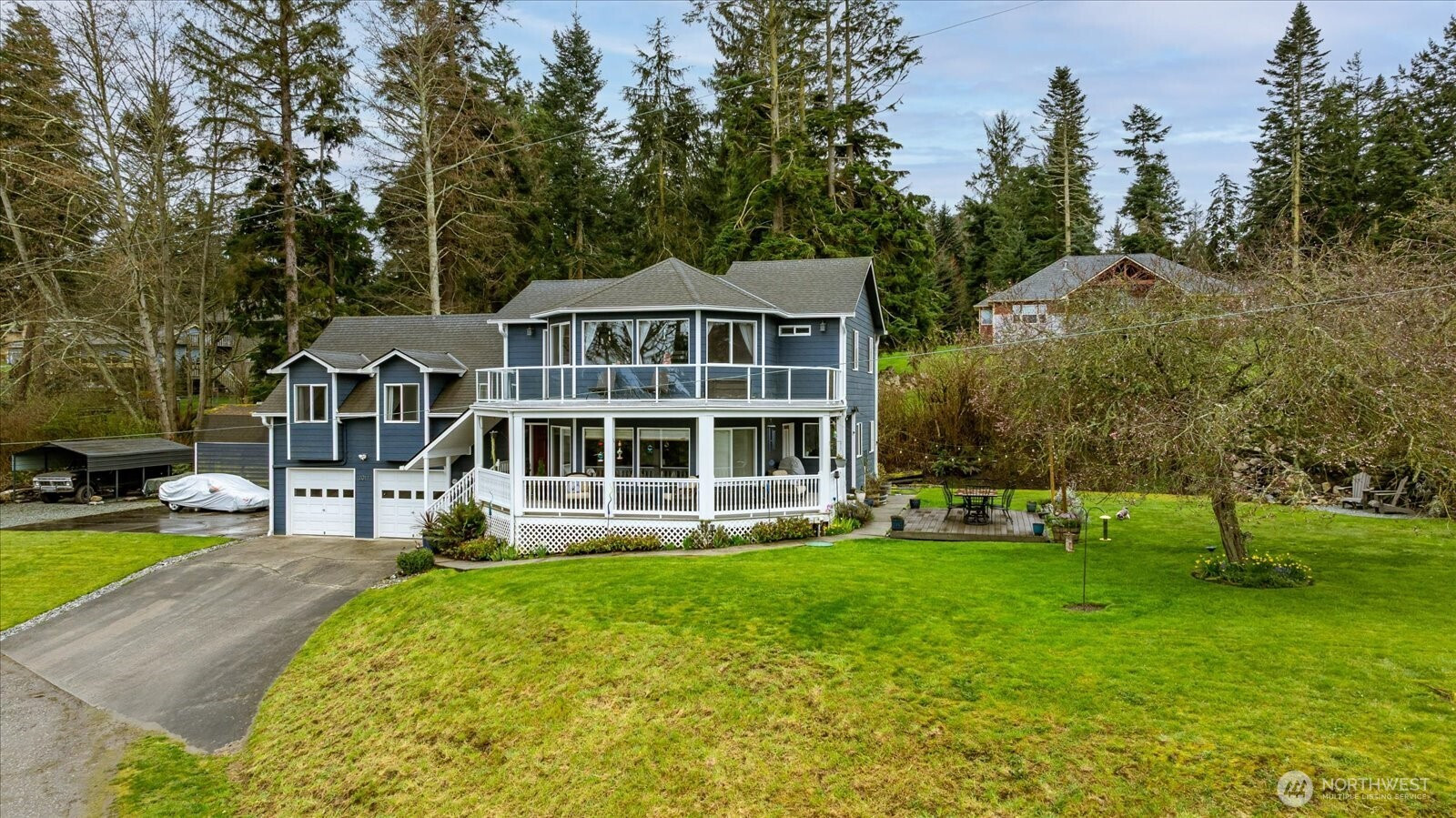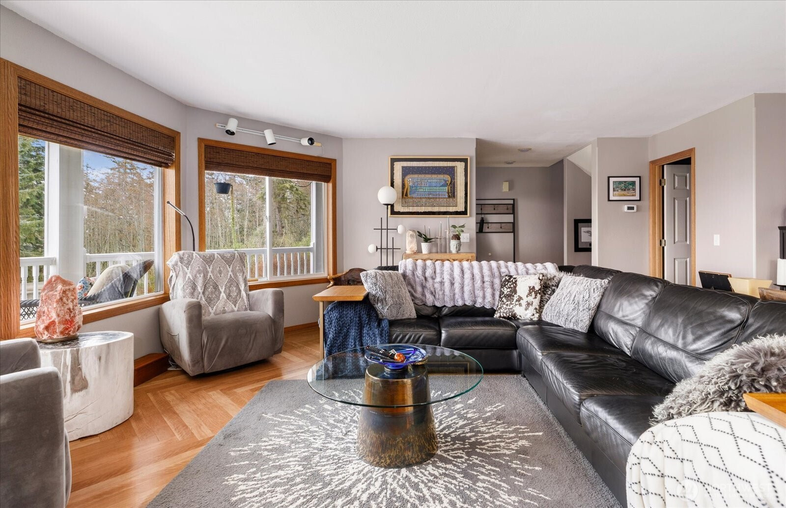 Enjoy sweeping views of Puget Sound, the San Juan Islands, and beyond from the spacious primary suite, complete with a private deck perfect for taking in stunning summer sunsets. This well-designed home offers multiple living spaces, including a mid-level family room with a pellet stove, two bedrooms, den, office, full bath, and convenient laundry room. The main level features a large eat-in kitchen, formal dining room with skylights and vaulted ceilings, and a bright living room filled with natural light and panoramic views. Thoughtfully updated throughout, including a newer roof, rebuilt upper deck with aluminum and glass railing, updated kitchen with granite countertops, custom backsplash, raised ceiling with LED lighting, and stainless steel appliances. Primary bathroom renovation and additional closet added. Additional upgrades include a whole-house water filtration system, French drain, LeafGuard gutters, newer flooring, interior paint, and updated shop space. Lower level includes a garage and separate shop for ample storage, hobbies, or parking. A rare opportunity to own a view home one block from the beach, with neighboring land trust with trails and a home with extensive upgrades in a sought-after location.