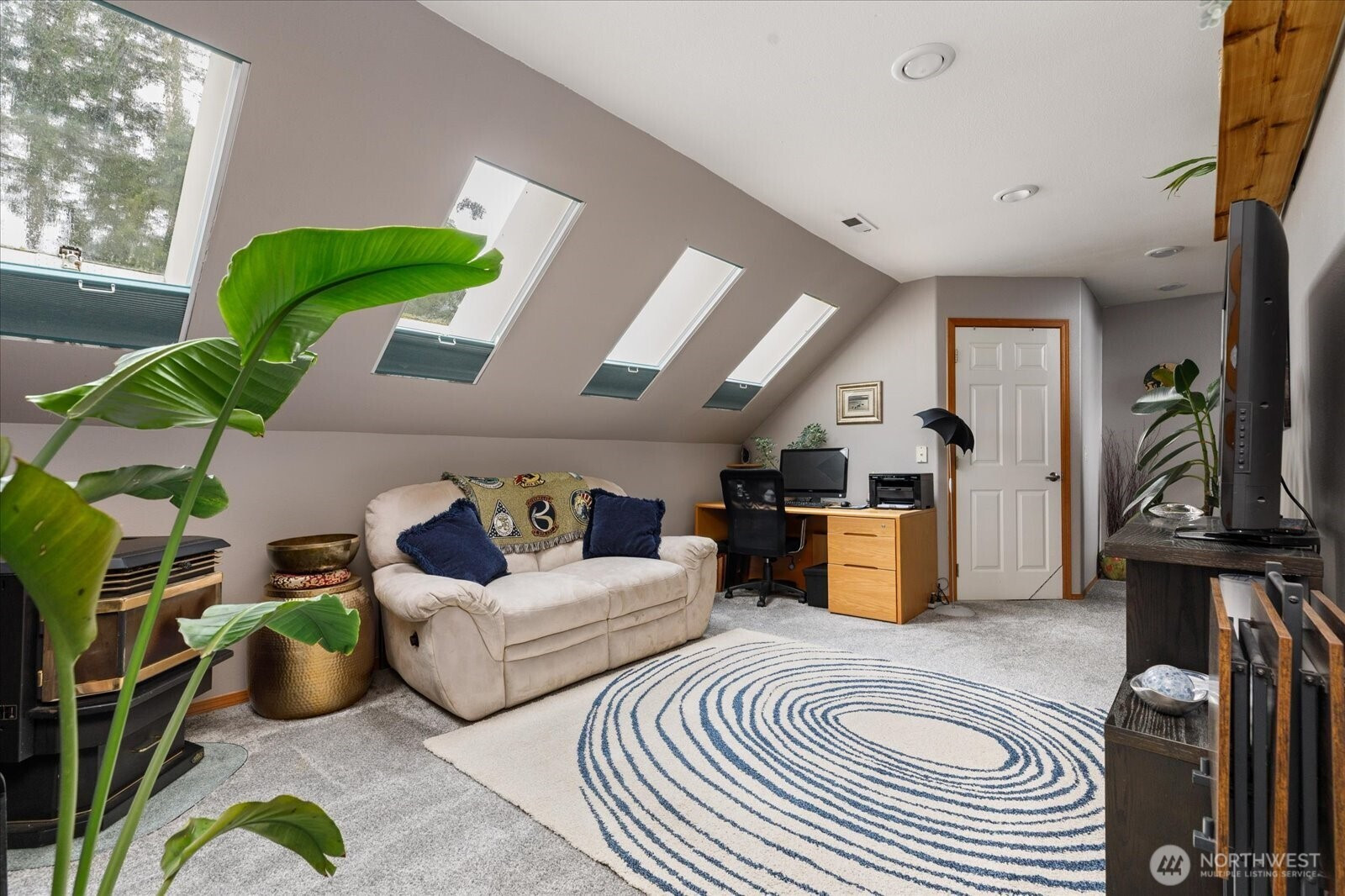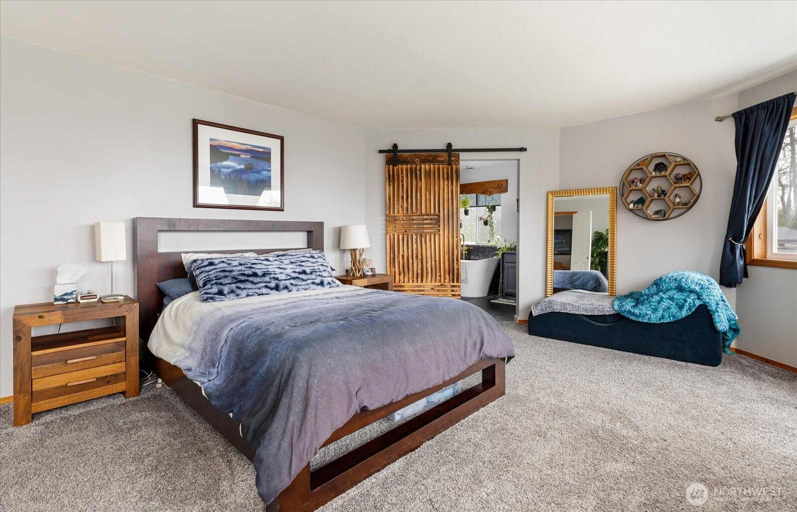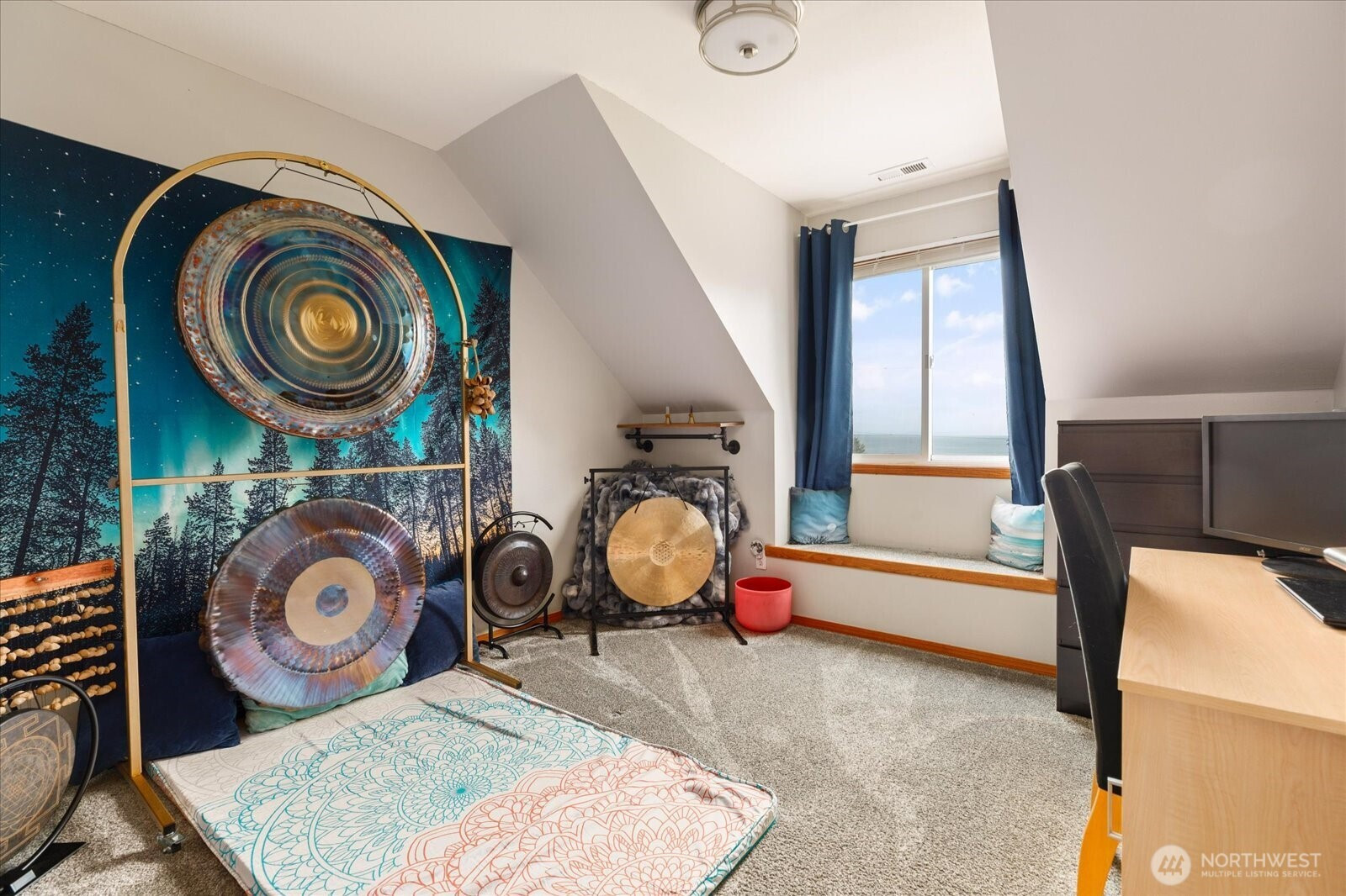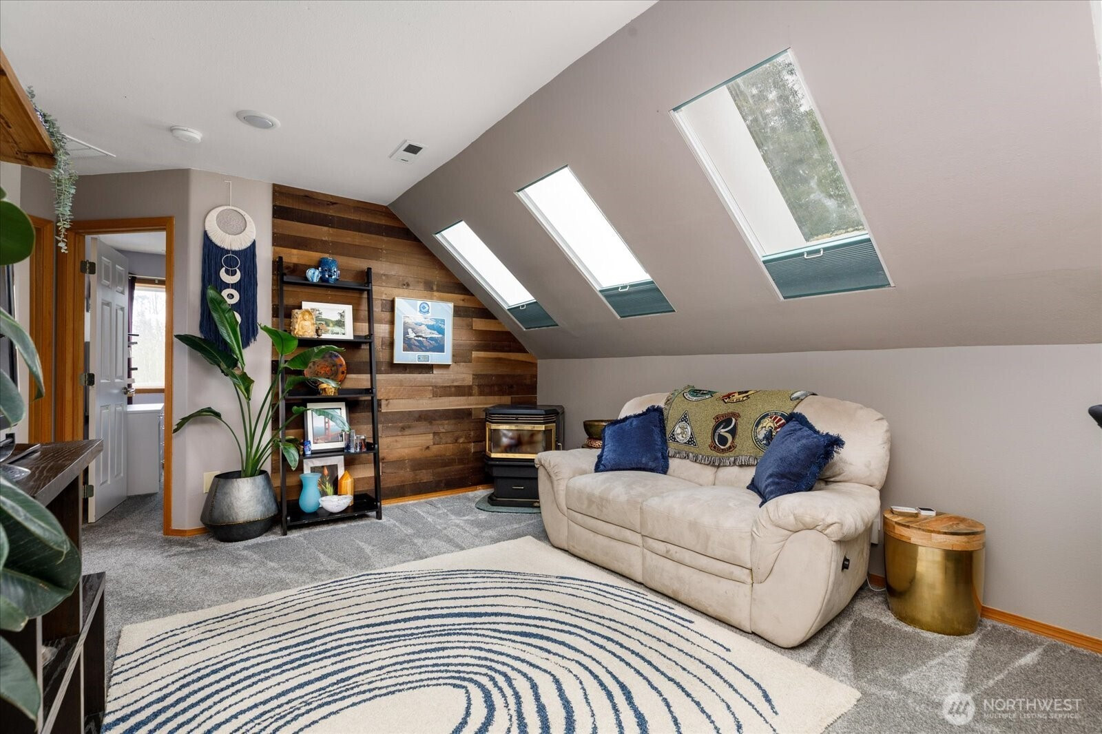 Enjoy sweeping views of Puget Sound, the San Juan Islands, and beyond from the spacious primary suite, complete with a private deck perfect for taking in stunning summer sunsets. This well-designed home offers multiple living spaces, including a mid-level family room with a pellet stove, two bedrooms, den, office, full bath, and convenient laundry room. The main level features a large eat-in kitchen, formal dining room with skylights and vaulted ceilings, and a bright living room filled with natural light and panoramic views. Thoughtfully updated throughout, including a newer roof, rebuilt upper deck with aluminum and glass railing, updated kitchen with granite countertops, custom backsplash, raised ceiling with LED lighting, and stainless steel appliances. Primary bathroom renovation and additional closet added. Additional upgrades include a whole-house water filtration system, French drain, LeafGuard gutters, newer flooring, interior paint, and updated shop space. Lower level includes a garage and separate shop for ample storage, hobbies, or parking. A rare opportunity to own a view home one block from the beach, with neighboring land trust with trails and a home with extensive upgrades in a sought-after location.