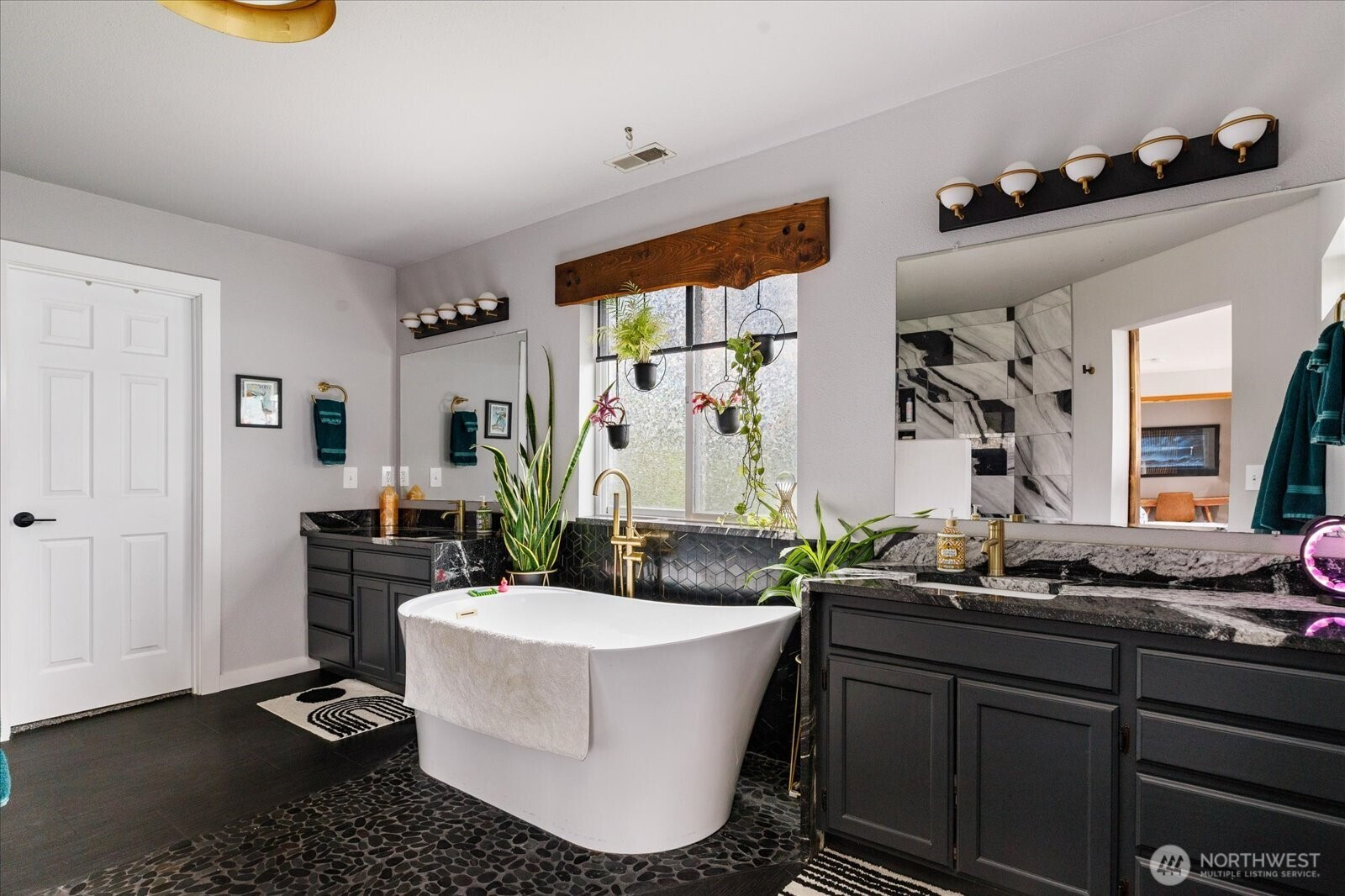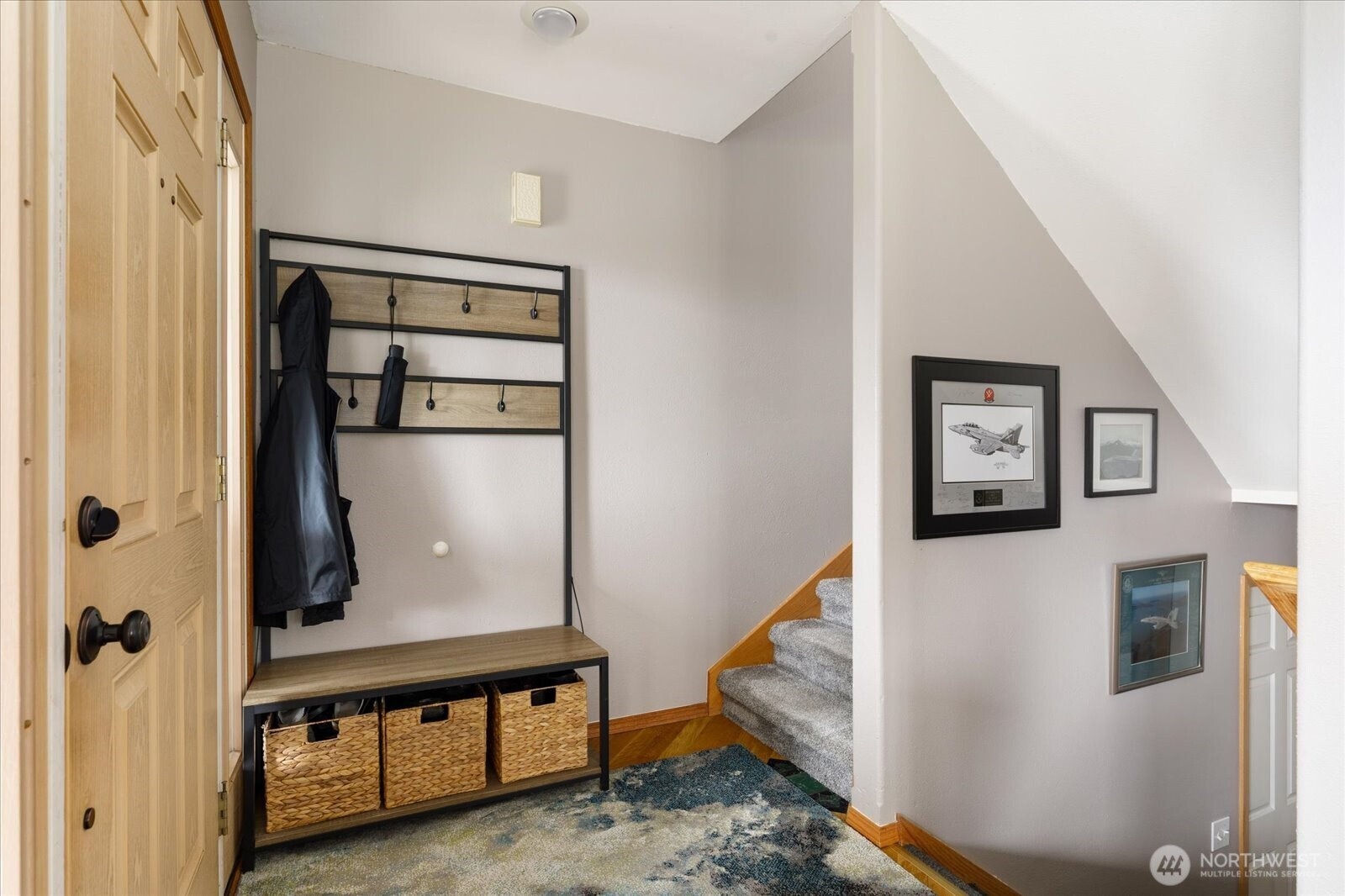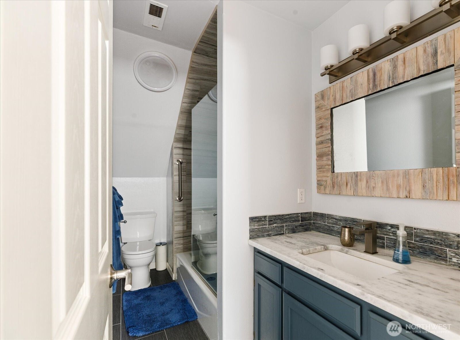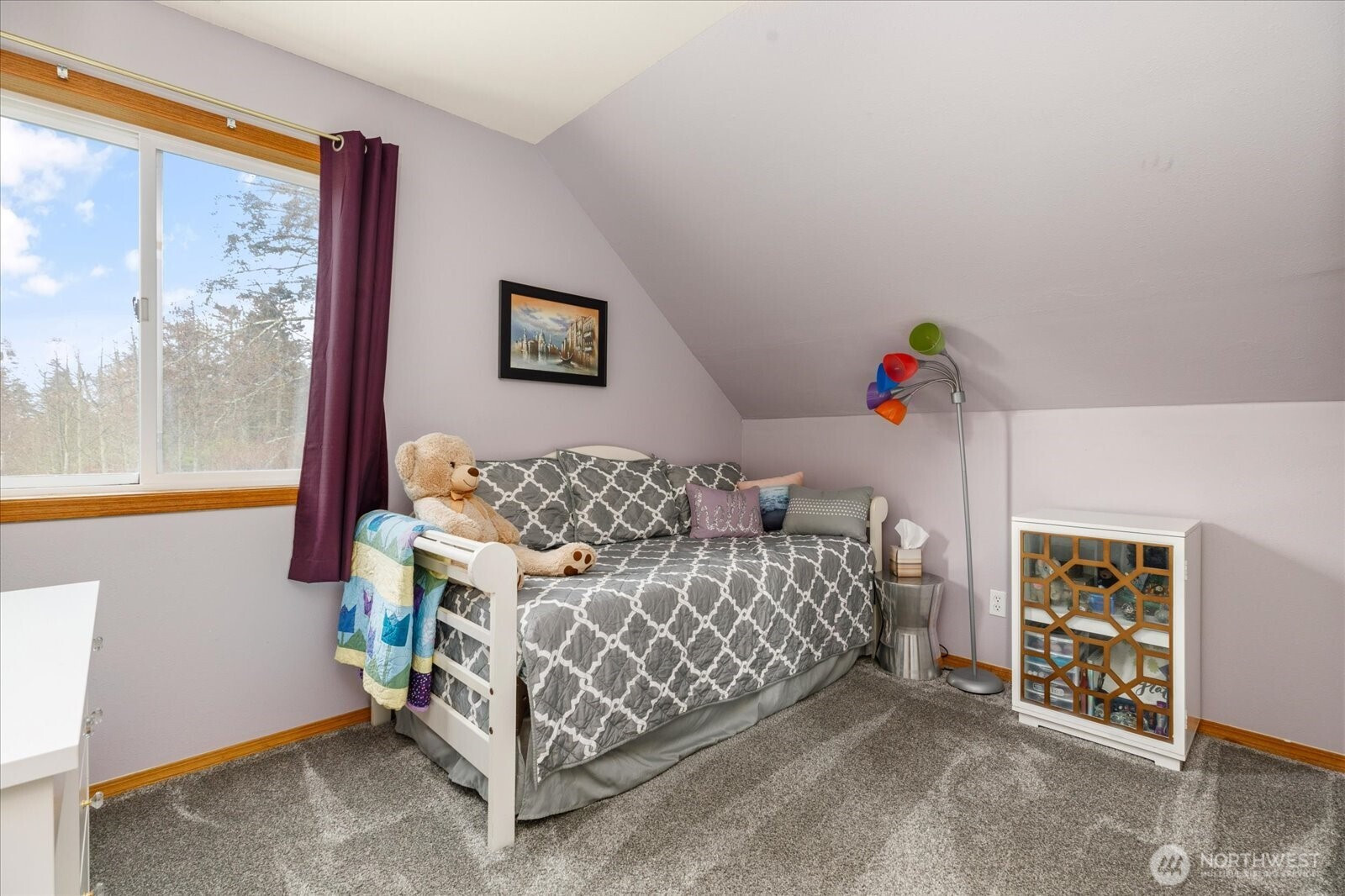 Enjoy sweeping views of Puget Sound, the San Juan Islands, and beyond from the spacious primary suite, complete with a private deck perfect for taking in stunning summer sunsets. This well-designed home offers multiple living spaces, including a mid-level family room with a pellet stove, two bedrooms, den, office, full bath, and convenient laundry room. The main level features a large eat-in kitchen, formal dining room with skylights and vaulted ceilings, and a bright living room filled with natural light and panoramic views. Thoughtfully updated throughout, including a newer roof, rebuilt upper deck with aluminum and glass railing, updated kitchen with granite countertops, custom backsplash, raised ceiling with LED lighting, and stainless steel appliances. Primary bathroom renovation and additional closet added. Additional upgrades include a whole-house water filtration system, French drain, LeafGuard gutters, newer flooring, interior paint, and updated shop space. Lower level includes a garage and separate shop for ample storage, hobbies, or parking. A rare opportunity to own a view home one block from the beach, with neighboring land trust with trails and a home with extensive upgrades in a sought-after location.