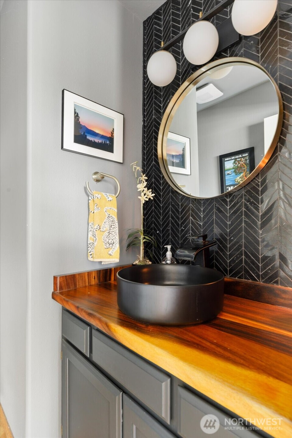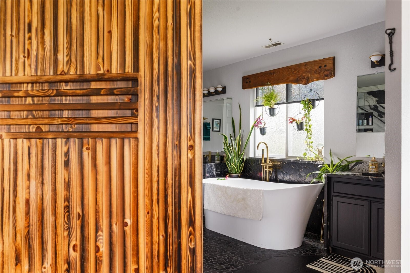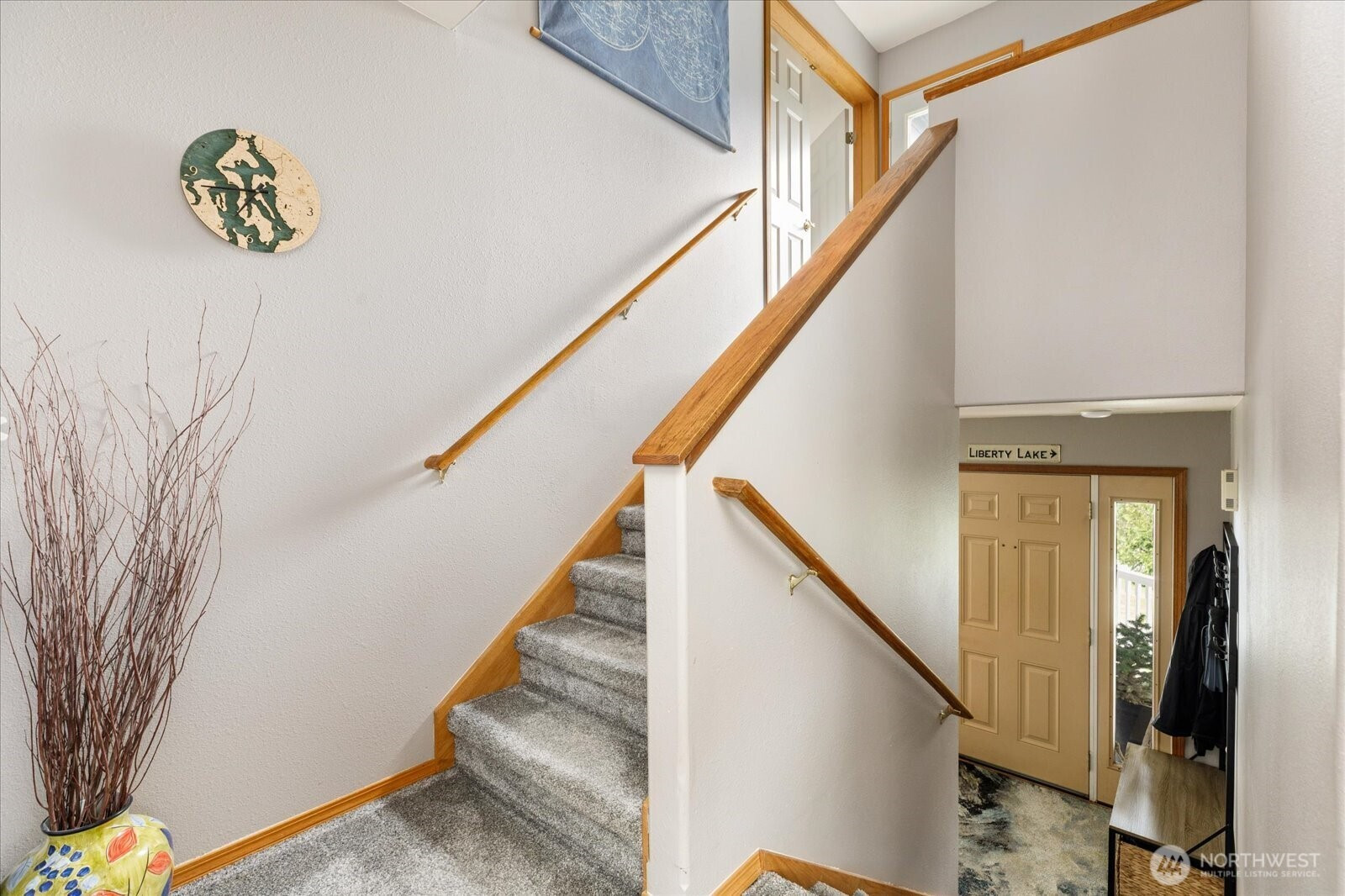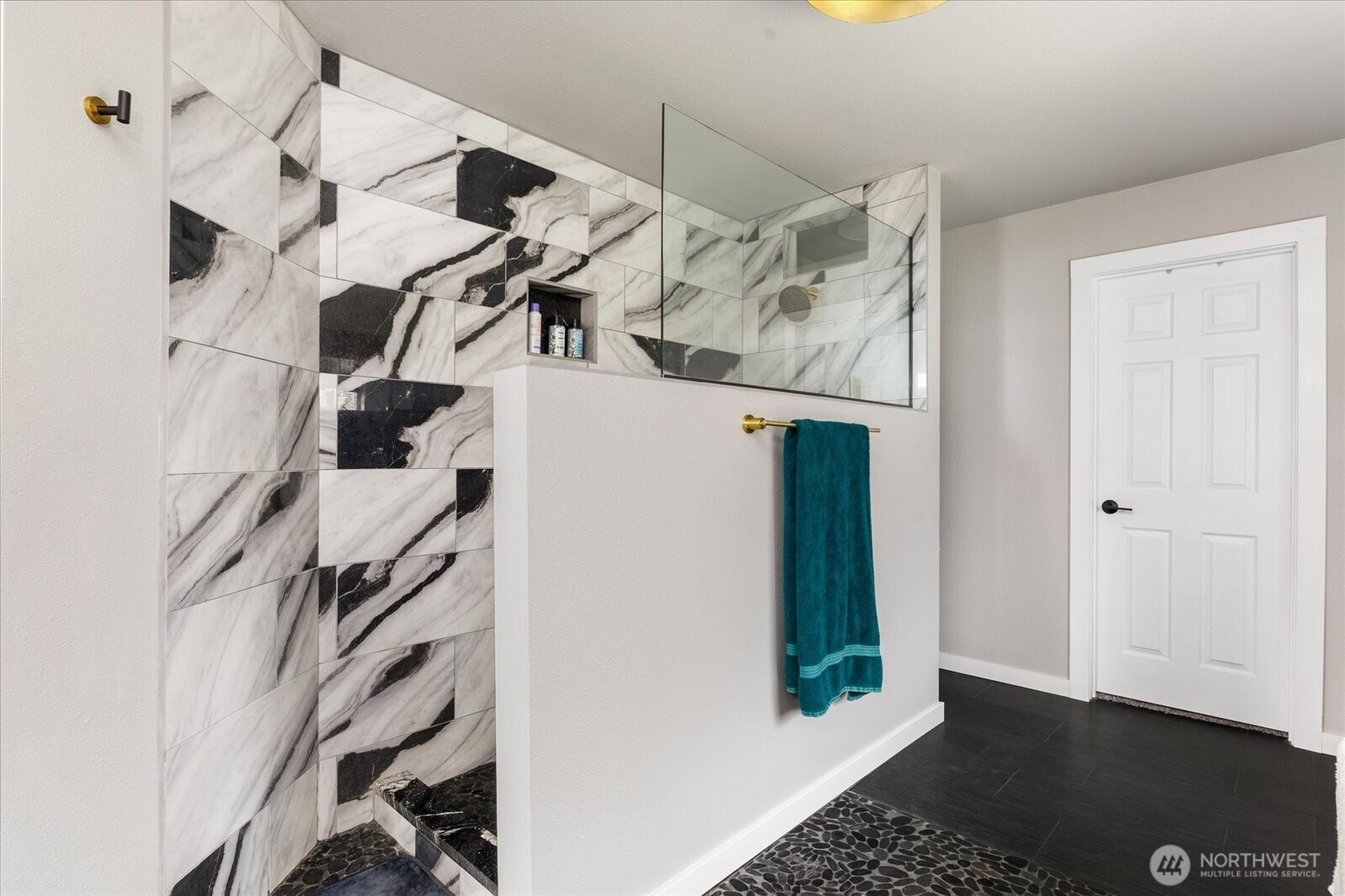Enjoy sweeping views of Puget Sound, the San Juan Islands, and beyond from the spacious primary suite, complete with a private deck perfect for taking in stunning summer sunsets. This well-designed home offers multiple living spaces, including a mid-level family room with a pellet stove, two bedrooms, den, office, full bath, and convenient laundry room. The main level features a large eat-in kitchen, formal dining room with skylights and vaulted ceilings, and a bright living room filled with natural light and panoramic views. Thoughtfully updated throughout, including a newer roof, rebuilt upper deck with aluminum and glass railing, updated kitchen with granite countertops, custom backsplash, raised ceiling with LED lighting, and stainless steel appliances. Primary bathroom renovation and additional closet added. Additional upgrades include a whole-house water filtration system, French drain, LeafGuard gutters, newer flooring, interior paint, and updated shop space. Lower level includes a garage and separate shop for ample storage, hobbies, or parking. A rare opportunity to own a view home one block from the beach, with neighboring land trust with trails and a home with extensive upgrades in a sought-after location.