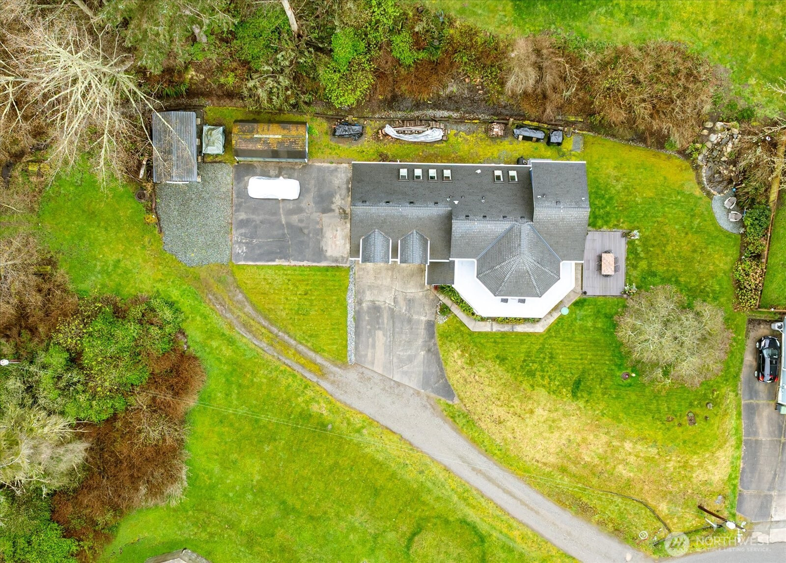 Enjoy sweeping views of Puget Sound and the San Juan Islands from the spacious primary suite with a private deck—perfect for year-round sunsets. This well-designed home offers multiple living spaces, including a mid-level family room with a pellet stove, 2 bedrooms, a den, an office, a full bath, and a convenient laundry. The main level features a large eat-in kitchen, formal dining with skylights and vaulted ceilings, and a bright living room filled with natural light and panoramic views. Thoughtfully updated throughout with a newer roof, rebuilt upper deck with aluminum/glass railing, updated kitchen with granite counters, custom backsplash, raised ceiling with LED lighting, and stainless steel appliances. Renovated the primary bath, plus added a walk-in closet. Additional upgrades include whole-house water filtration, french drain, LeafGuard gutters, newer flooring, interior paint, and updated shop space. The lower level includes a garage, ample storage, and a shop area. Rare opportunity just one block from the beach with nearby trails—walk to the beach in minutes in a sought-after location.