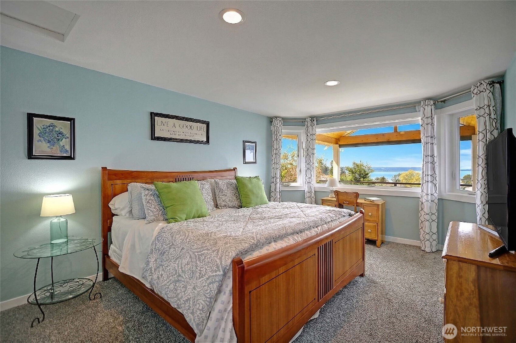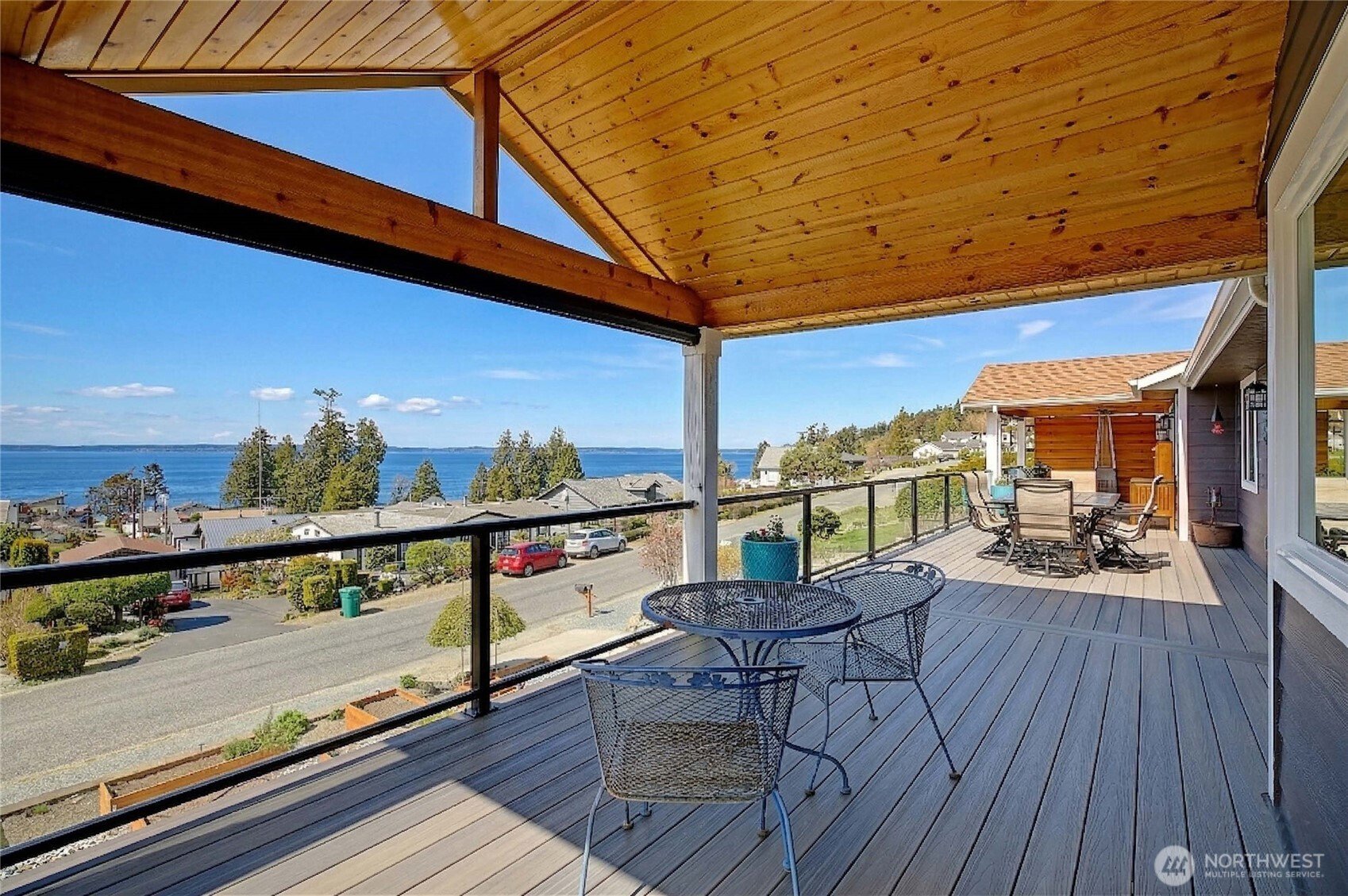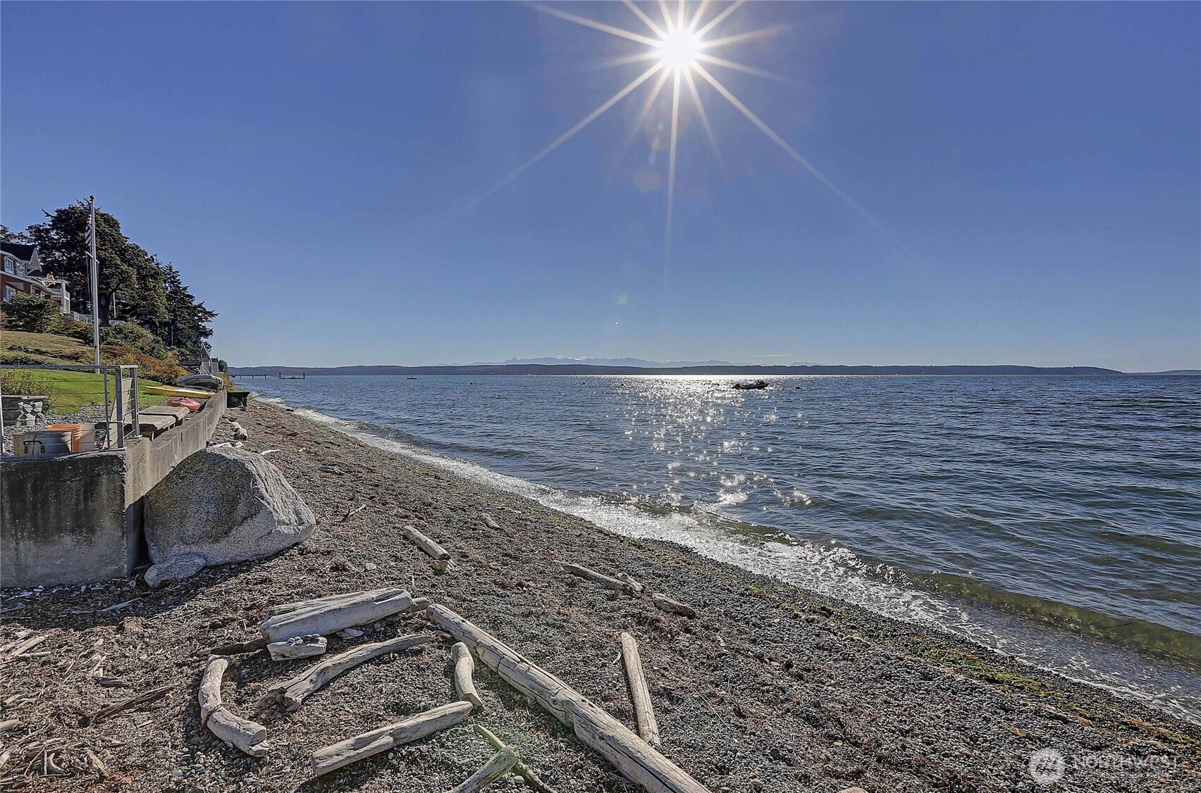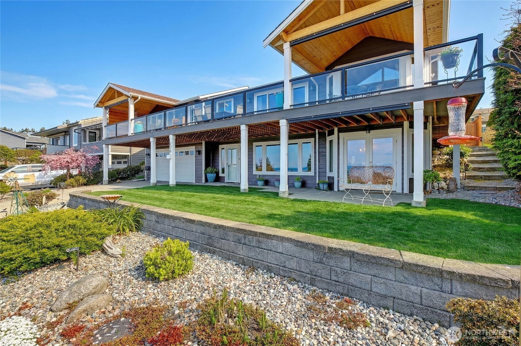Luxurious Madrona Beach home with exclusive beach rights & gorgeous Westside views from every room, including a full-length upper deck to enjoy the beauty of Puget Sound! Expertly designed, this home exudes quality: Chef's kitchen crafted w custom cabinets, featuring deep drawers for convenient access, stainless appliances, an open layout flowing to dining, living room, patio, custom millwork, guest bath, engineered hardwood floors & Milgard windows! The upper level awaits w stunning views, including a great room for entertaining & relaxation, opening to an expansive deck, well-appointed office that could easily double as a guest room w a Murphy bed, bonus storage & two spacious primary suites. Main primary delights w water view & sliding doors to deck, plush carpet, walk-in closet & a lavish ensuite complete w heated floors, granite counters, linen storage & deluxe, frameless, dual-end rainshower equipped w multiple jets & fixtures! The second primary provides an oasis for your guests to relax with a view, attached bath w heated floors, elegant shower, granite counters, & spacious closet. Outdoor features: easy-care landscaping, raised garden beds, fenced backyard w privacy fence, solar lighting, fruit trees, manicured level yard, generator pad w hard-wiring, plenty of room to park your boat or RV, attached 2-car garage w storage cabinets. No HOA's! This quiet, friendly neighborhood is one of Camano's finest gems w private beach & yacht club just blocks away. Welcome Home!