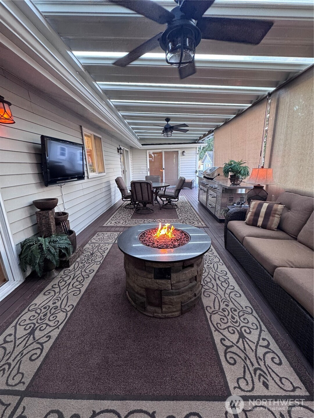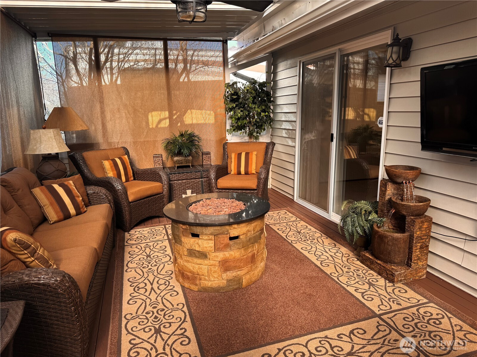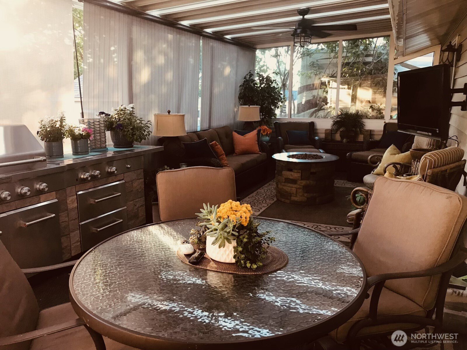 Welcome to this single story home located in of Camano's most sought-after gated communities where you can enjoy year round golf, 2 seasonal swimming pools, clubhouse and community lake. This bright, spacious home features a large primary bedroom with 2 closets and 3/4 bathroom with sliding door to deck on 1 side of home and a second bedroom, full bathroom and a office/den with sliding door to deck on the other side. The updated kitchen offers newer stainless steel appliances and quartz countertops. The dining room, off of kitchen, was designed to accommodate a large china hutch and table for seating 8-10 people. Living room features a natural gas stove that heats the home. Additional features include a 400 sq ft covered and partially glassed deck with TV for "all seasons" entertaining. Fully fenced sunny backyard with 2 Yardline 10 x 12 storage sheds. Beautifully landscaped with privacy ~ raised garden beds ~ Jacuzzi Hot Tub off deck and an Almost Heaven 4 person barrel sauna in yard. Large RV parking with electric hookup along 1 side of home and other side of home has gated driveway to golf cart shed. Home has an automatic battery backup system for power outages and is also wired for a generator with natural gas hookup. HOA dues includes 18 Hole Golf, 2 Pools, Private Lake and Community Clubhouse.