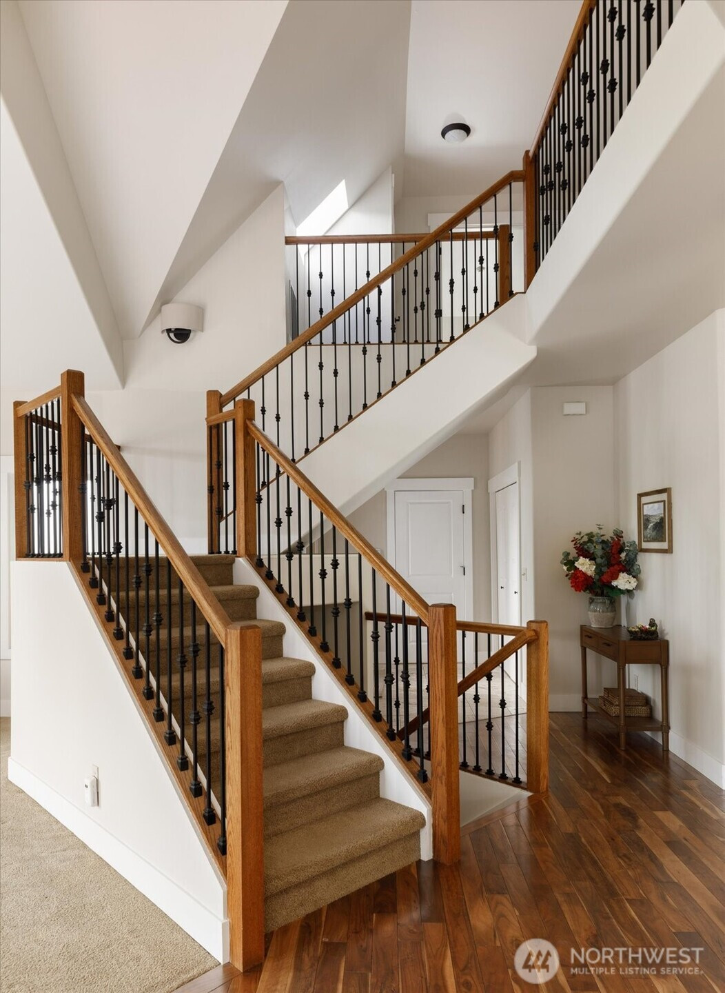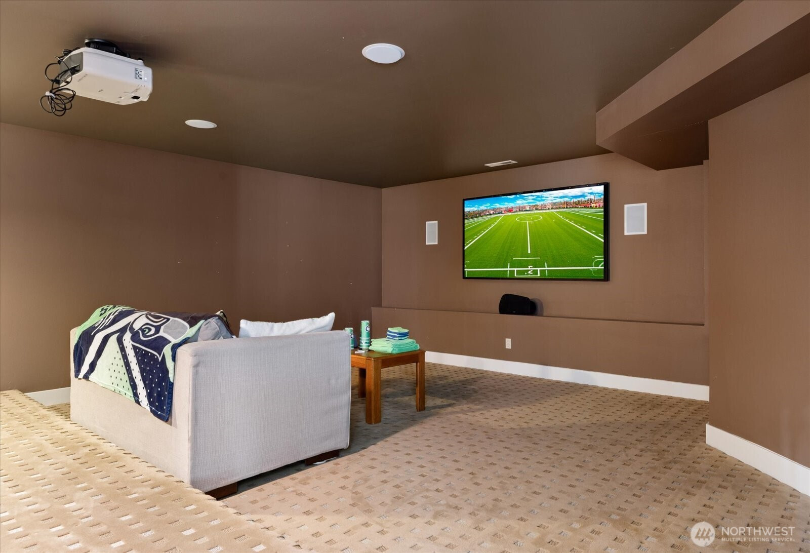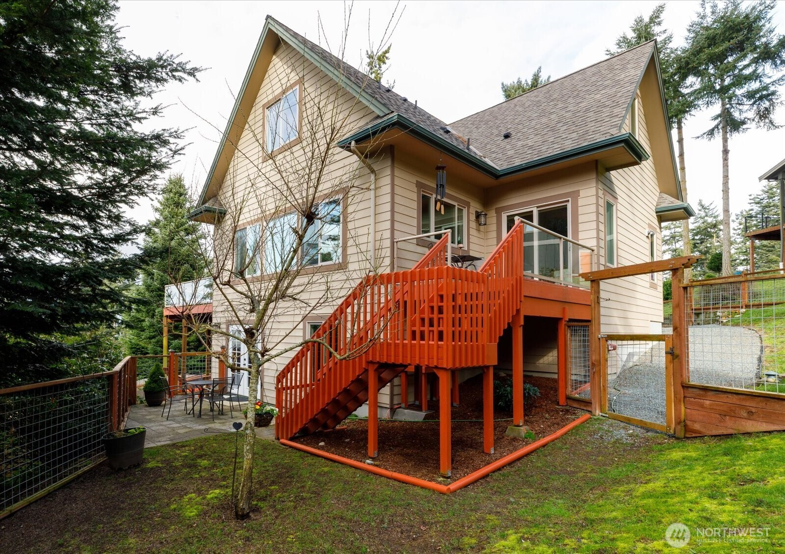 Northwest Contemporary design meets French Country charm in this light-filled freshly painted Whidbey Island home with views of Long Point and across Penn Cove.Expansive windows and soaring ceilings create an open, airy feel, while solid cherry hardwood floors and a marble entry add warmth and refinement. The main-floor primary suite offers convenience and privacy,with a spacious layout and elegant finishes.The kitchen is designed for both everyday living and entertaining, featuring abundant cabinetry, generous counter space, and a large island for gathering.A spacious family room with wet bar and dedicated theater room provide flexible living options—ideal for hosting guests, movie nights, or multi-generational living. With a separate entrance, private patio, dedicated parking, and a fenced dog area, the lower level also offers strong potential for rental income or guest quarters.Outdoor living is just as inviting. A wraparound deck captures sweeping water views, perfect for morning coffee or evening sunsets. The terraced garden leads to a large, fully fenced backyard with room to play, garden, or relax.Public beach access is just down the road, offering miles of shoreline for walking and beach combing, and the historic waterfront shops and restaurants of Coupeville are only minutes away.Thoughtfully designed with both comfort and versatility in mind, this home offers refined finishes, functional spaces, exceptional indoor-outdoor living, and an unbeatable coastal location.