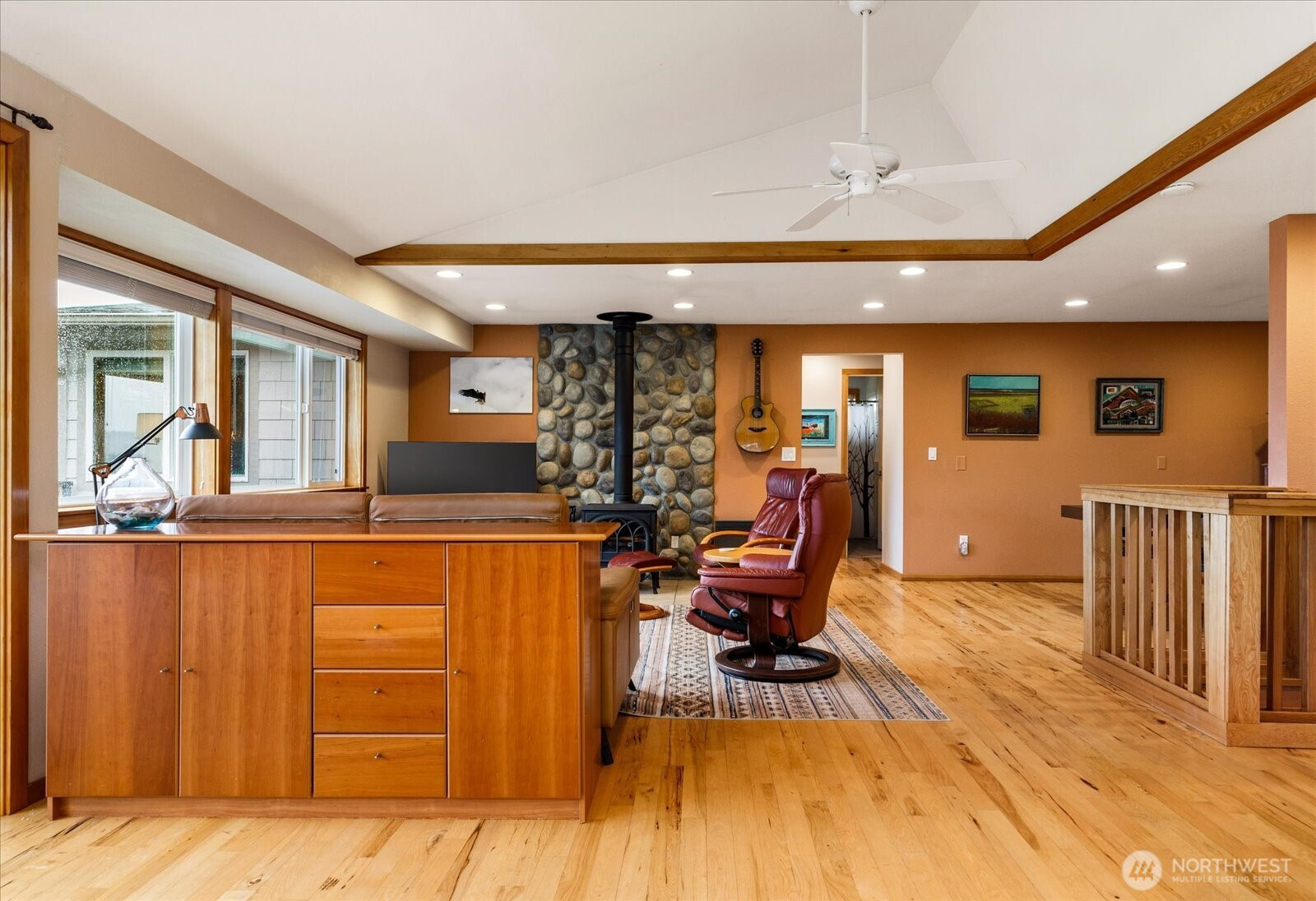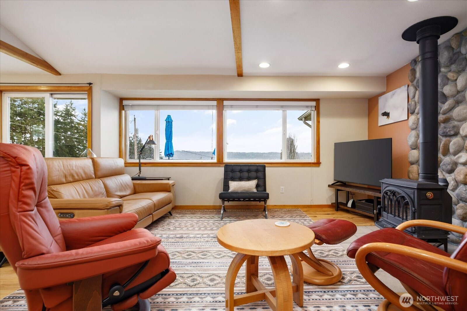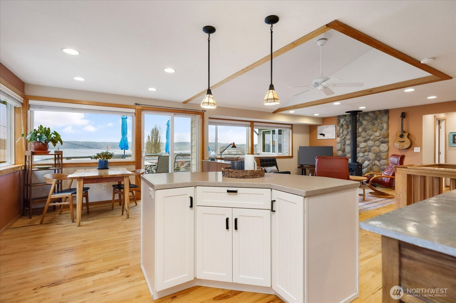 Enjoy sweeping westside views over sparkling Useless Bay, with the Olympic Mountains as your backdrop, windsurfers dancing across the water, and sunsets that never get old. This light-filled, this well maintained hardie-shingled home sits on a double lot with southwest-facing windows and decks designed to soak it all in. Cruise ships drifting by as the sky turns to gold. The welcoming main level features a stunning kitchen, modernized baths, and rich hickory hardwood floors, along with a main-floor primary suite for easy living. The bright, finished lower level offers incredible flexibility with LPV floors, a wet bar, bath, laundry, and ready for guests, entertaining, or your own custom touch. Community amenities include beach access, pool, clubhouse, and tidelands, adding to the ease of island living. This is Whidbey at its best relaxed, scenic, and ready to be enjoyed from your favorite deck chair.