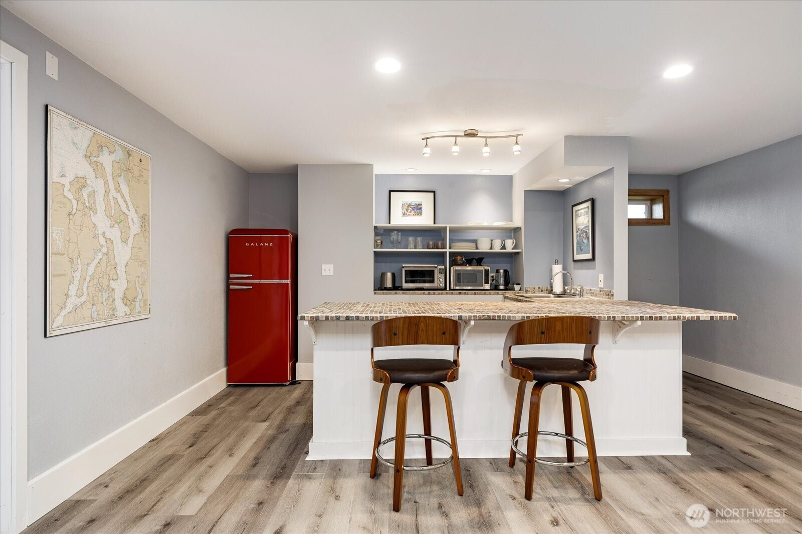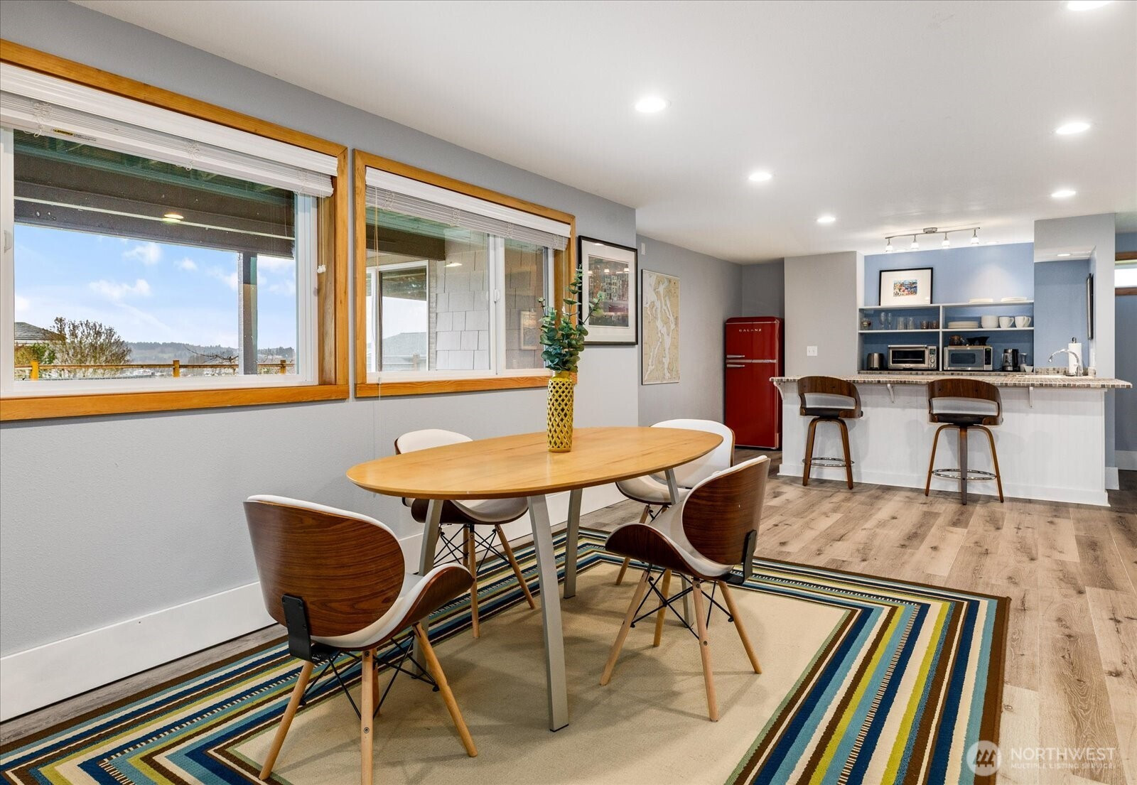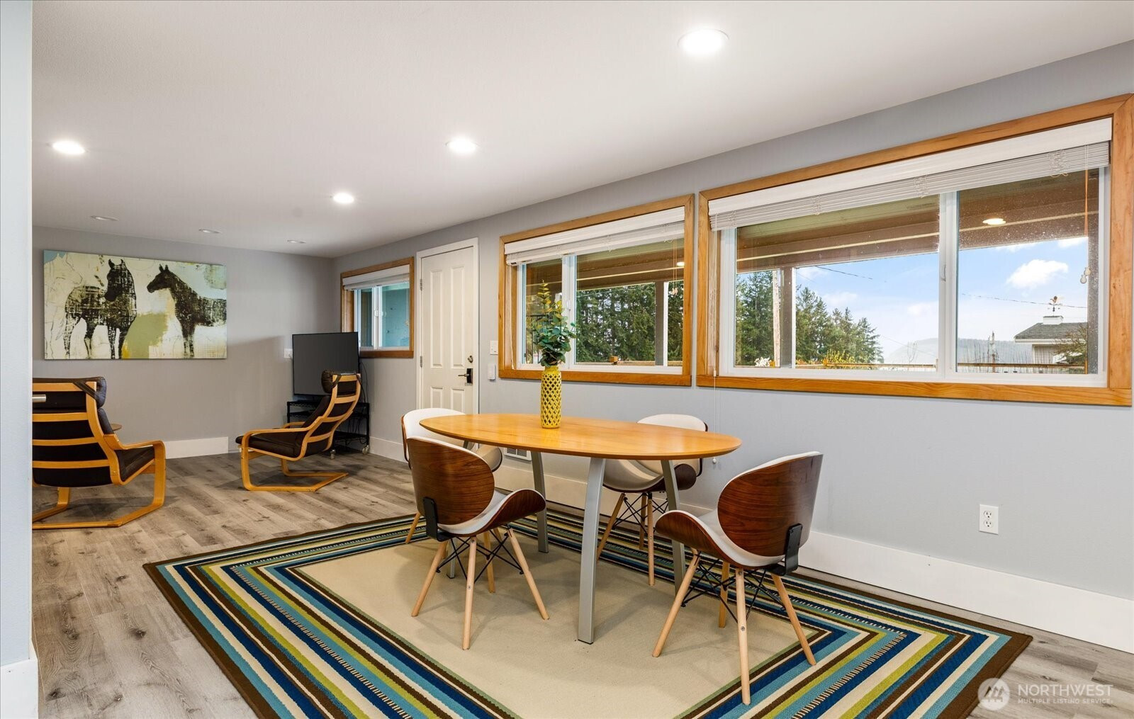 Enjoy sweeping westside views over sparkling Useless Bay, with the Olympic Mountains as your backdrop, windsurfers dancing across the water, and sunsets that never get old. This light-filled, this well maintained hardie-shingled home sits on a double lot with southwest-facing windows and decks designed to soak it all in. Cruise ships drifting by as the sky turns to gold. The welcoming main level features a stunning kitchen, modernized baths, and rich hickory hardwood floors, along with a main-floor primary suite for easy living. The bright, finished lower level offers incredible flexibility with LPV floors, a wet bar, bath, laundry, and ready for guests, entertaining, or your own custom touch. Community amenities include beach access, pool, clubhouse, and tidelands, adding to the ease of island living. This is Whidbey at its best relaxed, scenic, and ready to be enjoyed from your favorite deck chair.