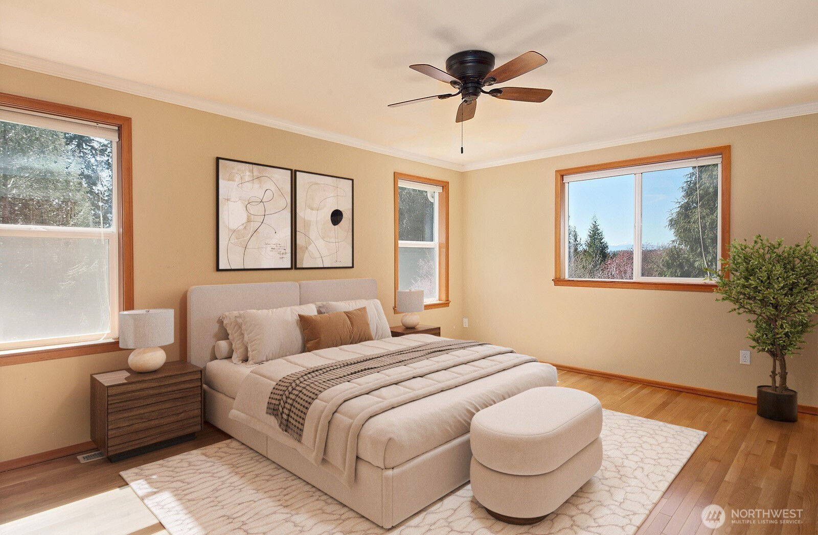 Nestled in Bayridge PRD, it is surrounded by approximately 35 acres of private, community open space and trails, just minutes from downtown Langley and within walking distance to Bayview restaurants and the garden center. The property offers a private setting on nearly an acre with south-facing exposure, a fully fenced private backyard, a deck, a dog run, an insulated 12x16 storage shed with cement siding, and a separate shed for your lawn equipment. This light and bright custom home welcomes you with fresh exterior paint and a new roof. Step through the front door and feel the openness of vaulted ceilings and newly resurfaced oak hardwood floors. Imagine morning light dancing across the updated kitchen, where quartz counters, sink, and a subway-porcelain tile surround make gatherings inviting. Picture moving seamlessly from the sun-lit kitchen alcove to the deck outside, ready for relaxing evenings or weekend barbecues as you take in the southwest sun. The main floor is spacious, featuring a home office just off the living room, while the family room flows to the outdoor deck and patio ideal for entertaining or unwinding. Upstairs, you'll find two primary suites, including the main primary, which has an updated bathroom. A versatile flex space waits for your vision, perfect as a recreation room or gym. The second primary suite includes two attached rooms, offering flexibility for guests, a nursery, or creative projects. A quick 10-minute commute to the ferry.
