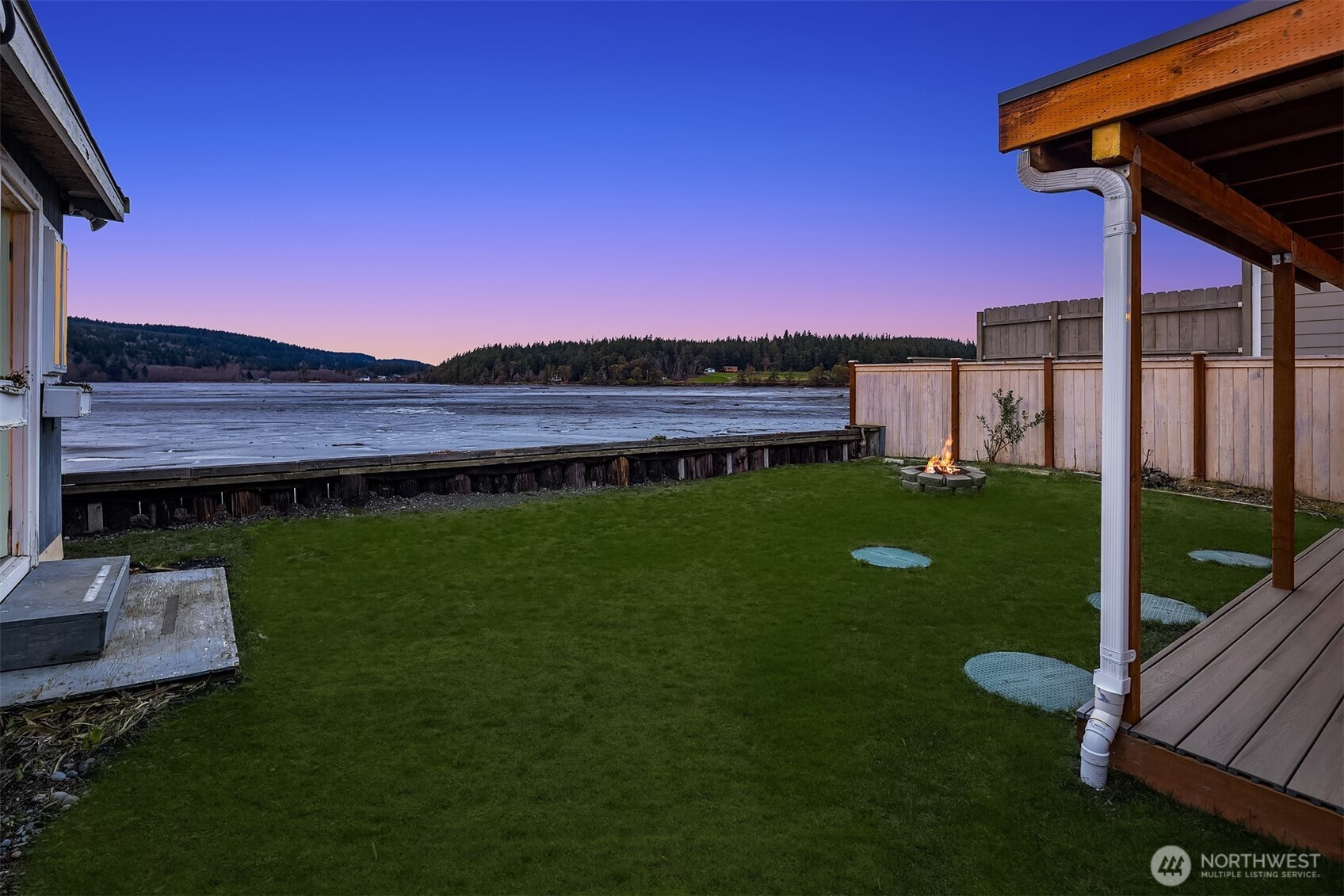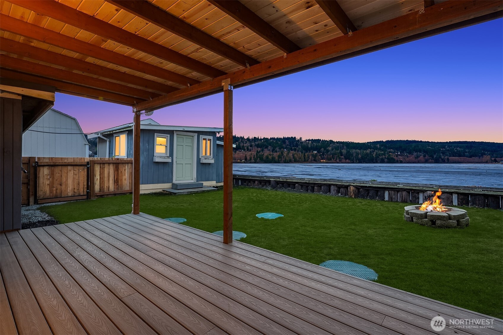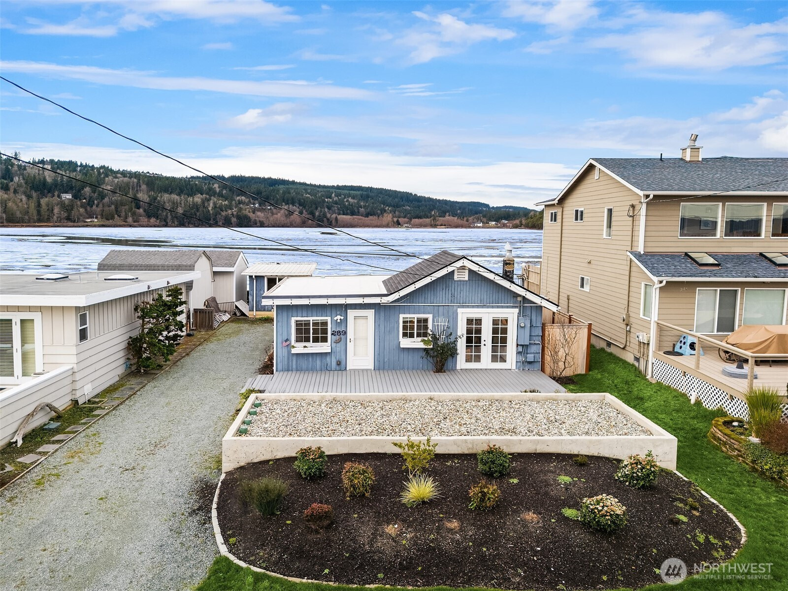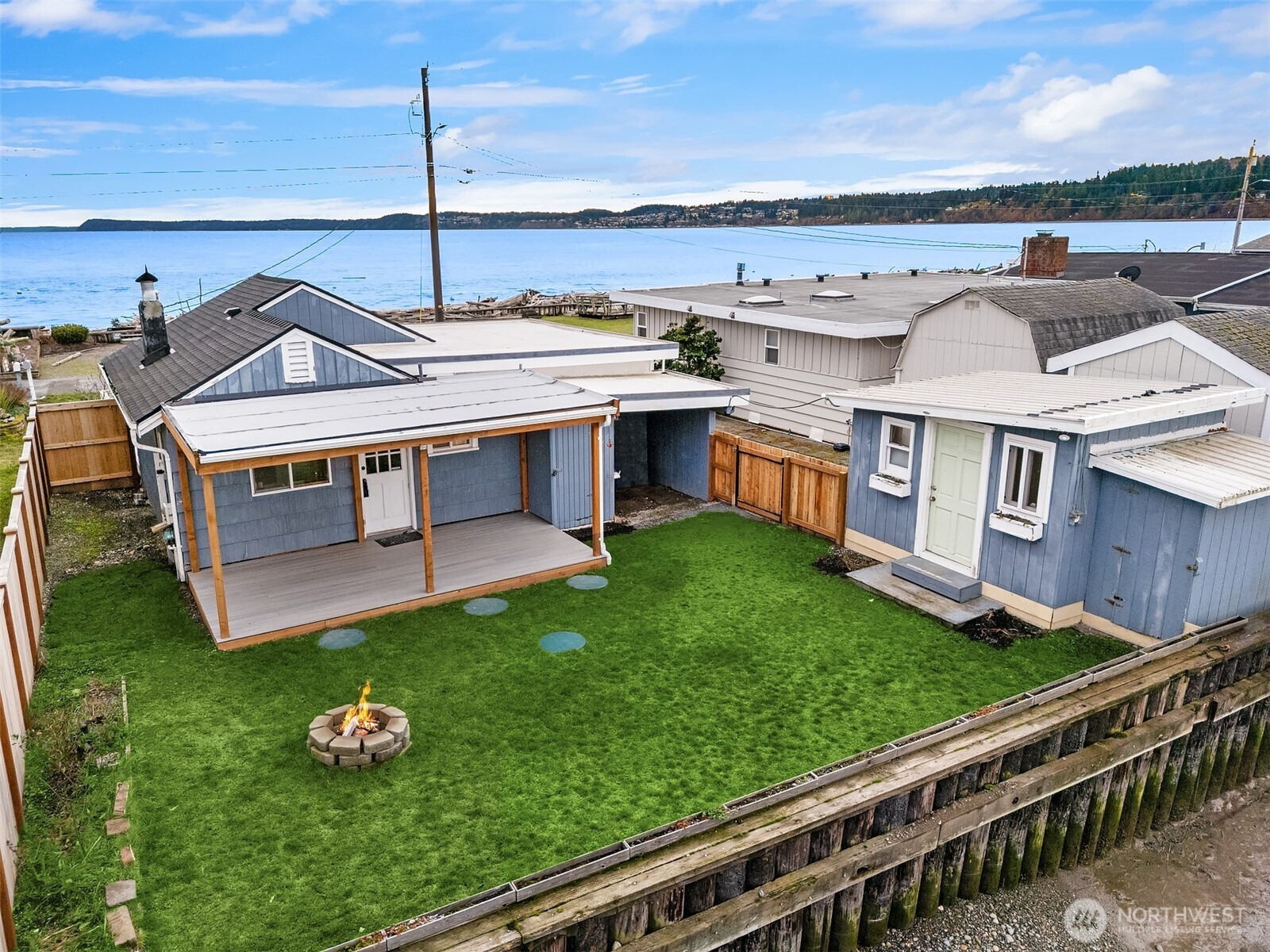 Escape to your own waterfront paradise, this charming cabin boasts rare level access to the shore. Captivating panoramic views of Port Susan, Barnum Point, and majestic Mt. Rainier await! Inside, enjoy cozy evenings by the wood-stove, a spacious walk-in closet, and French doors opening to a durable composite deck. A separate guest bungalow adds versatility for visitors or extra space. Stroll the private beach for treasure hunting and leisurely walks. This delightful cabin feels spacious and inviting—ideal as a peaceful weekend getaway, lucrative vacation rental, or year-round home in the desirable Driftwood Shores. Plus, over $20,000 of recent upgrades including the back deck, pergola, fencing, and a new septic system for peace of mind.