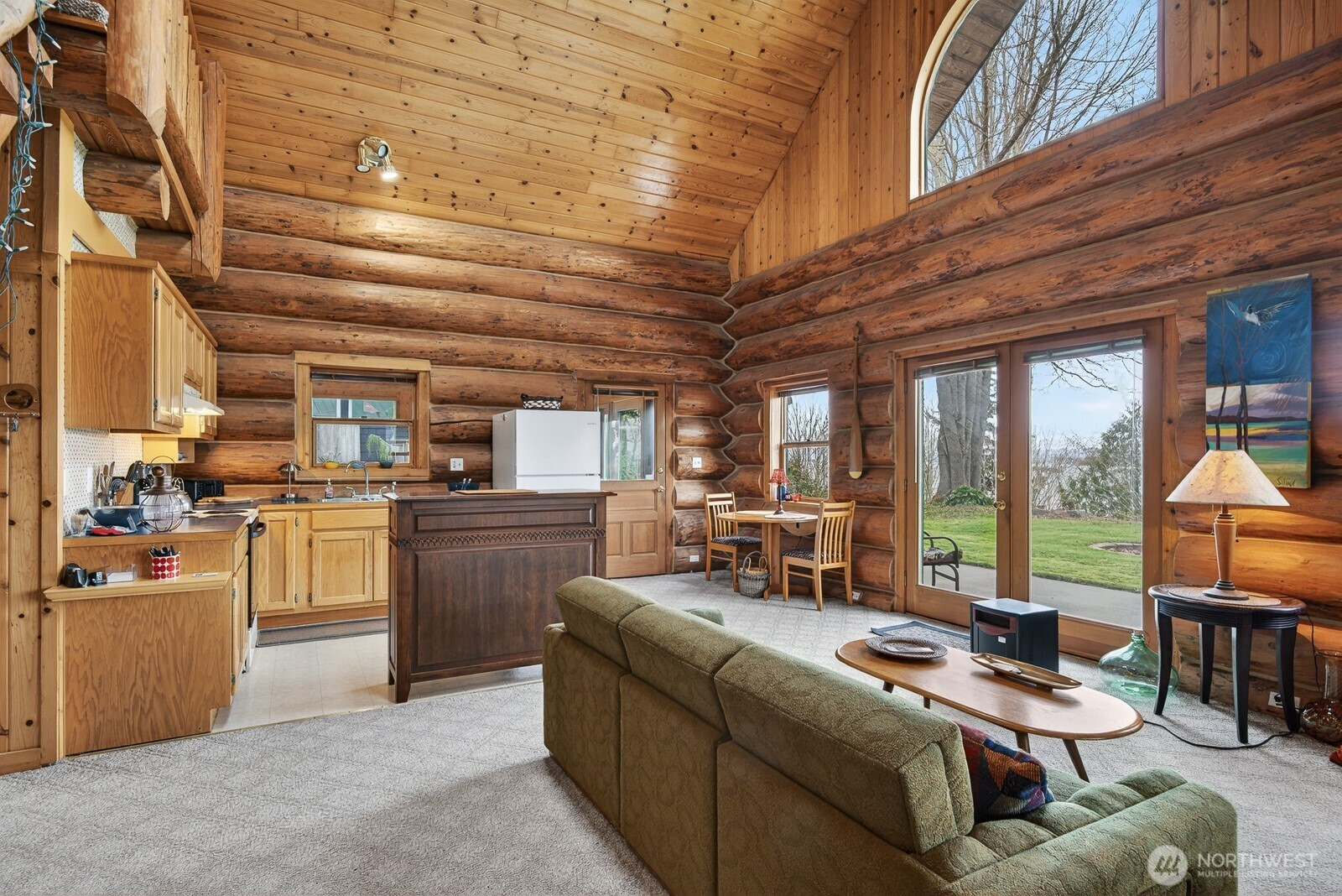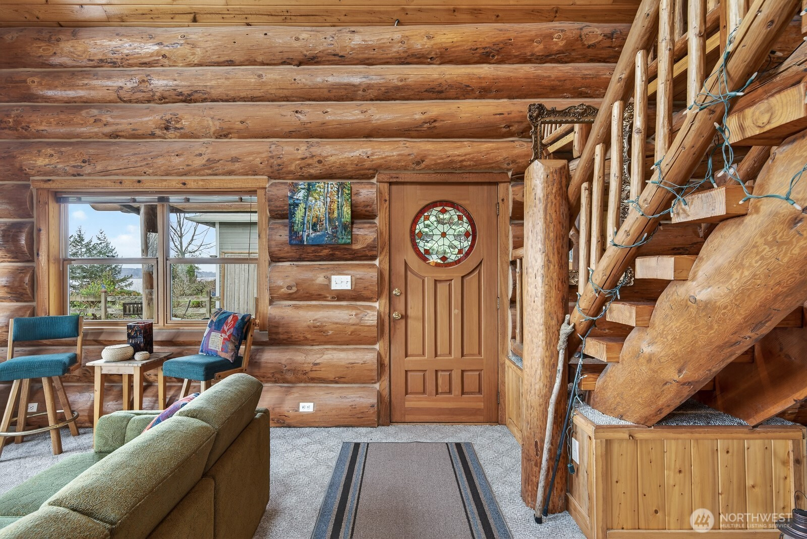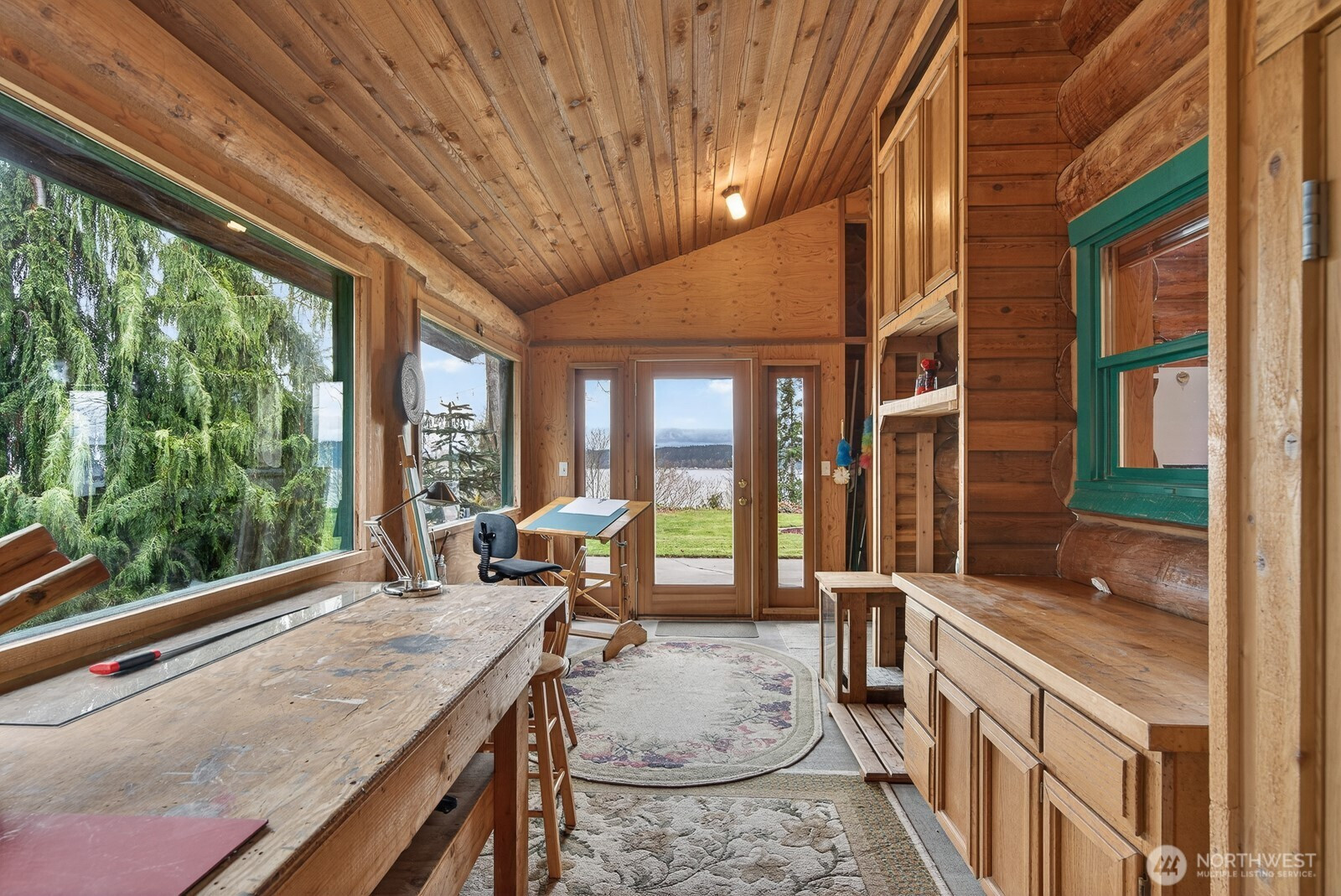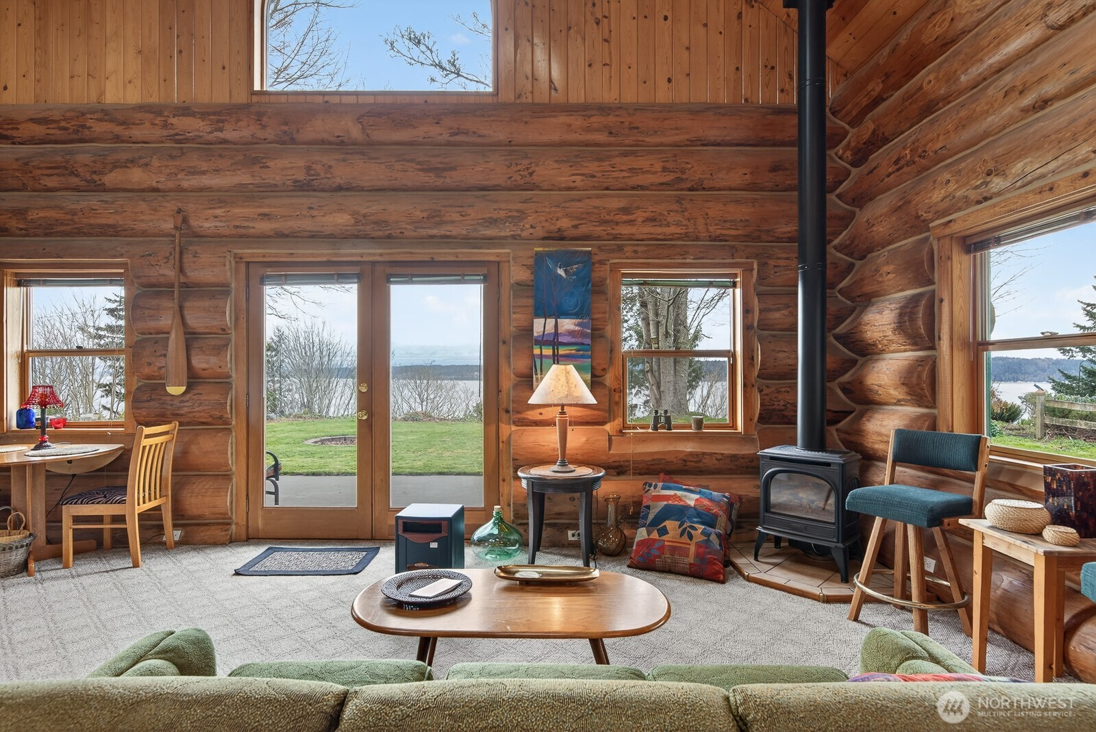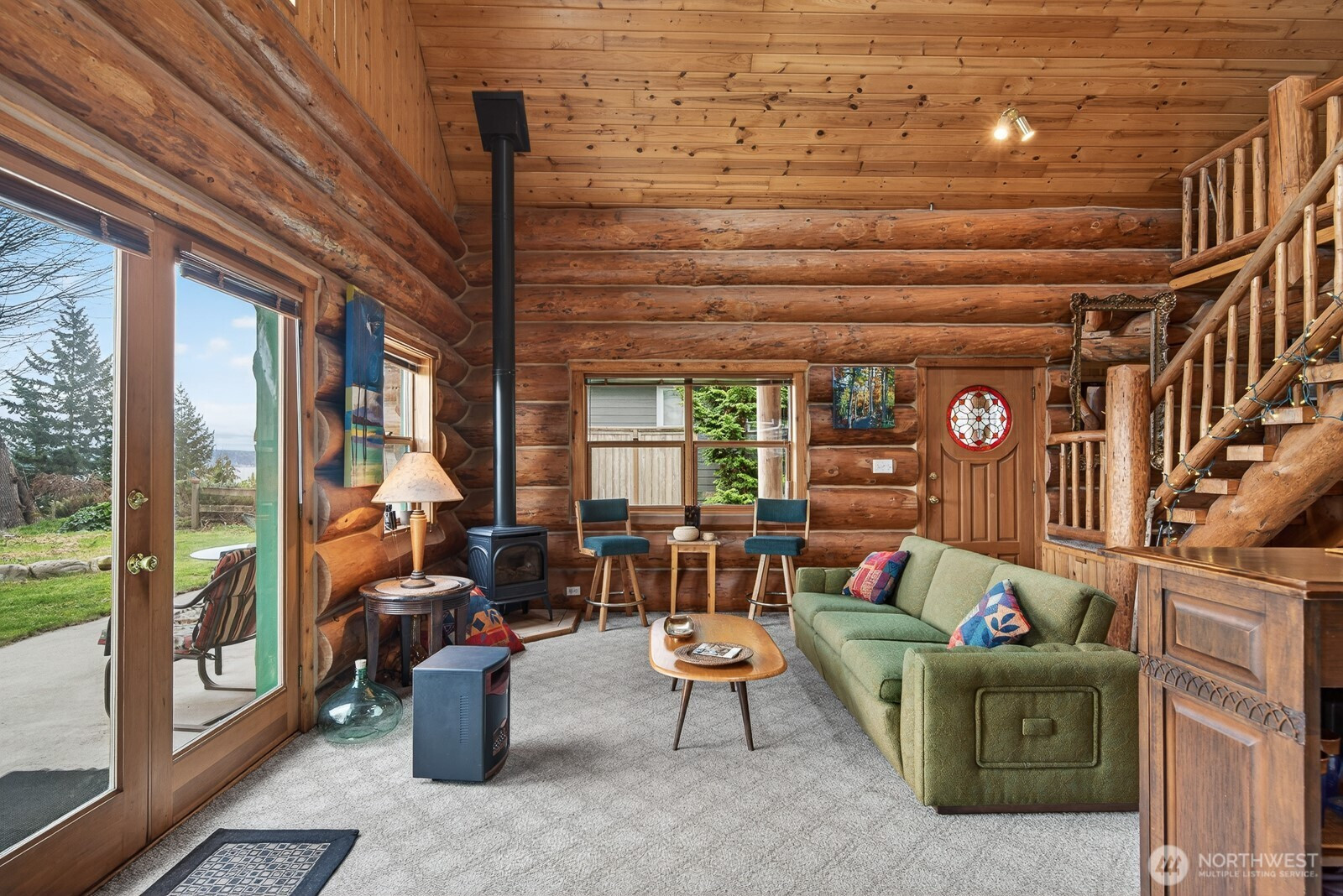 Come and enjoy this beautiful log home sitting on the bluff above Tillicum beach! Incredible views of Mt. Baker, Port Susan Bay, and the Cascades. You can enjoy the communities beach and the use of the boat launch as well. The sunrises are stunning! The home has been meticulously cared for inside and out. Large concrete patio facing the water and a large covered patio at the entrance to the main door. The interior has a large open, yet cozy, feel with several areas of living space. The main level includes the living room, kitchen with eating space, full bath, bedroom, and large open den. Also attached is a large artist studio/workshop with 3/4 bath. Upstairs is a large open bedroom with 2 large closets. Large evergreen trees, fruit trees greet you. Includes a high quality knotty pine storage building as well. Island living at its best!