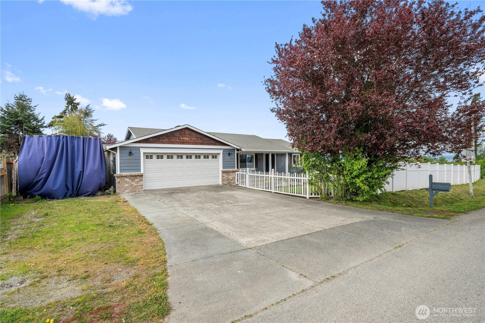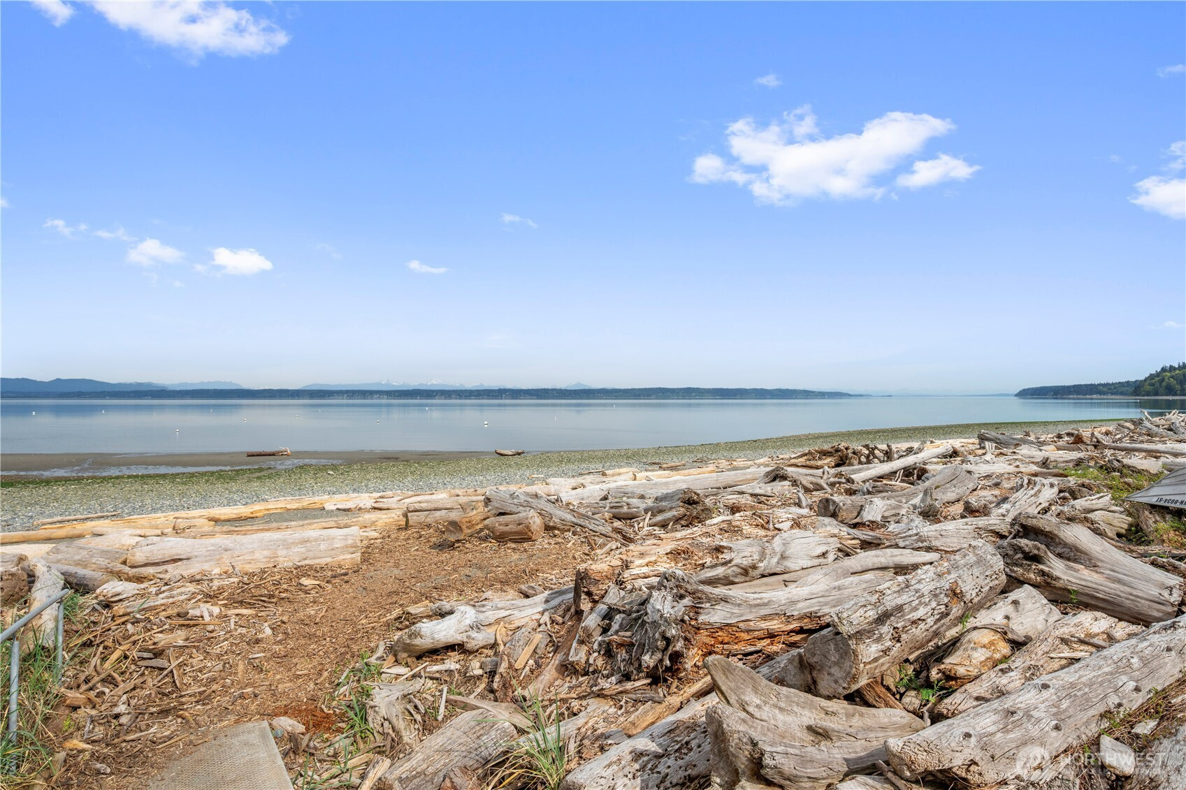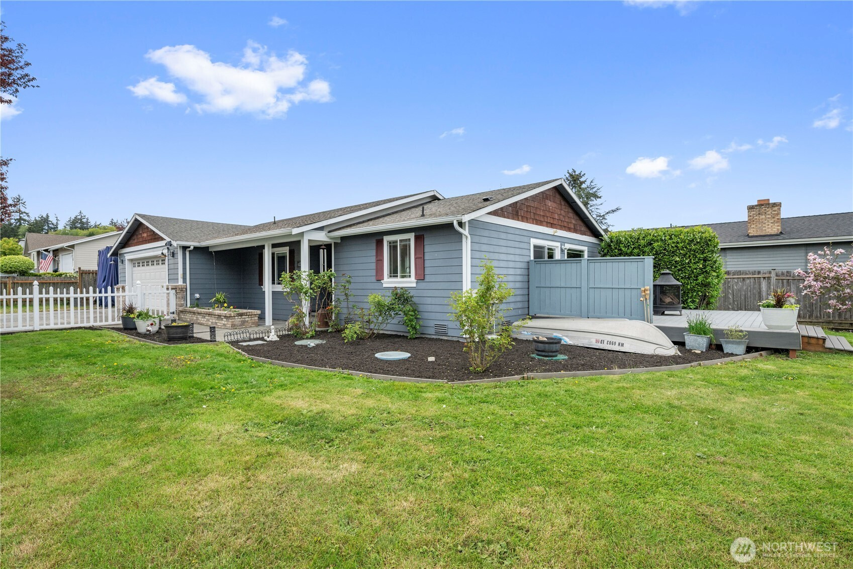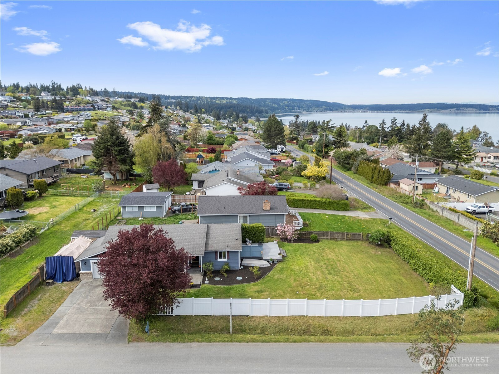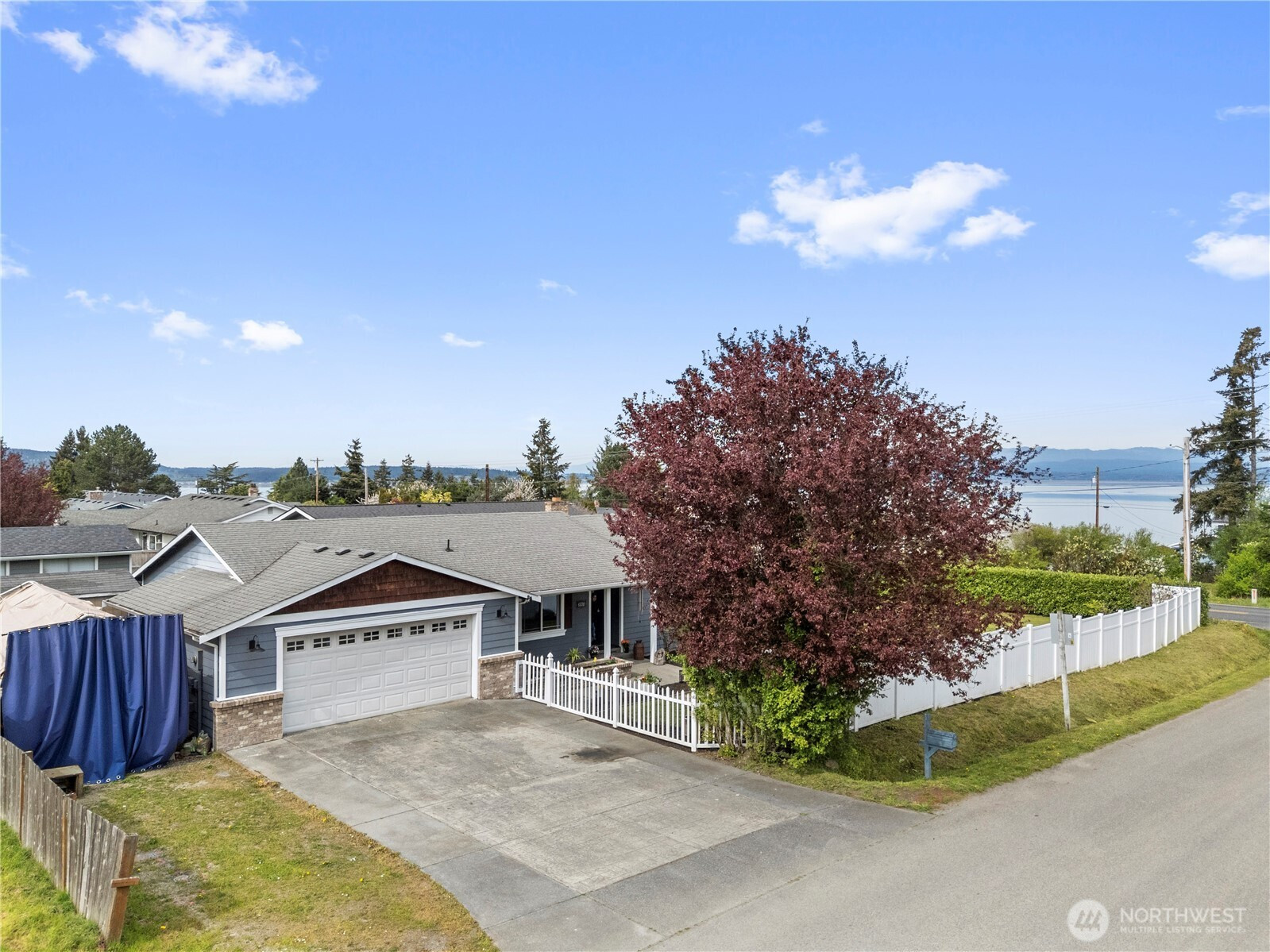 Beautifully updated home blending comfort, style, and versatility. Soak in breathtaking 180° partial views of the Sound and mountains—ever-changing sunsets, and serene water vistas—from the expansive Trex decking; with an additional pad ready for a hot tub. Enjoy RV/boat parking with electric hookups, and a storage shed on a concrete slab. Whole house generator hook-up, is in the garage. Inside, vaulted ceilings and an open-concept kitchen, living, and dining area create a warm, inviting space centered around a cozy fireplace. Features include new luxury vinyl plank flooring, high-end stainless steel appliances, and beautifully remodeled baths. The primary suite offers a walk-in closet, and the guest bedroom also includes a walk-in. Fully fenced, landscaped yard with access to three private Country Club beaches completes this exceptional home. Lots of outdoor storage space. This is a great home that you don't want to miss out on!