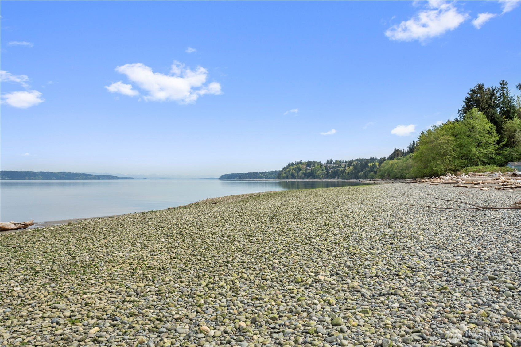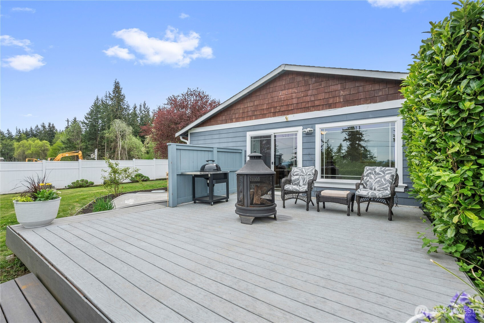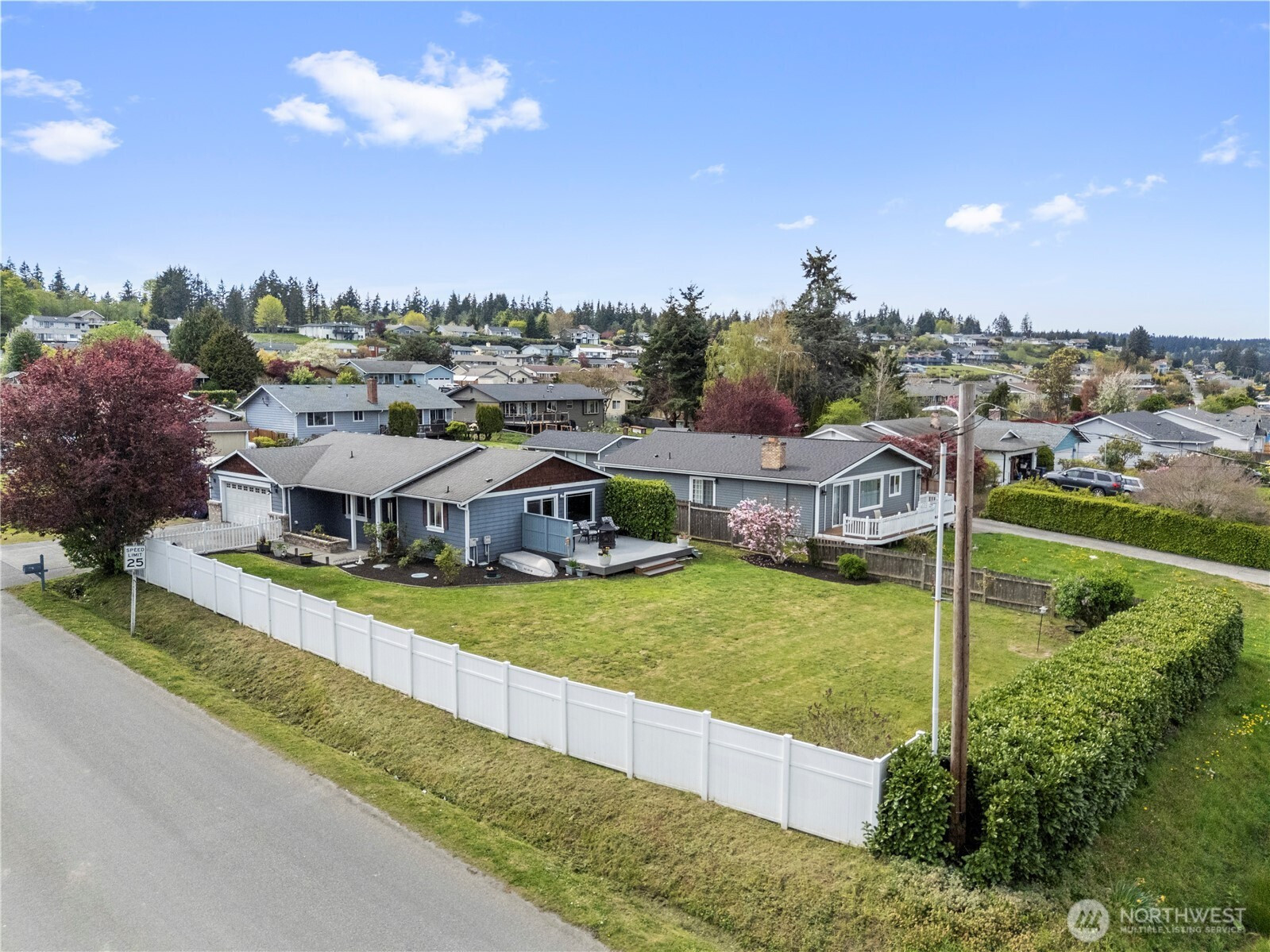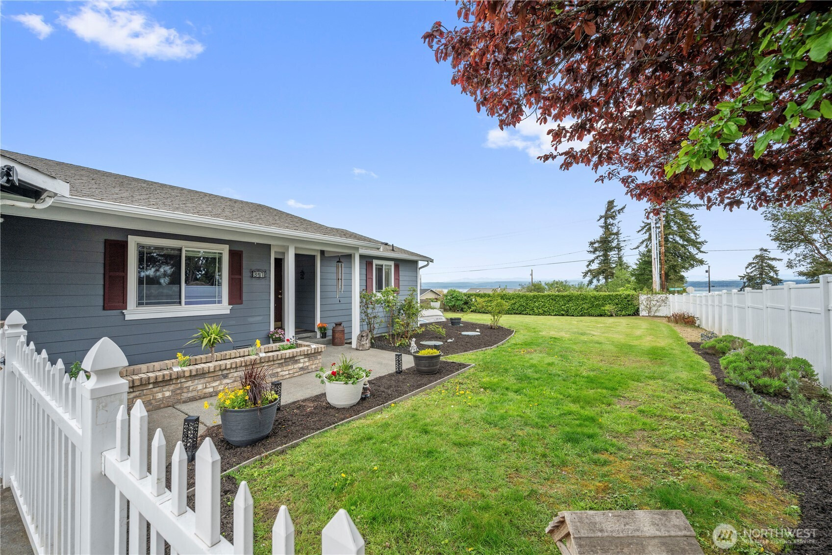 Beautifully updated home blending comfort, style, and versatility. Soak in breathtaking 180° partial views of the Sound and mountains—ever-changing sunsets, and serene water vistas—from the expansive Trex decking; with an additional pad ready for a hot tub. Enjoy RV/boat parking with electric hookups, and a storage shed on a concrete slab. Whole house generator hook-up, is in the garage. Inside, vaulted ceilings and an open-concept kitchen, living, and dining area create a warm, inviting space centered around a cozy fireplace. Features include new luxury vinyl plank flooring, high-end stainless steel appliances, and beautifully remodeled baths. The primary suite offers a walk-in closet, and the guest bedroom also includes a walk-in. Fully fenced, landscaped yard with access to three private Country Club beaches completes this exceptional home. Lots of outdoor storage space. This is a great home that you don't want to miss out on!