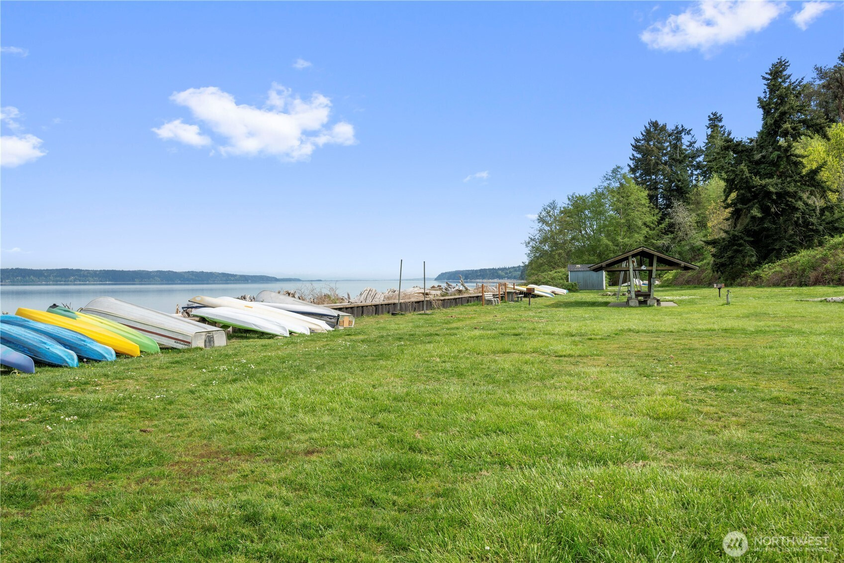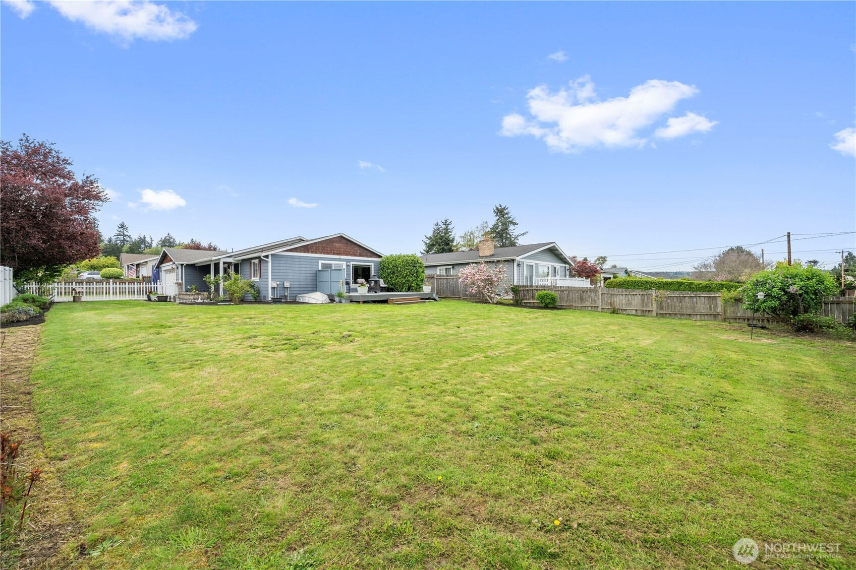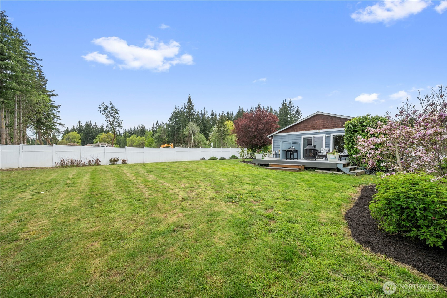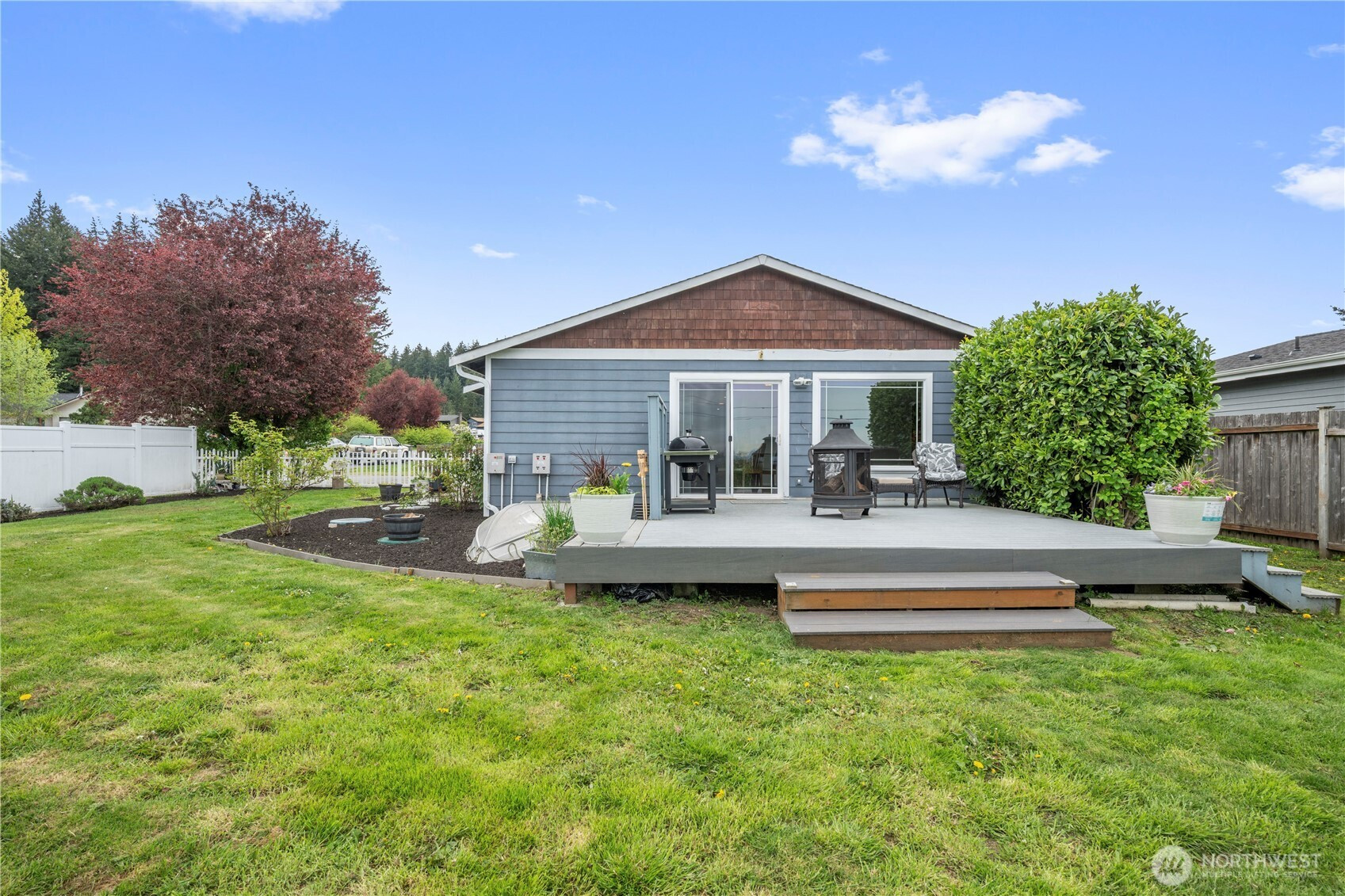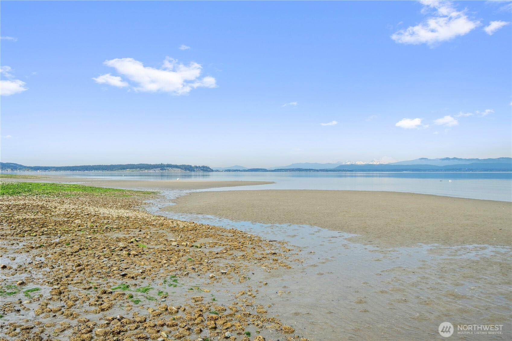 Beautifully updated home blending comfort, style, and versatility. Soak in breathtaking 180° partial views of the Sound and mountains—ever-changing sunsets, and serene water vistas—from the expansive Trex decking; with an additional pad ready for a hot tub. Enjoy RV/boat parking with electric hookups, and a storage shed on a concrete slab. Whole house generator hook-up, is in the garage. Inside, vaulted ceilings and an open-concept kitchen, living, and dining area create a warm, inviting space centered around a cozy fireplace. Features include new luxury vinyl plank flooring, high-end stainless steel appliances, and beautifully remodeled baths. The primary suite offers a walk-in closet, and the guest bedroom also includes a walk-in. Fully fenced, landscaped yard with access to three private Country Club beaches completes this exceptional home. Lots of outdoor storage space. This is a great home that you don't want to miss out on!