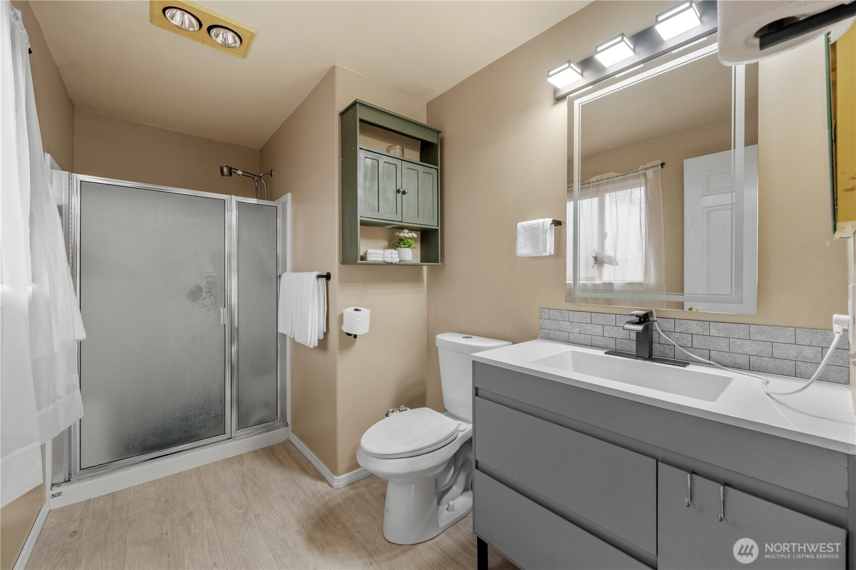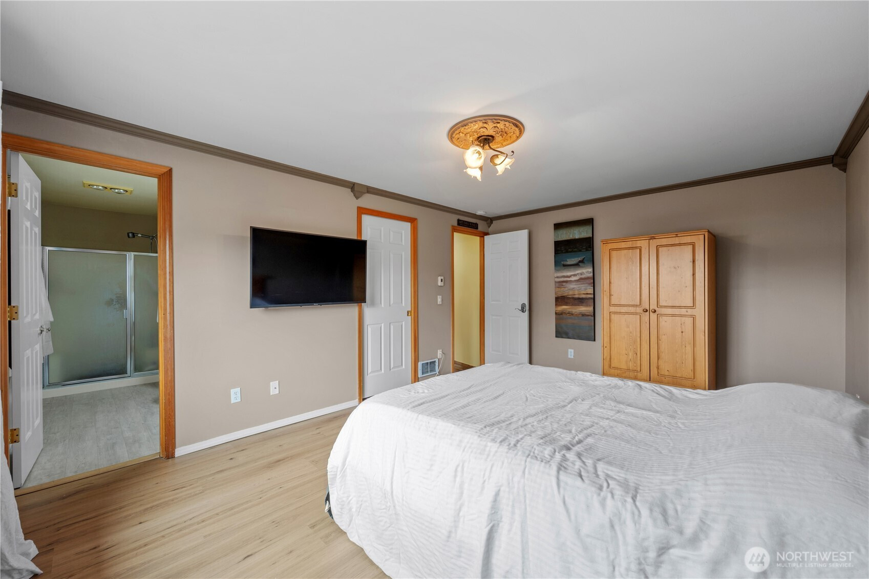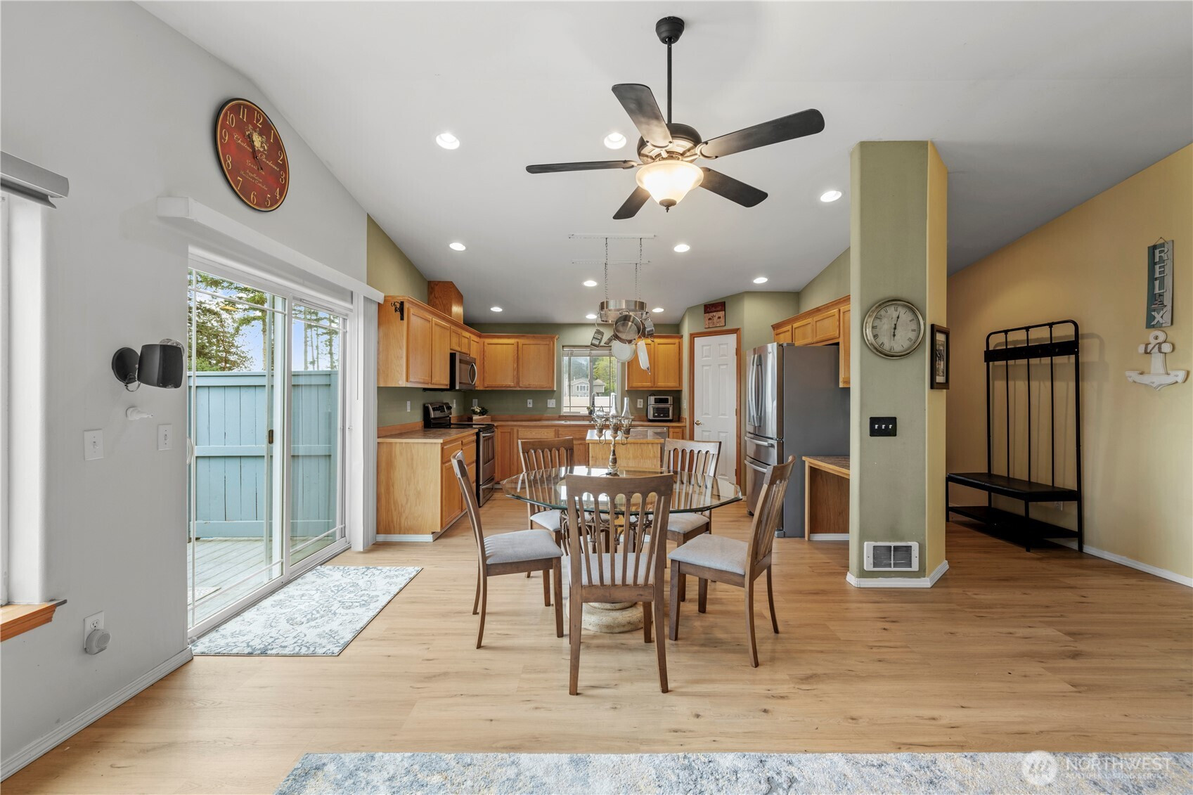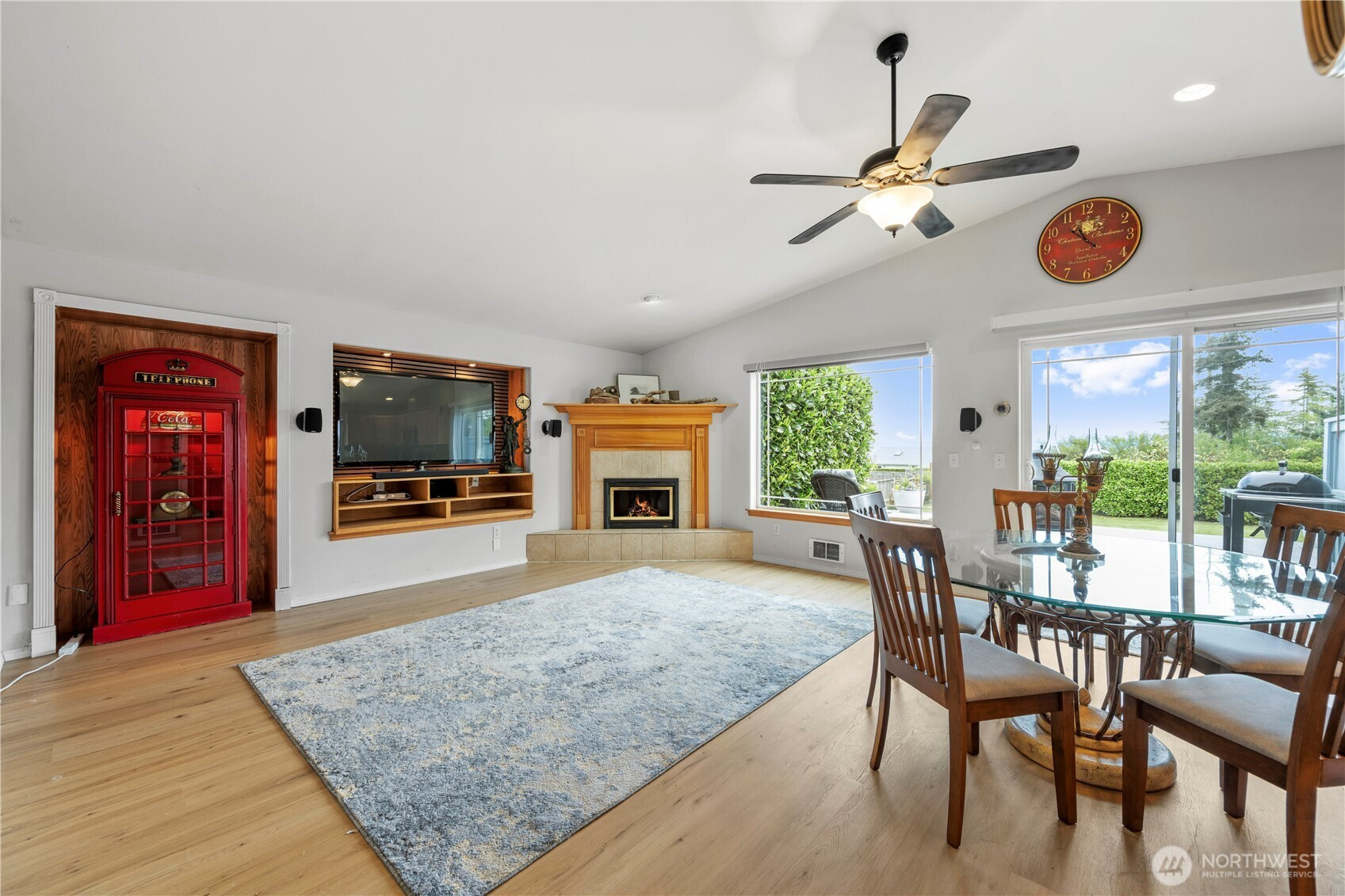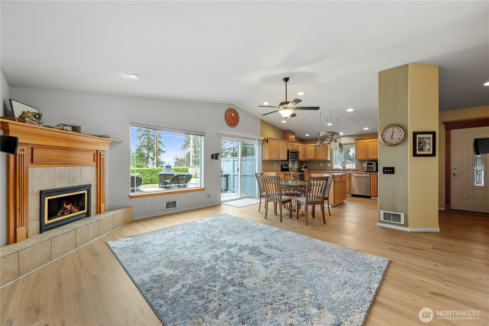 Beautifully updated home blending comfort, style, and versatility. Soak in breathtaking 180° partial views of the Sound and mountains—ever-changing sunsets, and serene water vistas—from the expansive Trex decking; with an additional pad ready for a hot tub. Enjoy RV/boat parking with electric hookups, and a storage shed on a concrete slab. Whole house generator hook-up, is in the garage. Inside, vaulted ceilings and an open-concept kitchen, living, and dining area create a warm, inviting space centered around a cozy fireplace. Features include new luxury vinyl plank flooring, high-end stainless steel appliances, and beautifully remodeled baths. The primary suite offers a walk-in closet, and the guest bedroom also includes a walk-in. Fully fenced, landscaped yard with access to three private Country Club beaches completes this exceptional home. Lots of outdoor storage space. This is a great home that you don't want to miss out on!