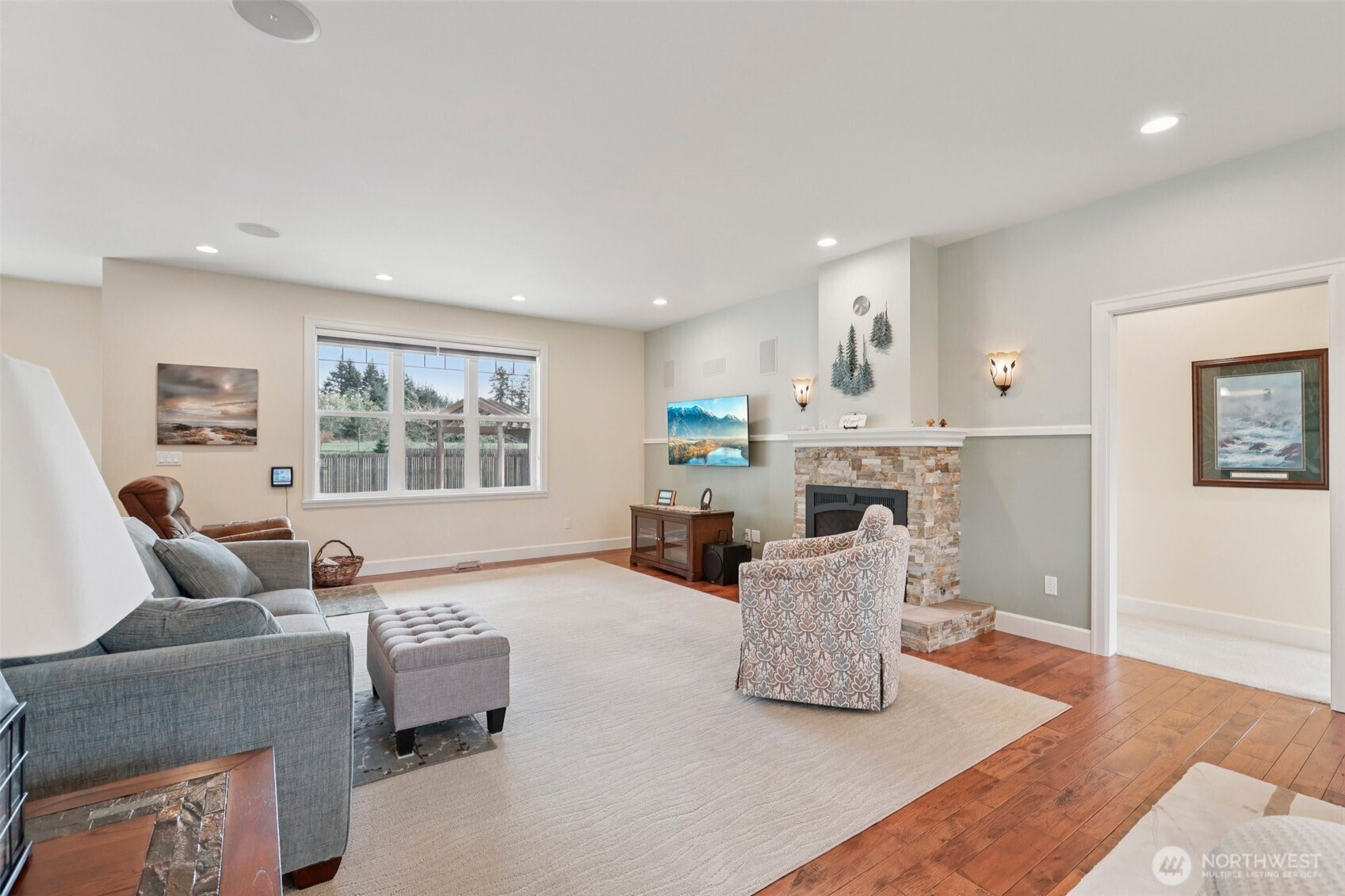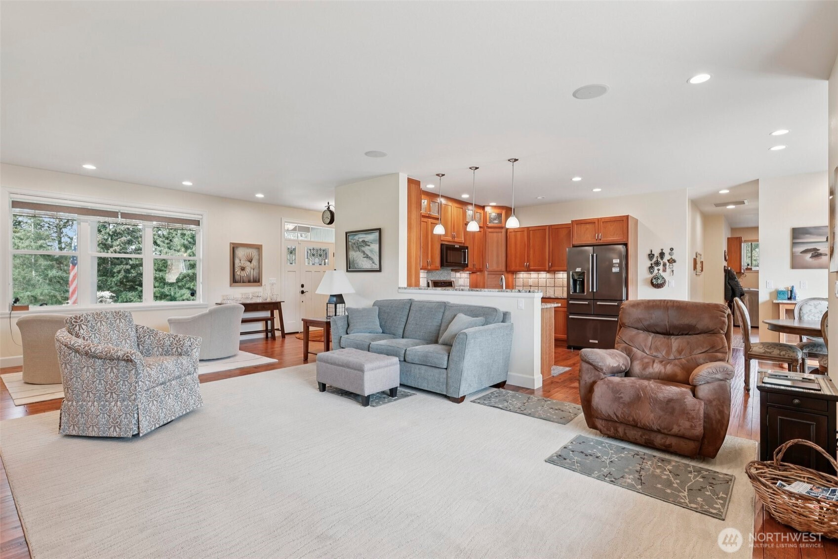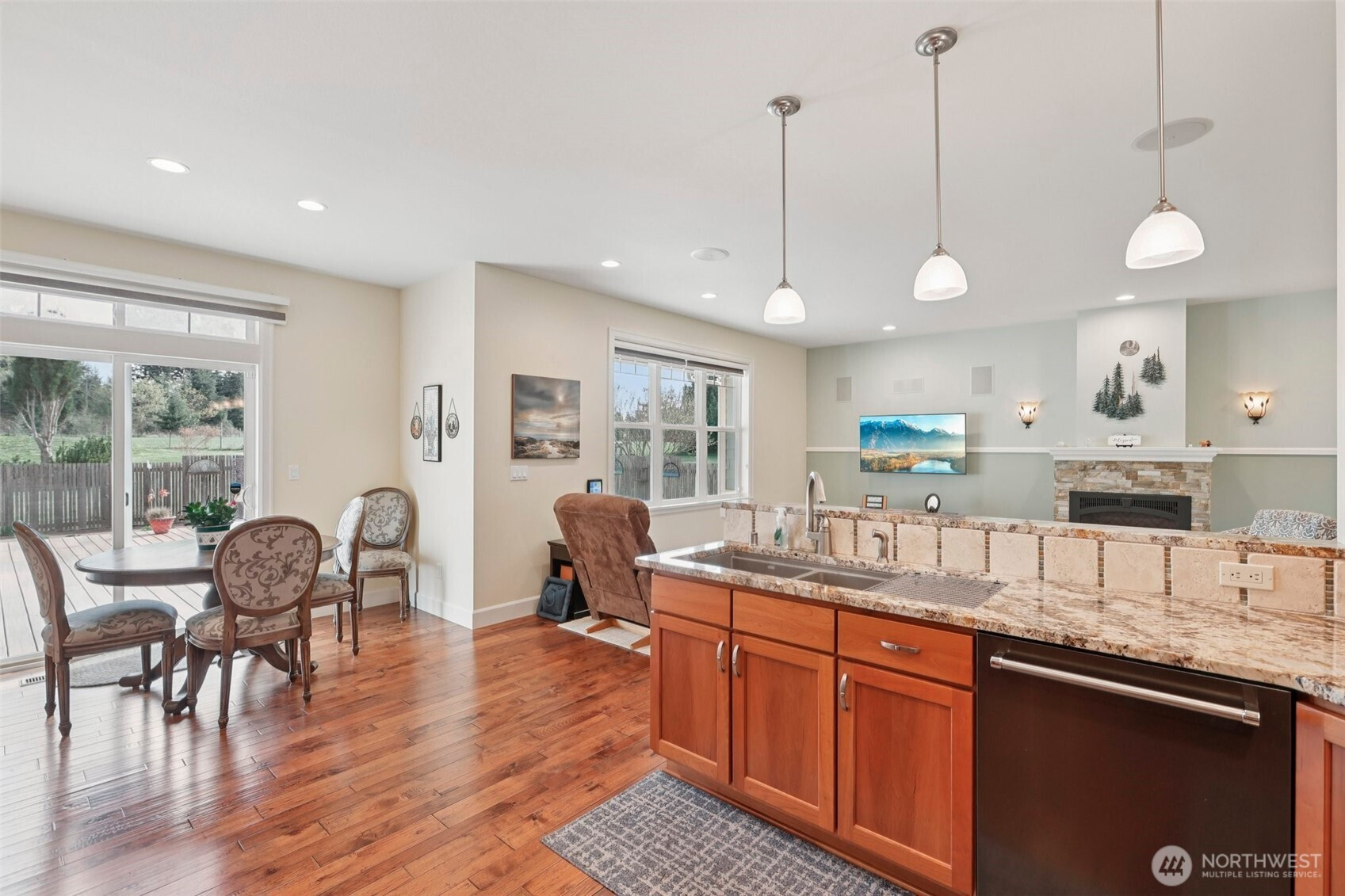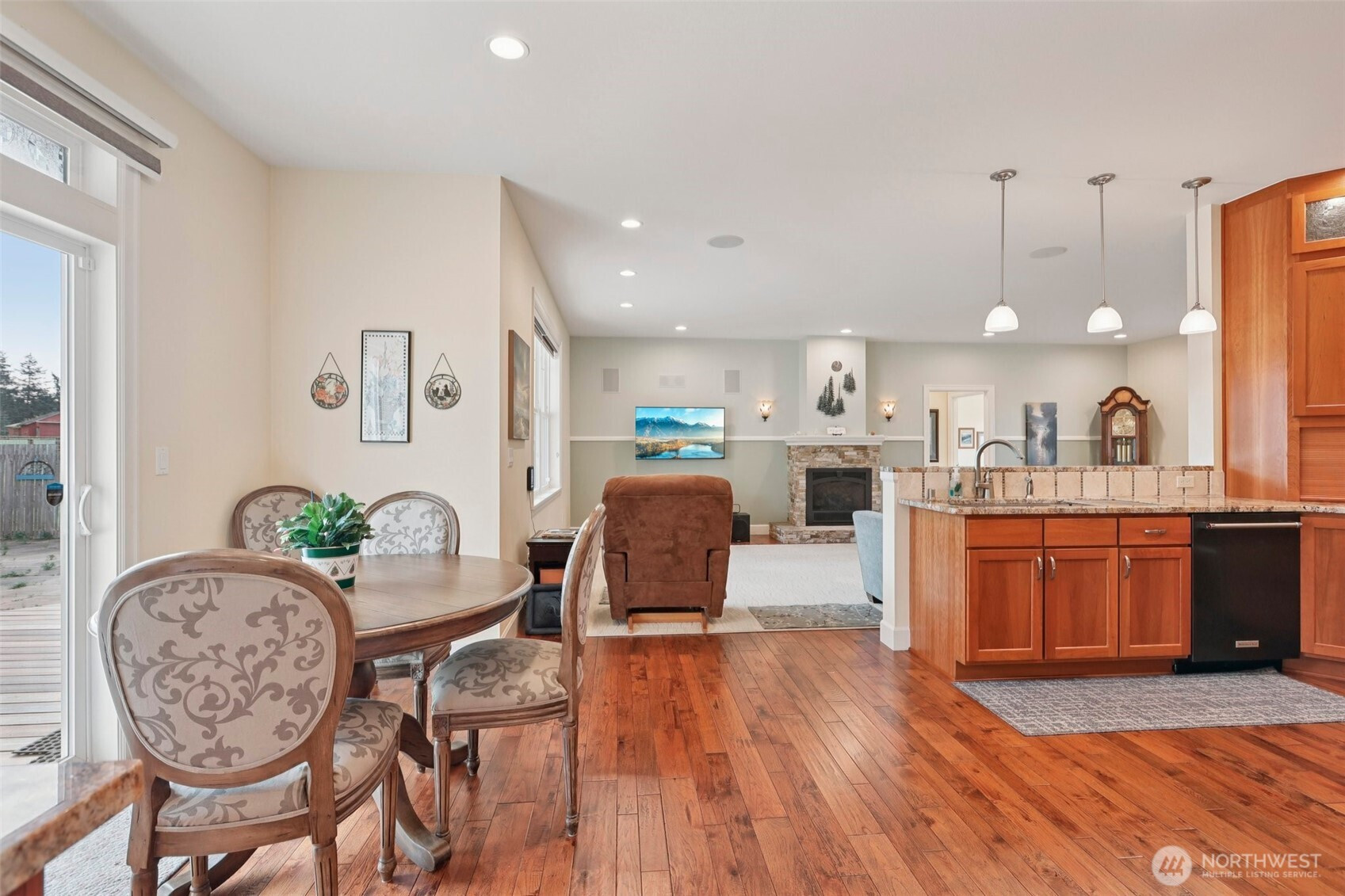 Tucked into almost 5 peaceful acres in the heart of Camano Island, this craftsman style rambler invites a slower, more intentional way of living. Light-filled, open living spaces highlight warm cherry cabinetry, stone surfaces, and engineered hardwood floors, while a gas fireplace anchors cozy evenings at home. The kitchen flows easily for everyday living and gathering, and the primary suite offers a spa-like escape with heated tile floors and shower pan, and a multi-head shower. Step outside to a back deck and patio made for summer nights under the stars. A three-car garage with a workshop and half bath adds flexibility, while the acreage offers room to create—whether a shop, guest space, or something more. Thoughtful features, including a whole-house generator and water filtration system, bring ease to island living.