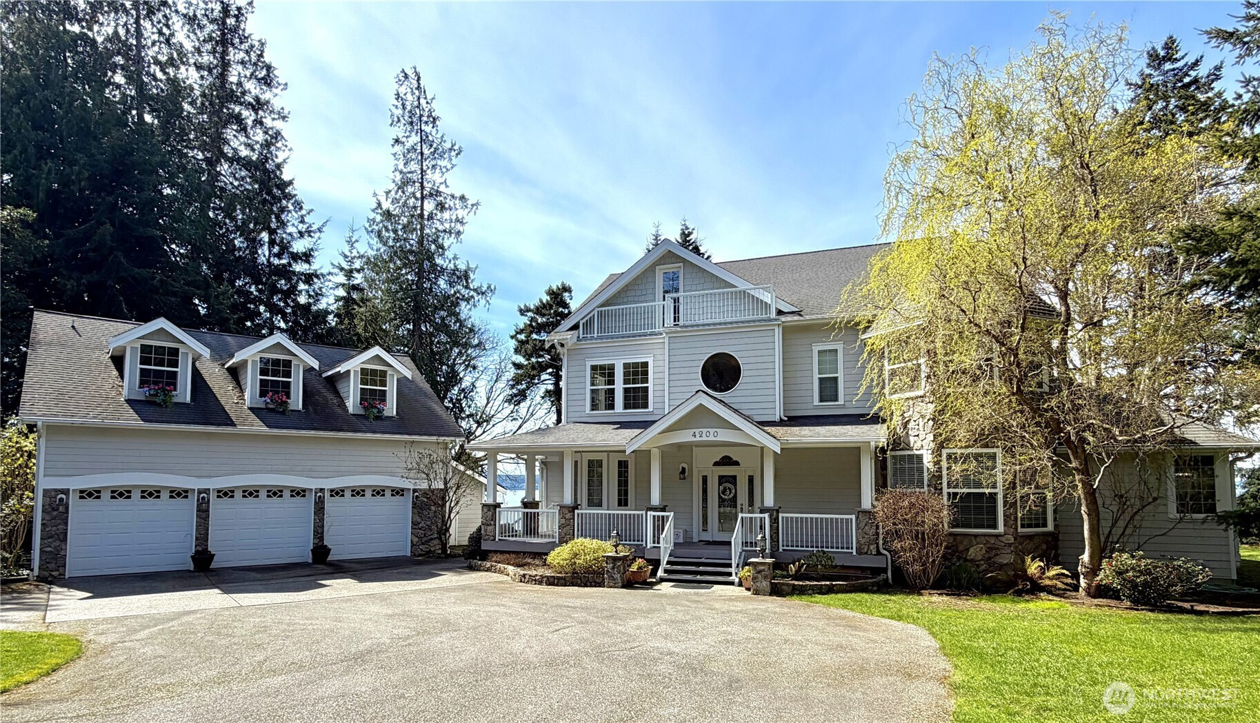 Elevated Island Living. Discover a remarkable waterfront retreat on Camano Island where breathtaking views and relaxed coastal living come together. Sweeping Sound and mountain panoramas are visible from nearly every room, creating an unforgettable backdrop for daily life, with gorgeous sunsets, passing boats, whale watching, and eagles soaring overhead. Designed to showcase its stunning setting, the home features walls of windows that frame the ever-changing scenery. At the heart of the home, a beautiful fireplace serves as a central focal point, creating a warm and inviting place to gather. The spacious kitchen features a large, functional walk-in pantry with additional workspace. A convenient main-floor primary bedroom adds comfort and flexibility, while additional bedrooms each have their own en-suite for residents and guests. The expansive 1,224 sq ft garage provides abundant room for vehicles, toys, storage, and projects. Above the garage, a versatile finished space offers endless possibilities—perfect for a home gym, art or music studio, hobby space, or a private retreat for work and creativity. Outside, the patio and private grounds create an inviting setting for barbecuing, gardening, playing, relaxing or simply taking in the peaceful surroundings. A firepit adds a place to unwind and enjoy evenings under the stars. With no ferry required, this exceptional Camano property offers the ease of island living and the feeling of being on vacation every day.