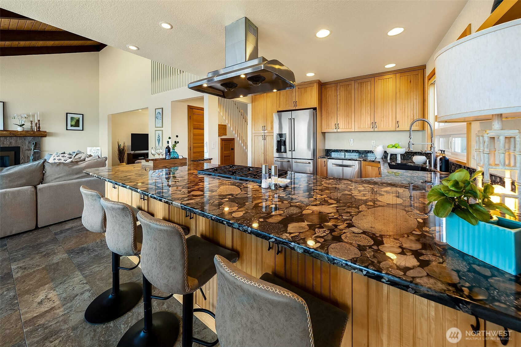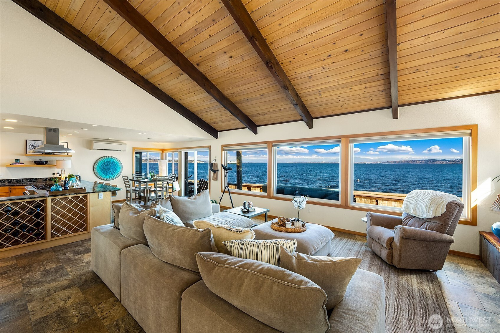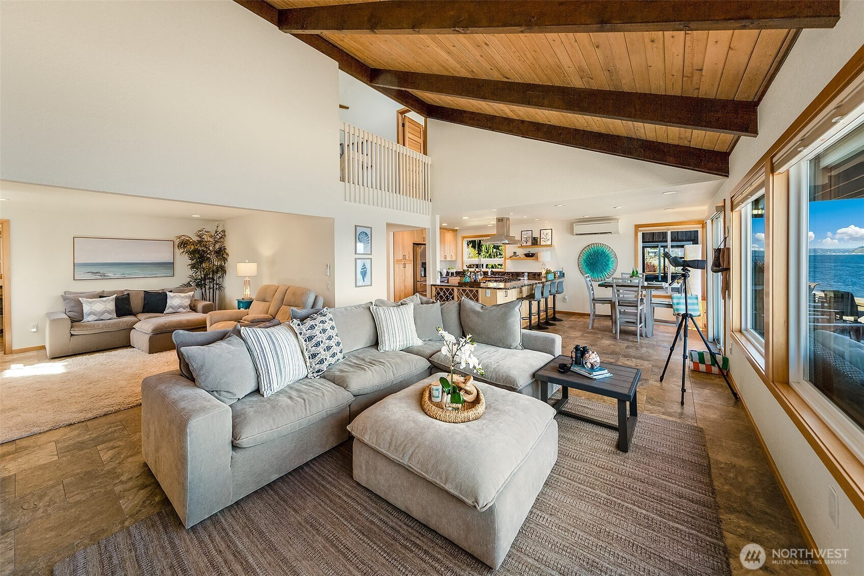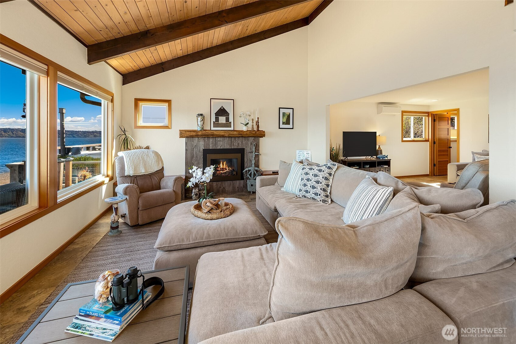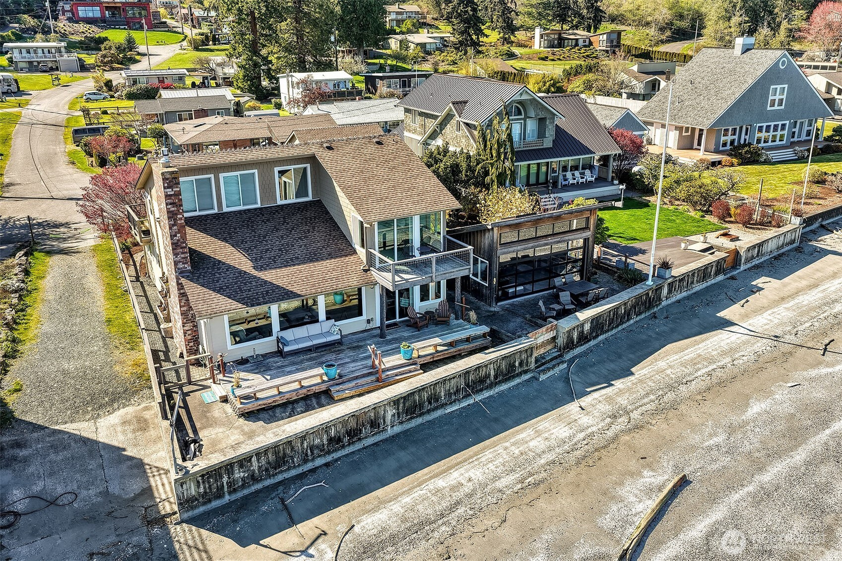 Welcome to the perfect Whidbey Island getaway! Perched along the shores of Columbia Beach, this beautifully remodeled 2-bedroom retreat offers the perfect blend of comfort, style and breathtaking waterfront living. Thoughtfully updated with a modern eye, the home features a light-filled interior, warm wood accents and expansive windows that frame sweeping views of Puget Sound and the Cascade Mountains. The striking open-concept kitchen is complete with high quality finishes, stainless appliances and seamless flow into the dining and living spaces that’s ideal for everyday living or hosting with a view. The inviting living room, anchored by a cozy fireplace and vaulted wood-beamed ceilings, creates a serene space to relax while watching the ever-changing shoreline. Full bath, half bath and an office complete the main floor. Upstairs find an impressive primary ensuite with 5-piece bath, walk-in closet and private deck overlooking the Sound. Step outside to a fully fenced yard, offering privacy and room to unwind, garden or entertain. A covered carport plus a detached two car garage provides storage and security. A detached studio retreat provides a flexible bonus space that’s perfect for a home office, creative studio or place to relax after a long stroll on beach!