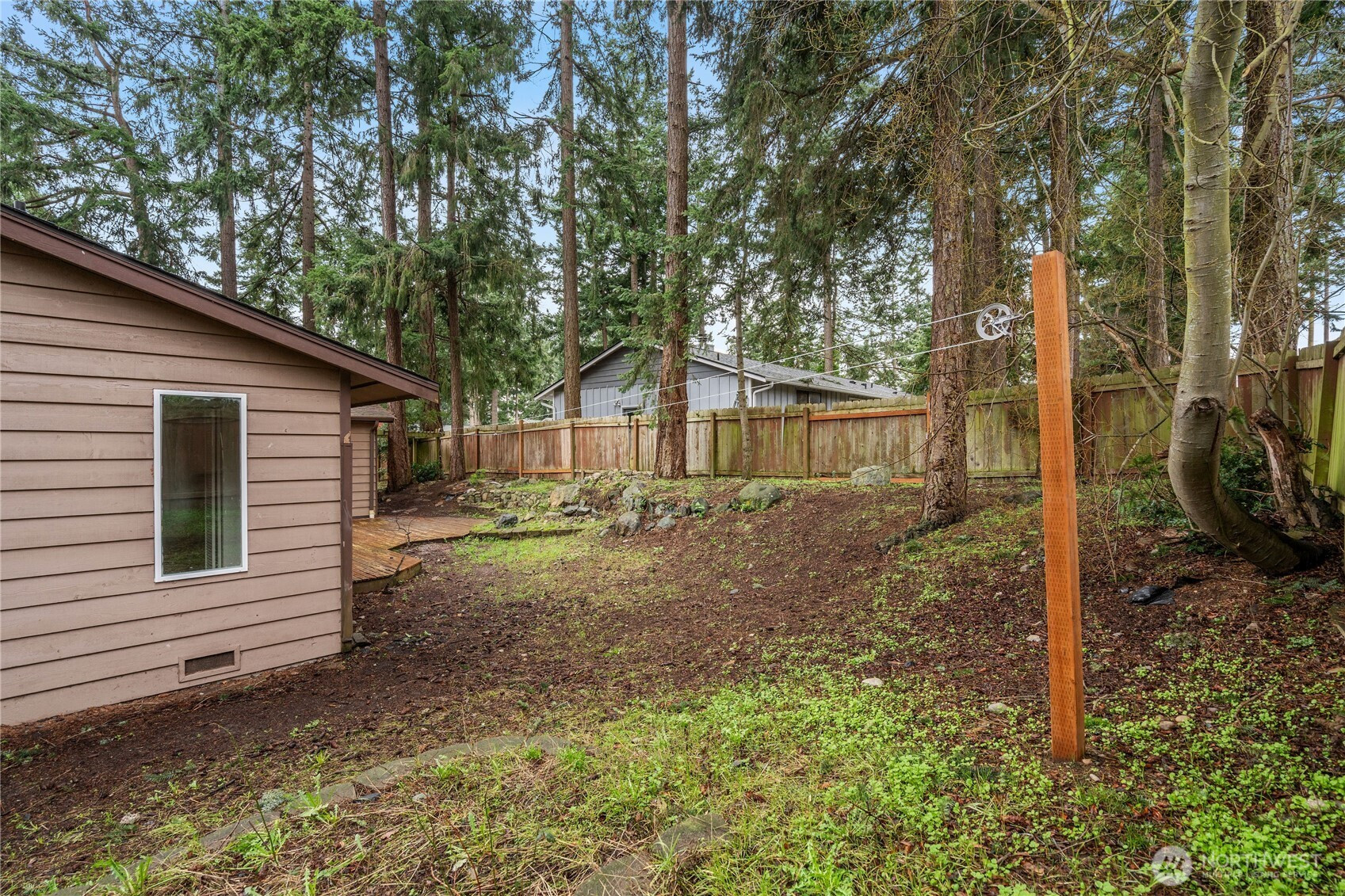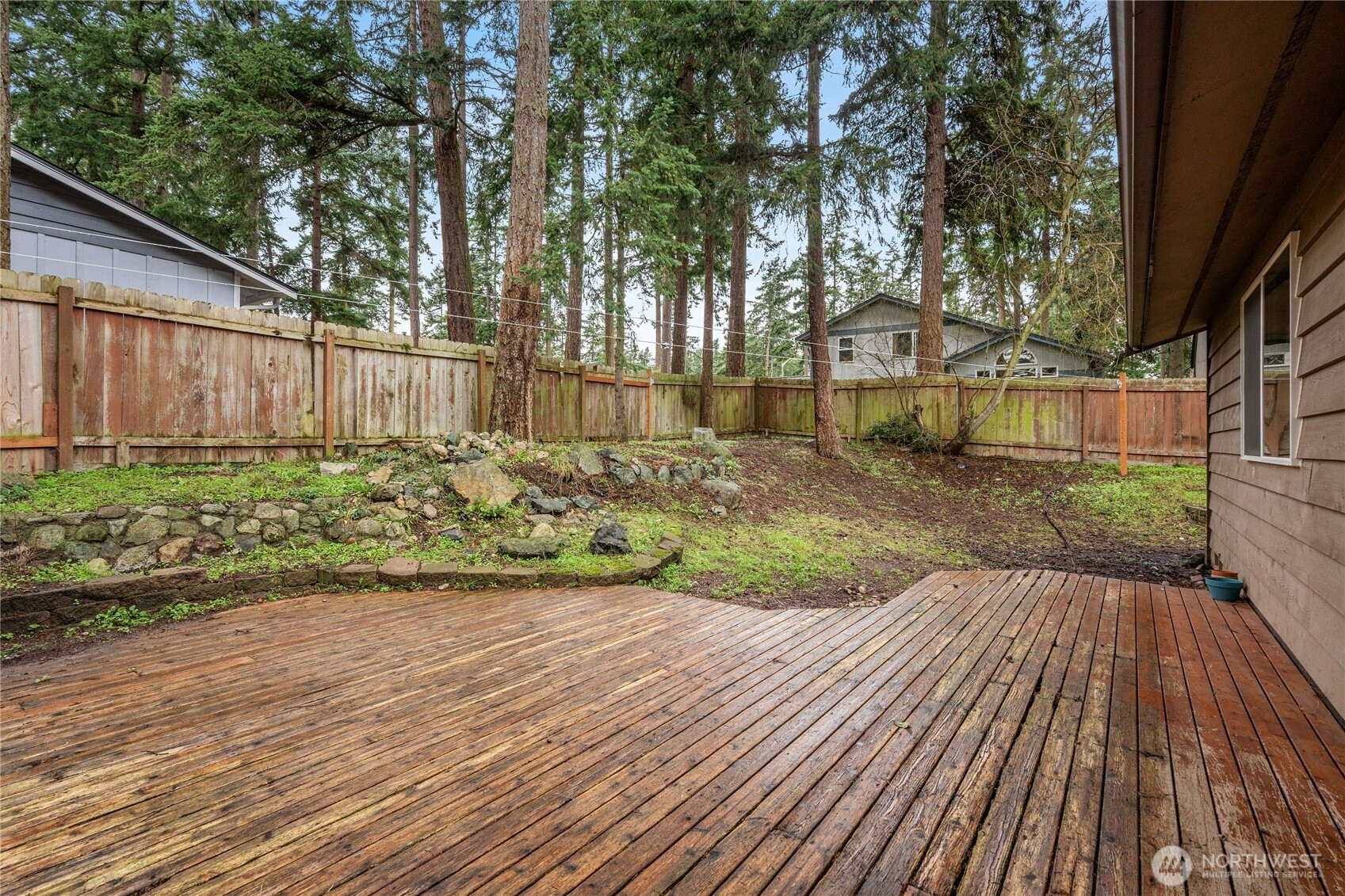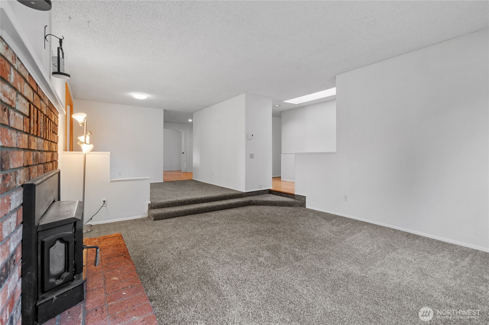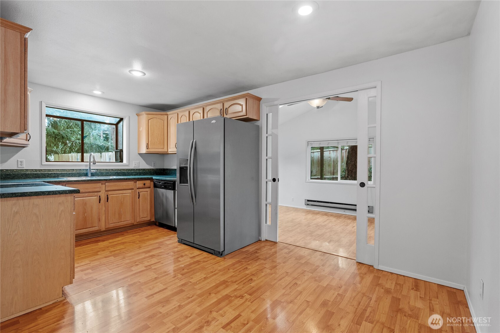 Privately situated on a corner lot, this well-maintained 3-bedroom, 1.75-bath residence offers 1,588 square feet of comfortable living space. The inviting living room features a propane gas fireplace and flows seamlessly into the dining area. A spacious family room with vaulted ceilings and abundant skylights is thoughtfully separated from the kitchen by double sliding pocket doors, creating both openness and flexibility. The home has been refreshed with new carpeting and fresh interior paint, along with newer vinyl plank flooring in the hallway and primary bedroom. The primary suite includes a walk-in closet and a private ¾ bath. Additional highlights include skylights in the entryway, family room, and main bathroom, as well as a newer refrigerator and dishwasher. Enjoy outdoor living in the fully fenced backyard, complete with a large deck and garden shed. Conveniently located near schools, shopping, parks, and NAS Whidbey