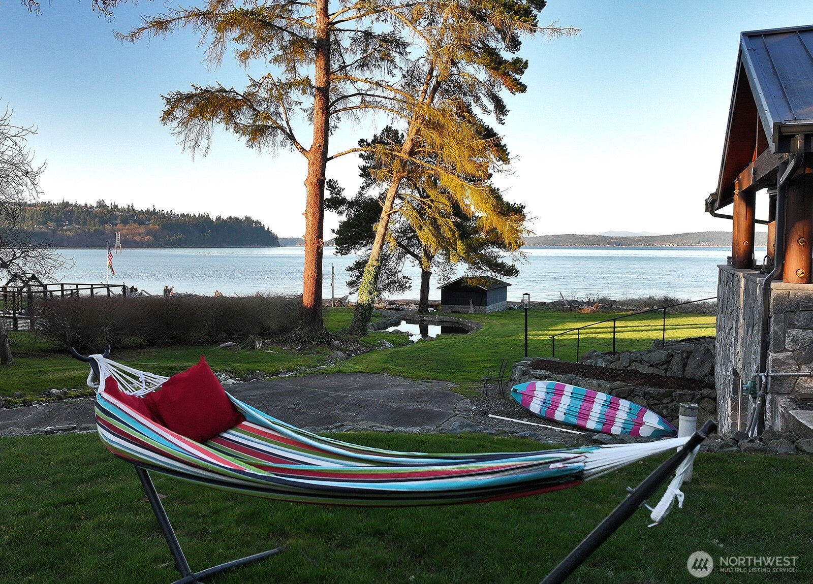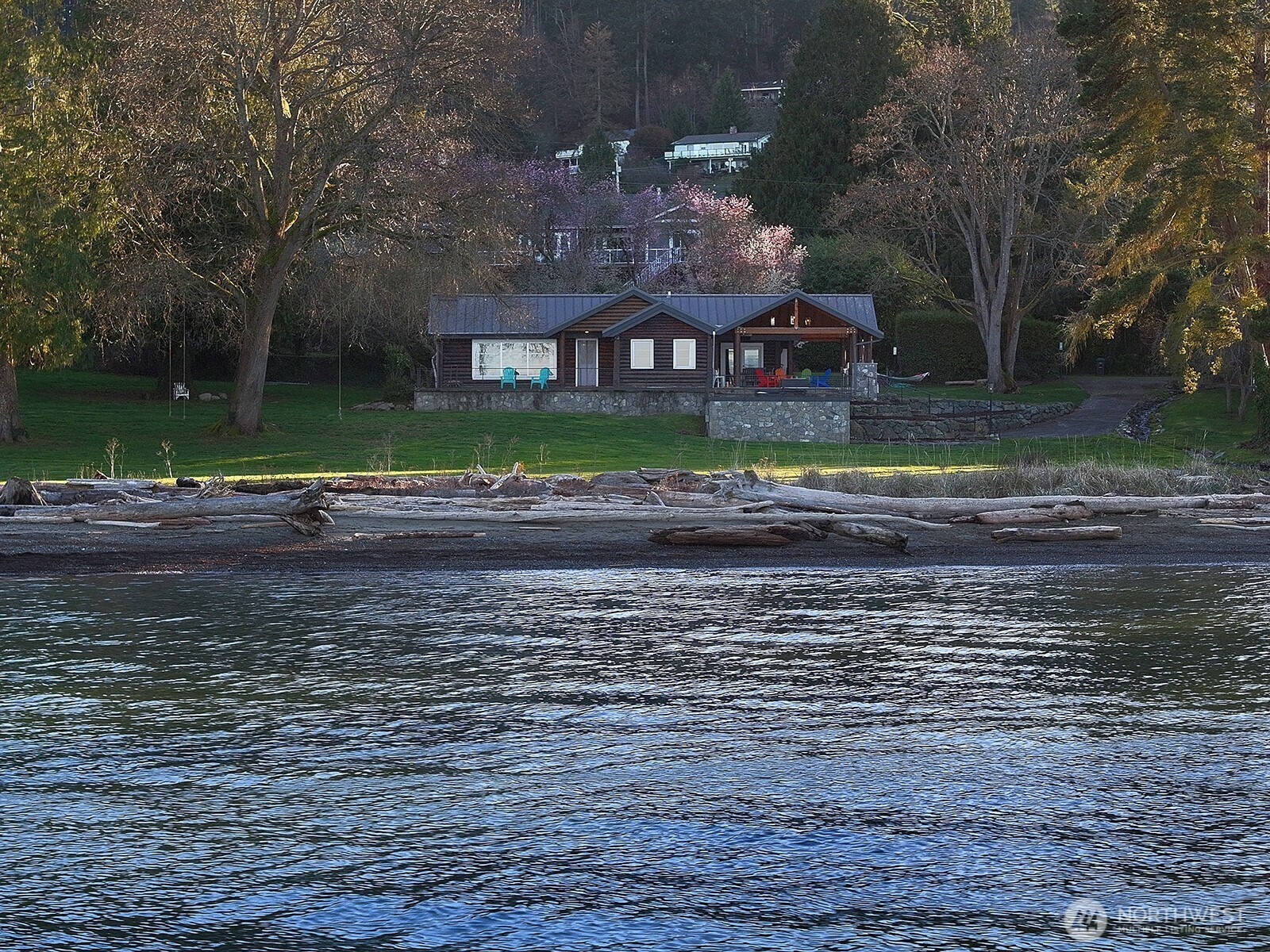 Wake up to sweeping 180° views of Dugualla Bay and majestic Mt. Baker from this rare Whidbey Island legacy waterfront retreat. Set on approximately 2.4 acres with 280 feet of shoreline, the property offers remarkable privacy, natural beauty, and timeless island charm. The original log cabin was barged to this site in the mid 1950's by the navy and became part of the historic Kellogg estate, blending rich history with authentic character. Expansive windows frame ever-changing water and mountain views, filling the home with natural light. The residence offers 3 bedrooms and 1.75 bathrooms. The main level showcases the warmth of the original cabin with wood-burning fireplace, bar area, great room, open kitchen, and a bedroom suite with attached bunk room. The lower level adds two bedrooms, a full bath, laundry, and a spacious game room—ideal for guests or multi-generational living. Outdoor living is exceptional with a covered patio and architect-designed outdoor kitchen featuring stainless counter, grill, refrigerator, propane firepit, sink, lighting, and heaters. Beautiful grounds include open lawn areas, mature fruit trees, and peaceful waterfront surroundings. A garage and a boathouse provide excellent storage or workshop potential. A rare opportunity combining acreage, historic character, waterfront living, and iconic Mt. Baker views just minutes from Oak Harbor.