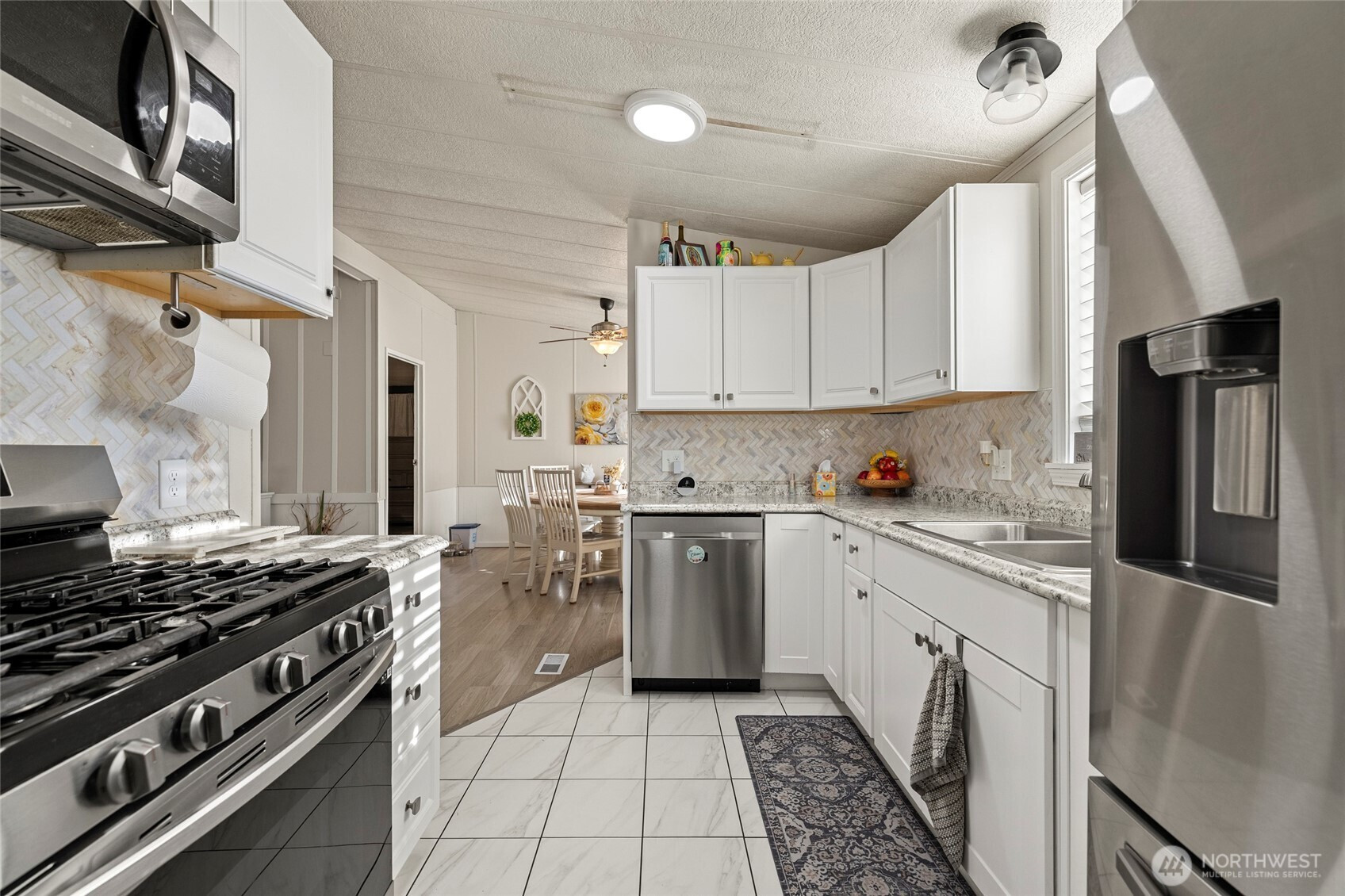 Discover this beautifully updated manufactured home. This charming residence boasts brand-new exterior siding that enhances curb appeal, alongside fresh, modern flooring throughout the interior, the entire home has been freshly painted, giving it a bright and welcoming atmosphere. The kitchen has been fully updated with contemporary finishes, new appliances, and stylish cabinetry. The floor plan is ideal with the primary on one end and the other two on the opposite side. Backyard complete with play structure and ground covering. A nice size storage unit outside, covered front porch and little bonus room are great add-ons. Park rent is $1199 and includes water, sewer and garbage. All appliances stay with home. Make this Whidbey Island affordable home yours today! Buyer must obtain park manager approval prior to an offer being accepted.