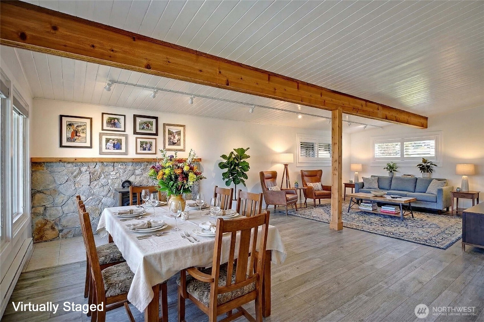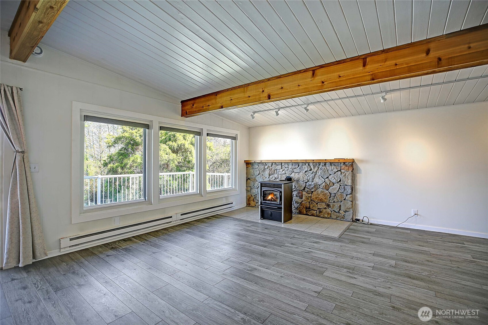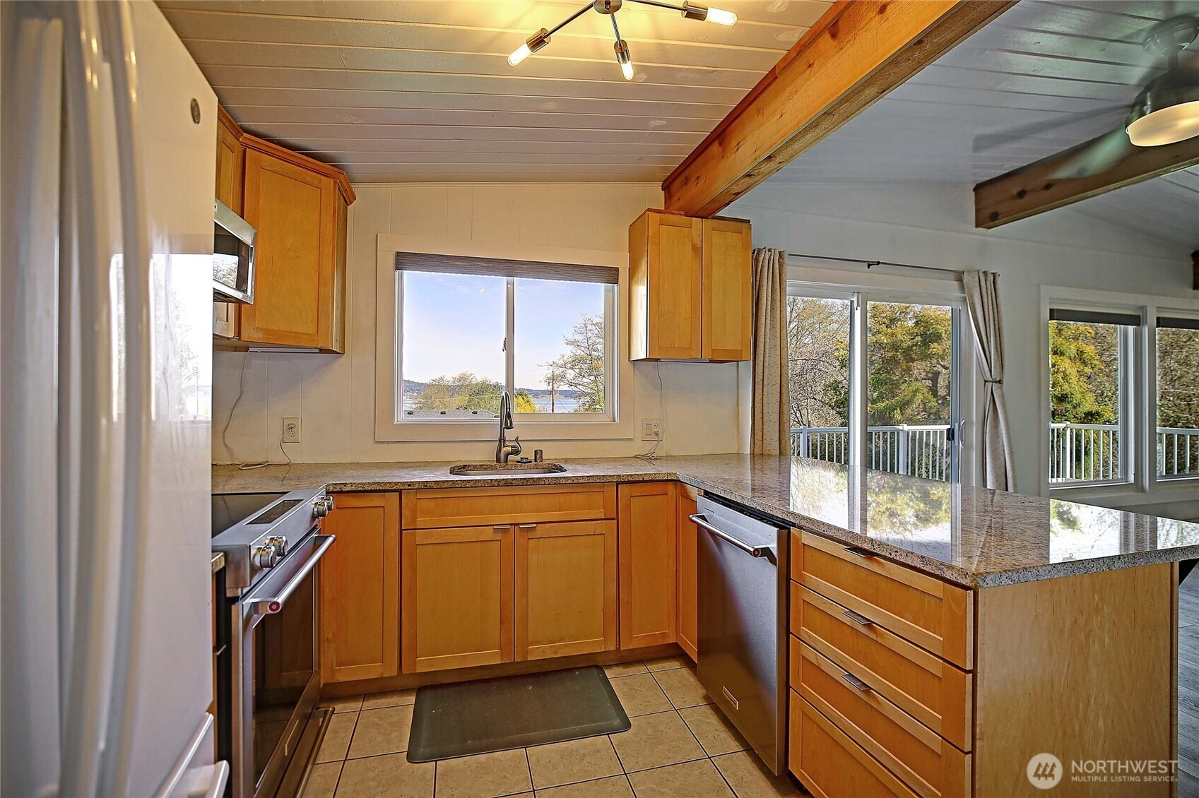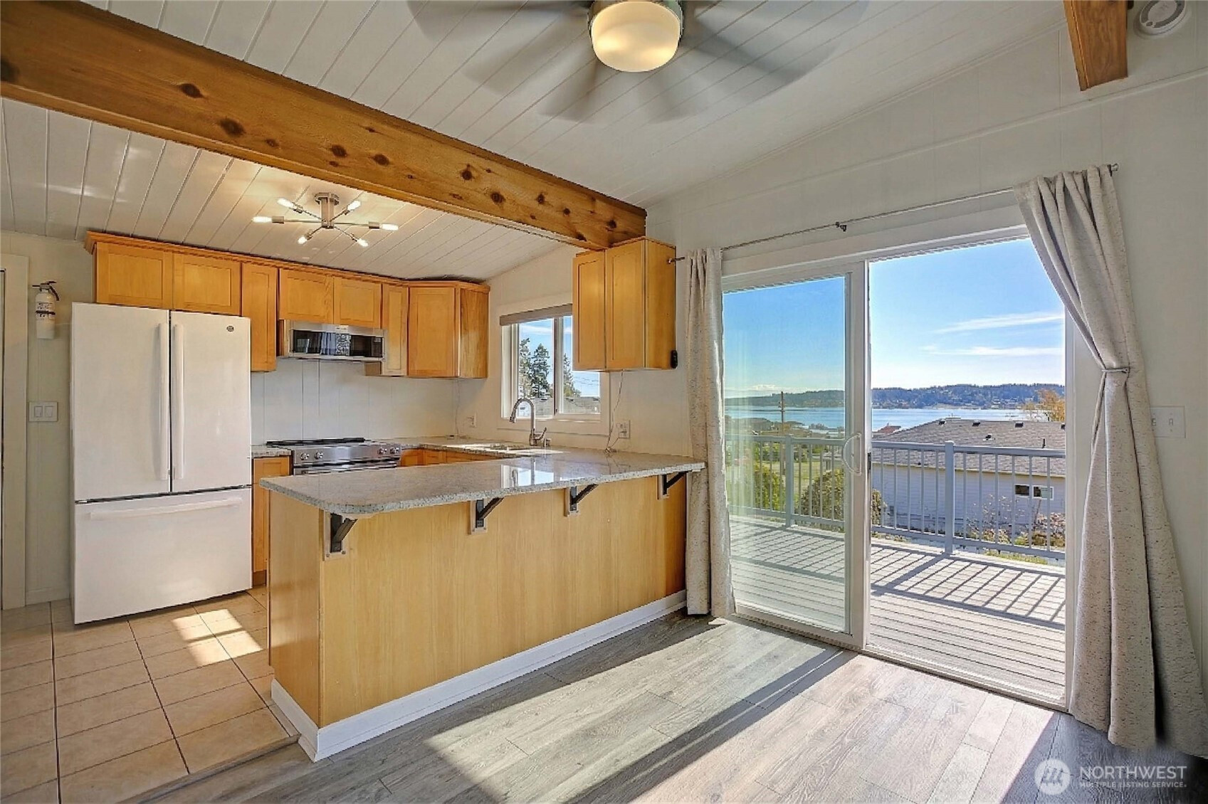 Charming Mid-Century Modern View Home on Camano’s Northwest Side. Enjoy coastal living with community beach access—perfect for crabbing, clamming, fishing, or sunset strolls along the shore. This updated home offers a spacious, light-filled floorplan ideal for full-time living or a relaxing getaway. Thoughtful updates include a newer roof with added insulation, updated flooring, and a cozy, efficient pellet stove. The open-beam and painted wood ceiling create that classic mid-century feel, while granite countertops and included appliances make it move-in ready. Step outside to a generous deck designed for outdoor dining and entertaining, overlooking a level, fully fenced backyard and stunning sunset views. A garage plus carport provide ample parking and storage.