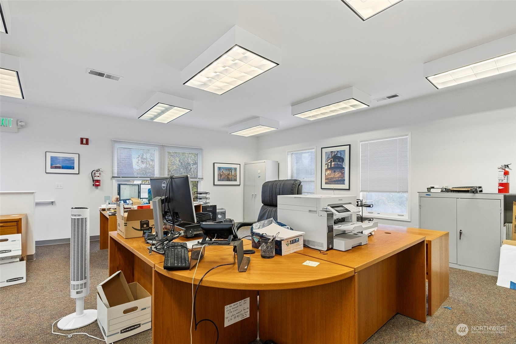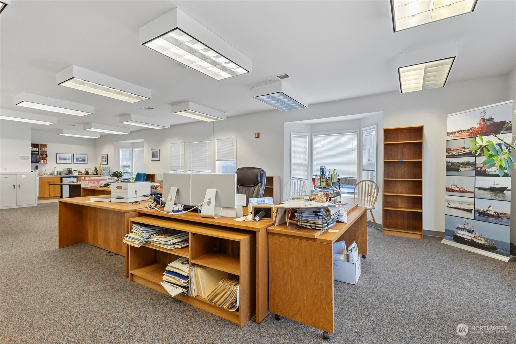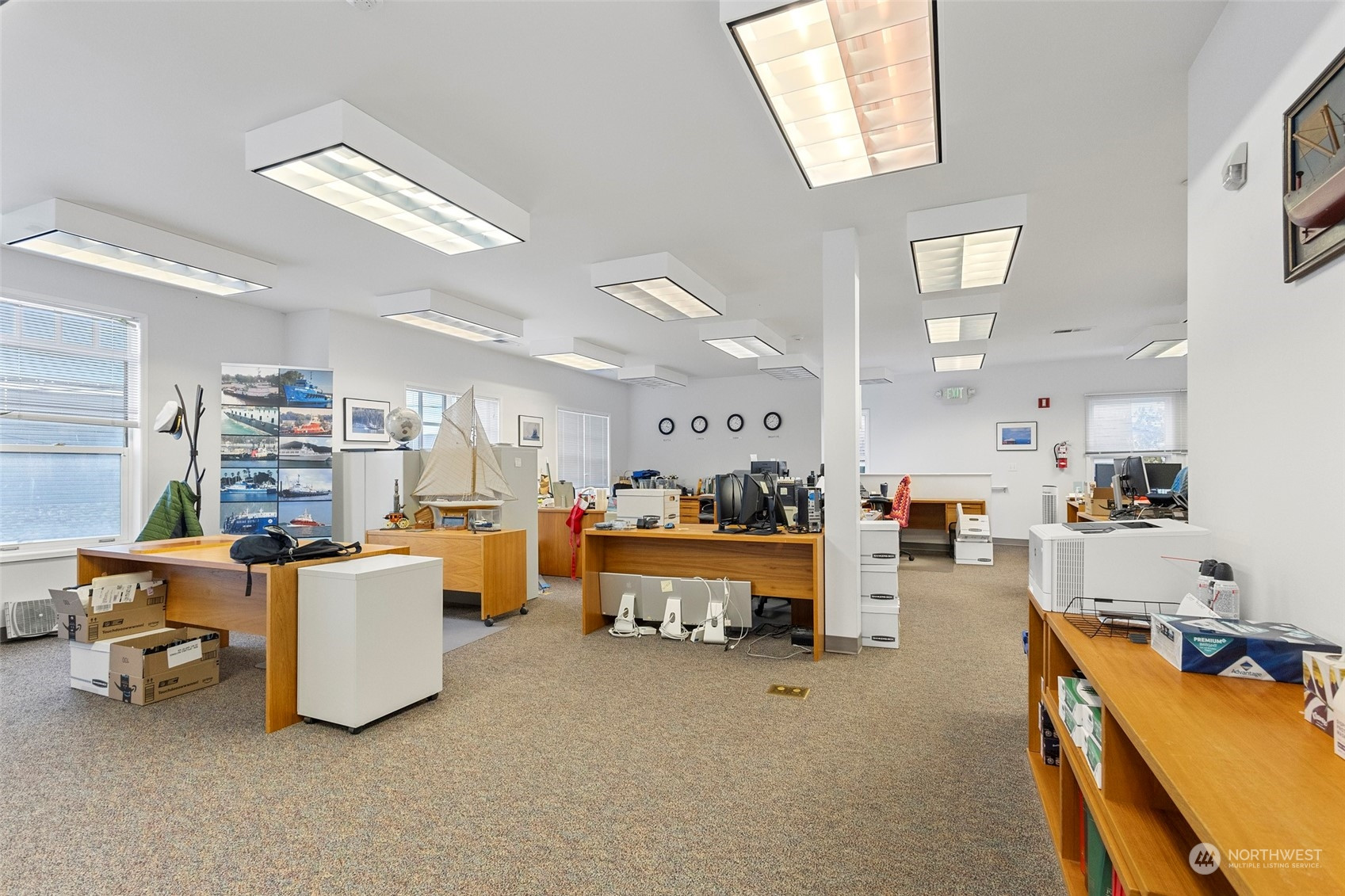 Large open office space with two bathrooms and kitchenette area. Server room separate with heating/cooling. Second floor office space with a view of Penn Cove. Space can be divided for two tenants. There are two stairwells and two ADA compliant bathrooms. Rent is $16.41 SF and NNN is $3.15 SF.