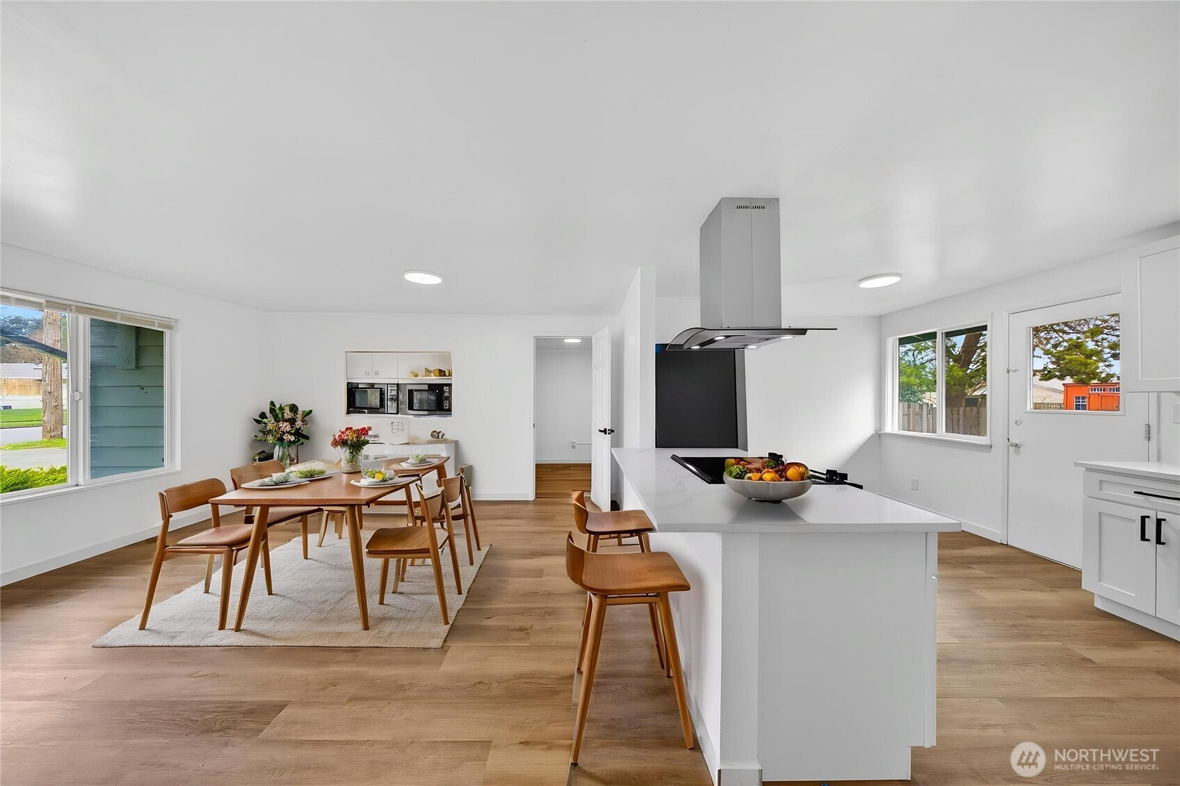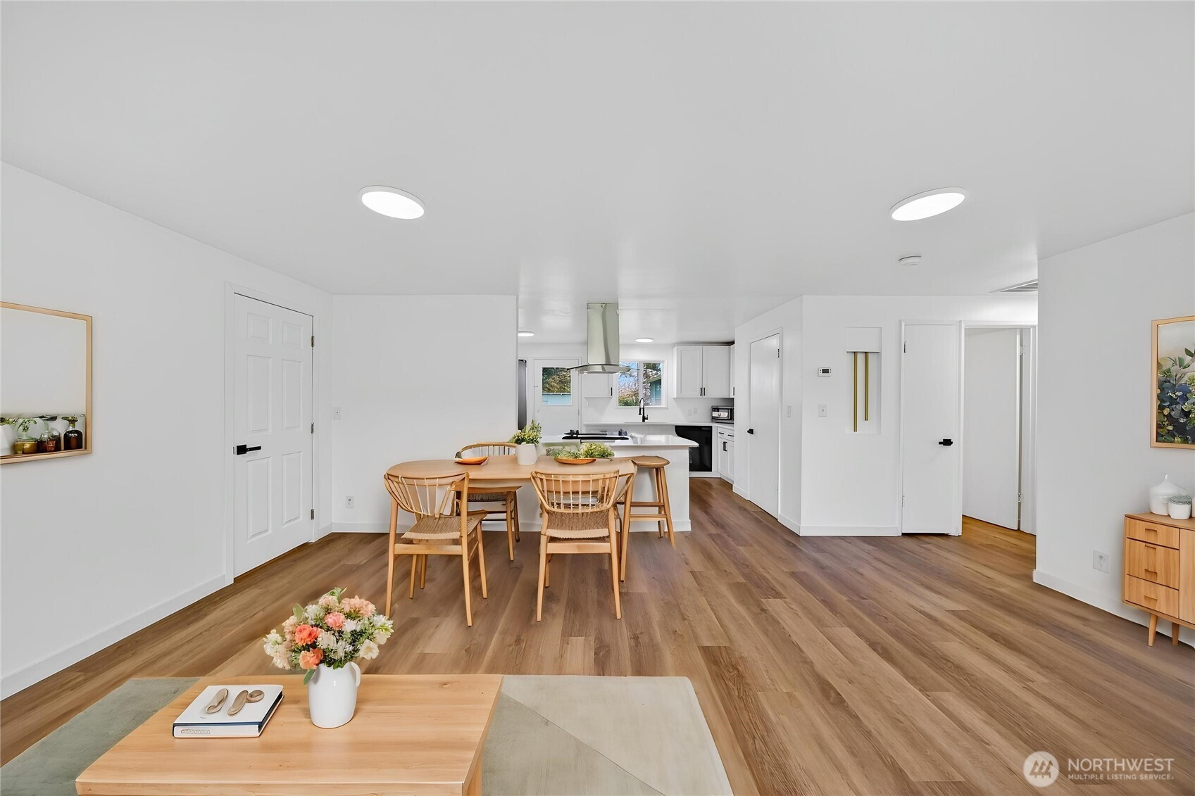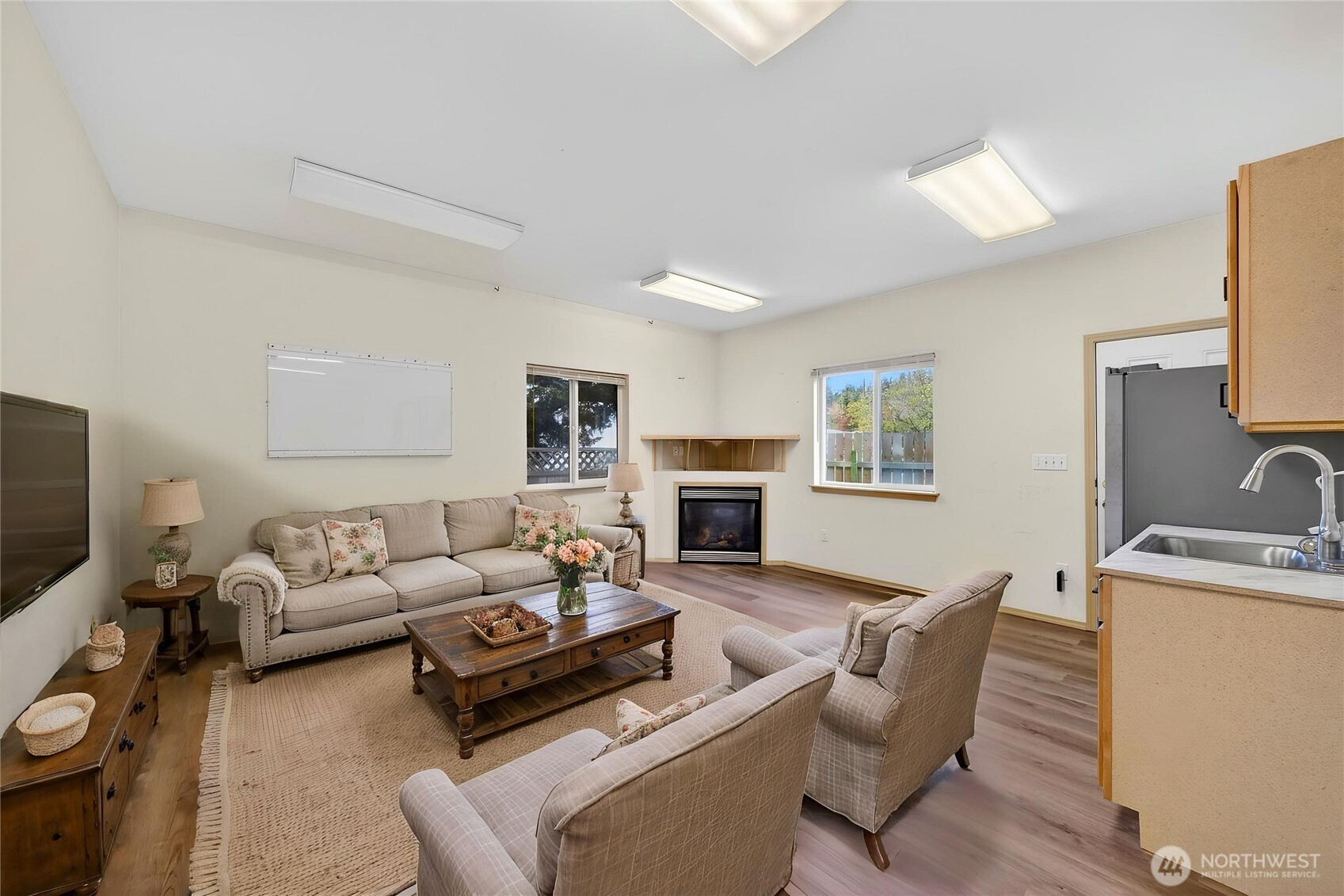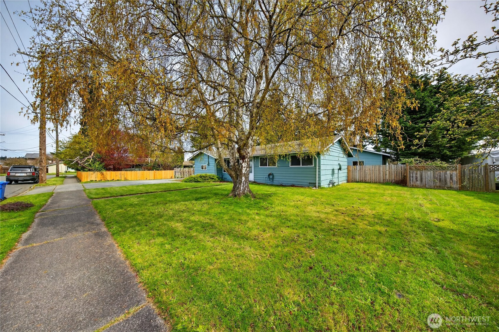 Move-in ready and refreshed, this charming single-level home offers comfort, space, and a location that makes everyday living easy. Step inside to a bright, open layout featuring updated flooring, fresh interior finishes, and a beautifully remodeled kitchen with crisp white cabinetry, modern hardware, sleek countertops, and an oversized island perfect for gathering, dining, or entertaining. The spacious living and dining areas flow seamlessly, filled with natural light and designed for both relaxed living and hosting. The updated bathroom showcases stylish tile work and contemporary fixtures, creating a clean, modern feel. Outside, enjoy a large, level yard with mature trees, plenty of room to play, garden, or expand your outdoor vision. The detached garage and extended driveway provide ample parking, storage, or workspace flexibility. A standout feature is the separate studio unit located with the garage, complete with a full bathroom and a semi-finished kitchenette—ideal for rental income, guests, or a private in-law suite. Ideally located near shopping, dining, schools, and waterfront access, you get the best of convenience and lifestyle right at your doorstep. This is a home you can step into with confidence and start enjoying immediately.