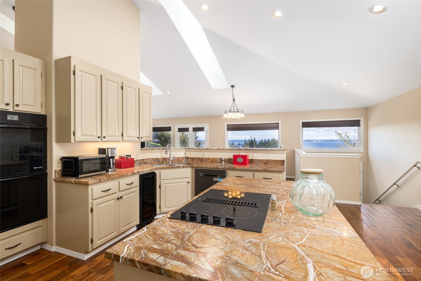 Never miss a sunset w/this absolutely gorgeous home w/unmatched panoramic views. Step into over 2800sqft of luxury w/endless features. Main level living w/5 piece primary suite, private deck entrance, and sizeable walk-in closet. Accompanied by large guest bed, office/den, and spacious guest bath. Adorned with vaulted ceilings, the dining, living, kitchen great room is full of natural light & features from granite, exotic wood floors, fireplace insert, & huge deck to enjoy views of Olympics, Whidbey & Saratoga Passage. Downstairs is a huge family room, bonus area, & full bath. Includes enormous storage room. Other features include, AC, Aluminum Roof, Skylights, Sprinkler System, Hot Tub, Fenced Yard, & Central Vac. Private Community Beach!