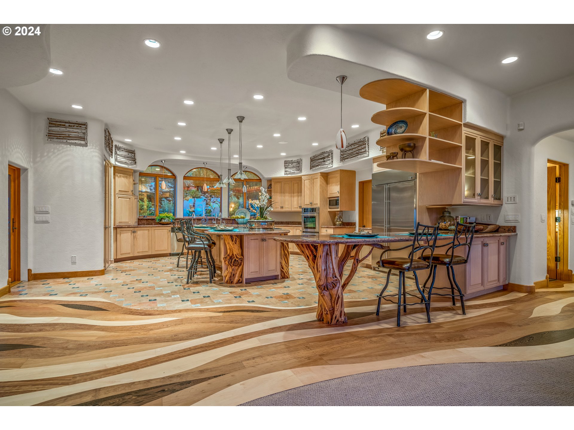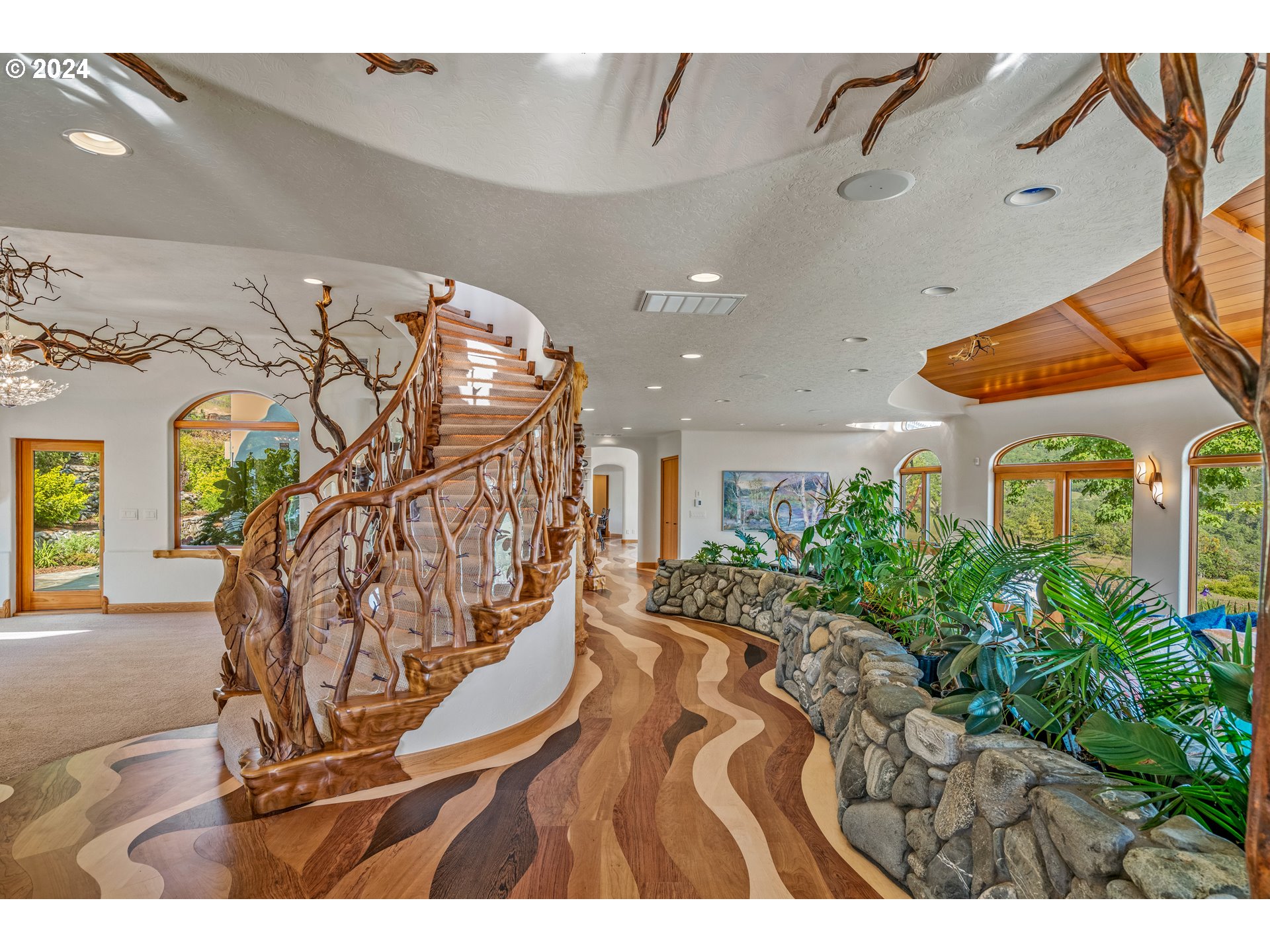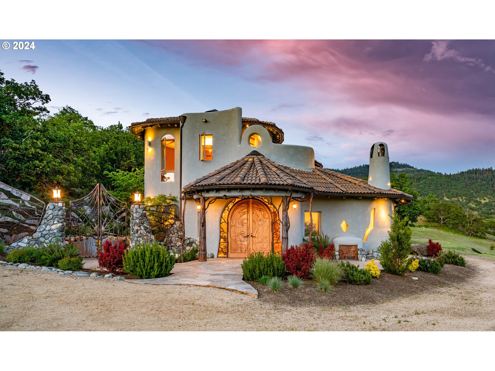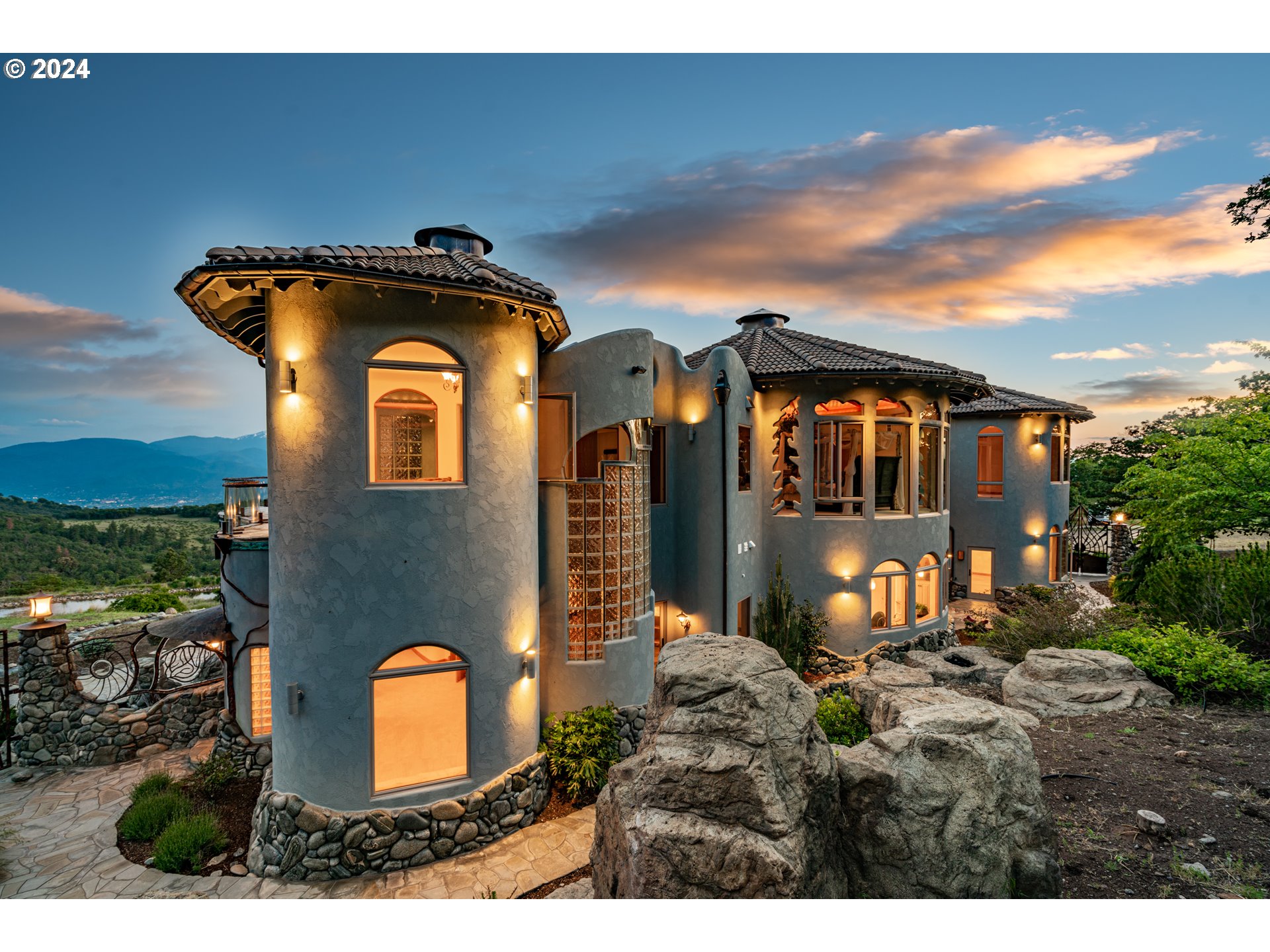 (503) 893-8874Centrally located along the west coast I-5 corridor, this spectacular one-of-a-kind home, on 700 awe-inspiring acres, offers magnificent sanctuary and adventure, as well as convenience. One of the most naturally beautiful regions of the country, this area of southern Oregon is known for a developing wine industry and phenomenal outdoor recreation opportunities. Characterized by four distinct seasons and mild winters, the climate is one of the most sought-after in North America. Designed to reflect and honor the majesty of this natural environment, this home sits on a high bench with open terraces that bring the view so close, you feel like you could reach out and touch it. Unique features like all rounded corners and smooth edges, a perfectly balanced use of the natural elements, and purposeful architectural design, create a remarkable effect, both peaceful and expansive. This home is beyond custom: it is a work of art. This property is an unparalleled place to rejuvenate and become inspired. A few minutes drive from I-5, the property immediately embraces you in a sanctuary of wilderness, where magnificent elk herds can be seen roaming the rolling meadows and oak savanas. Two enormous rock faces rise from a blanket of green and greet you as you gently climb higher and approach this spectacular home. This astonishing home is one of a kind. Earthen tiles cascade down four distinct, rounded rooves crowned with small cupolas, capturing the geometrical beauty of Byzantine architecture. Beneath the tiles, the outer walls are smooth stucco, accented with a myriad of windows, rounded and flowing, reminiscent of the graceful and curvaceous architecture of Antoni Gaudi. Domes and crests of stucco stand against the sky, giving the impression of a white-washed chapel on the island of Mykonos. Despite its references to world-class art and architecture, this home also has its own distinct and extraordinary style.