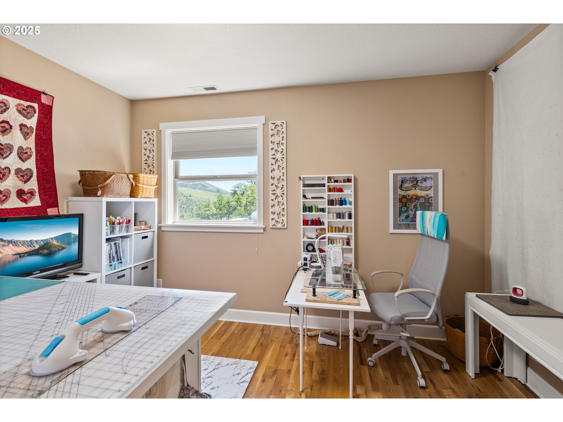 Experience refined country living on just over 23 acres of rolling green hills, and panoramic mountain views. Immaculately maintained, this exceptional home welcomes you with a wide covered porch, perfect for taking in serene vistas from sunrise to sunset. Inside, beautiful hardwood floors flow throughout the open-concept design. The vaulted great room features a striking fireplace and expansive windows that bring the outdoors in. The gourmet kitchen is a showpiece, complete with sleek granite countertops, an island with seating, stainless steel appliances, and seamless flow to the formal dining room, which shows off custom built-in cabinetry and a door to the patio for effortless indoor-outdoor entertaining. The spacious primary suite is thoughtfully placed at one end of the home, featuring a walk-in closet, luxurious bath with double sinks and walk-in shower, a door to the back patio, plus a private exercise room. Two additional bedrooms and a full bath with a jetted tub and shower are located at the opposite end for privacy and comfort. A dedicated office with custom built-ins and a fully equipped laundry room with sink and storage add everyday convenience. The oversized two-car garage includes a workspace and half bath, with an adjacent mudroom entry. A designated RV parking area with hookups enhances the property’s versatility. Outside, enjoy a covered patio, manicured garden areas, and a full sprinkler system, all set against a backdrop of nature’s finest. This is a rare opportunity to own a peaceful retreat that’s just minutes from hiking trails, dining, 2 wineries, and Emigrant Lake County Park for camping, fishing, and swimming. Just 8 minutes from the shopping center. A true slice of paradise without sacrificing proximity to modern amenities.