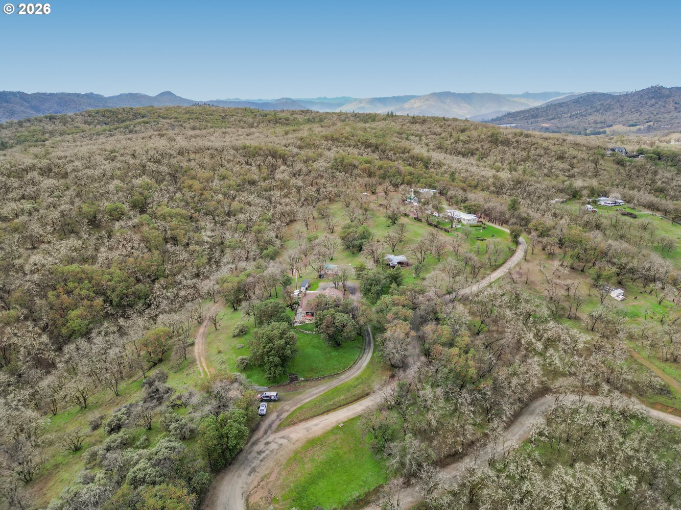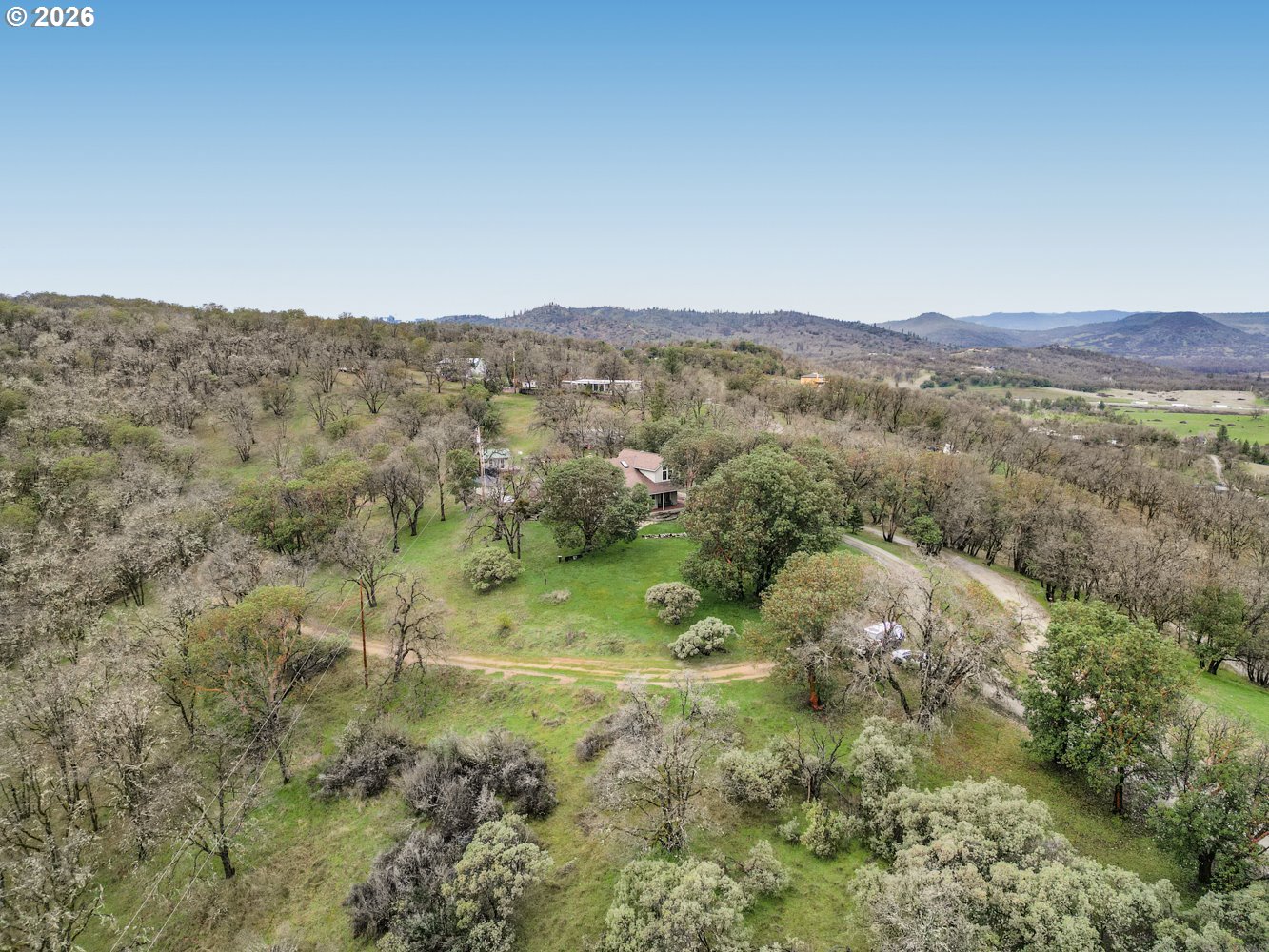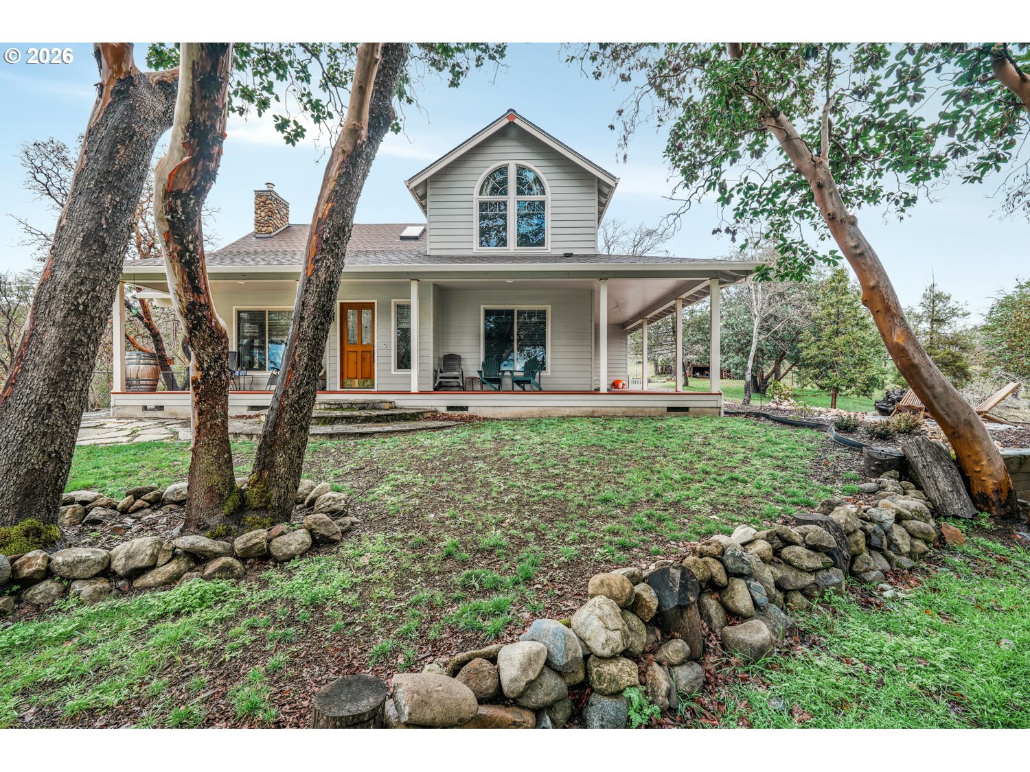 Perched high above the valley on 16.81 private acres, this custom-crafted cabin captures breathtaking views of Table Rock, Mt. McLoughlin, and Mt. Ashland from its expansive 44' x 31' wraparound covered porch. The peaceful setting offers wide-open vistas, abundant wildlife including deer and wild turkey, and even a historic 1800s gold mine that adds character and story to this one-of-a-kind property. Inside, warm hardwood floors span the main living areas, while large windows fill the home with natural light. The inviting living room features a stone wood-burning fireplace and soaring vaulted, beamed ceiling. Just off the living space, the dining area has sliding doors to the covered patio making it perfect for indoor-outdoor living. The kitchen is thoughtfully designed with granite countertops, stainless steel appliances, an island with bar seating and lots of prep space. A main-level bedroom with a double closet and a full bathroom offers flexibility for guests or multi-generational living. There's a convenient laundry room on the main level with a sink and built ins for storage. Upstairs, a loft with a skylight and built-in bookshelves creates an ideal reading nook or home office. The spacious primary suite showcases vaulted ceilings, a walk-in closet, and a private bath complete with dual vanities and a glass walk-in shower. Additional features include a detached bonus room with a vaulted ceiling that's ideal for a studio, office, or fitness space, a distinctive two-car garage that opens on three sides to function as a breezeway, and a detached shop divided into three separate rooms for projects, storage, or workspace. A generous dog run is ready for your four-legged companions. Enjoy the tranquility of country living with the convenience of being just 15 minutes from local restaurants and the Rogue Valley International–Medford Airport. *See updates list in documents.