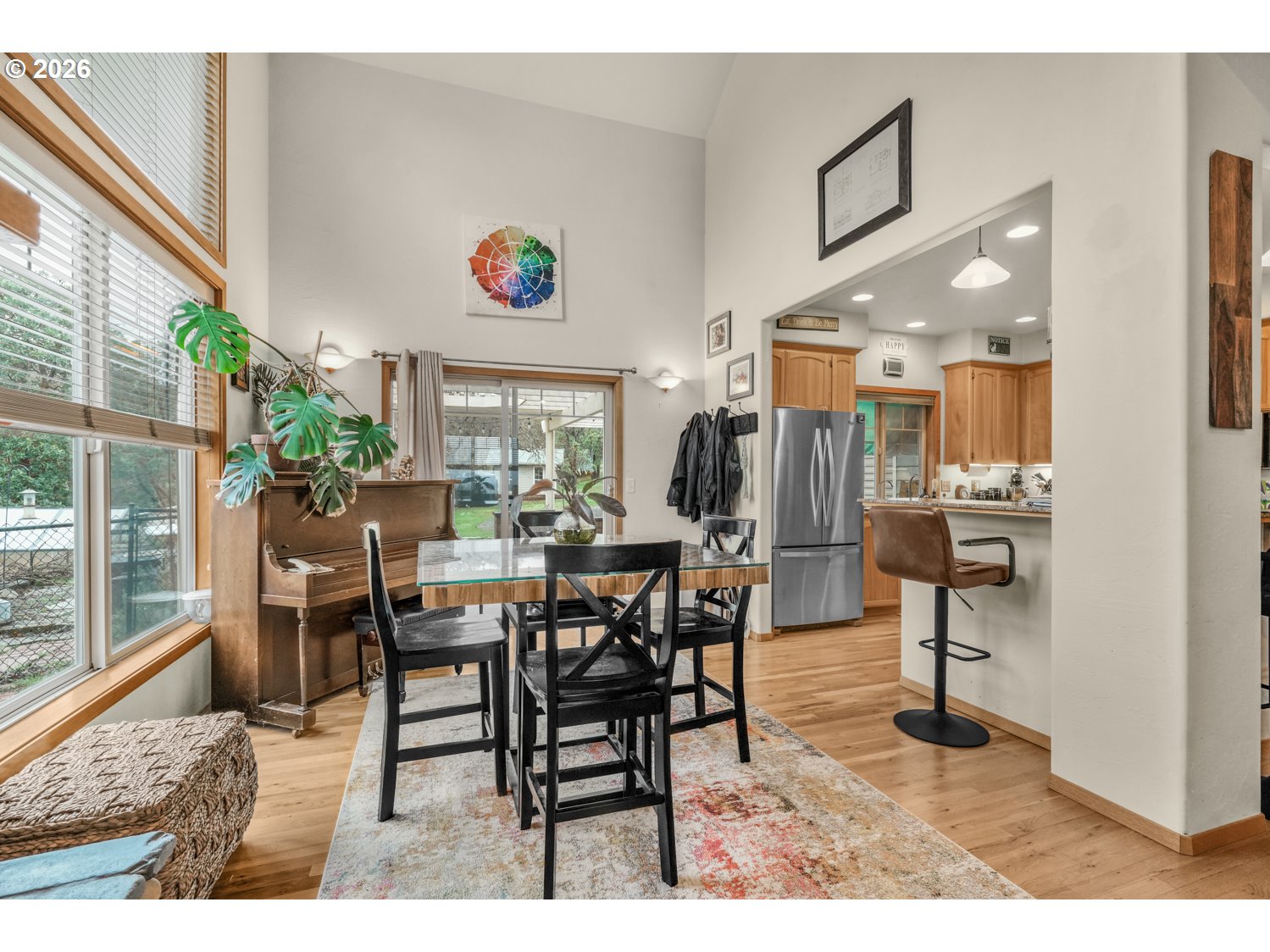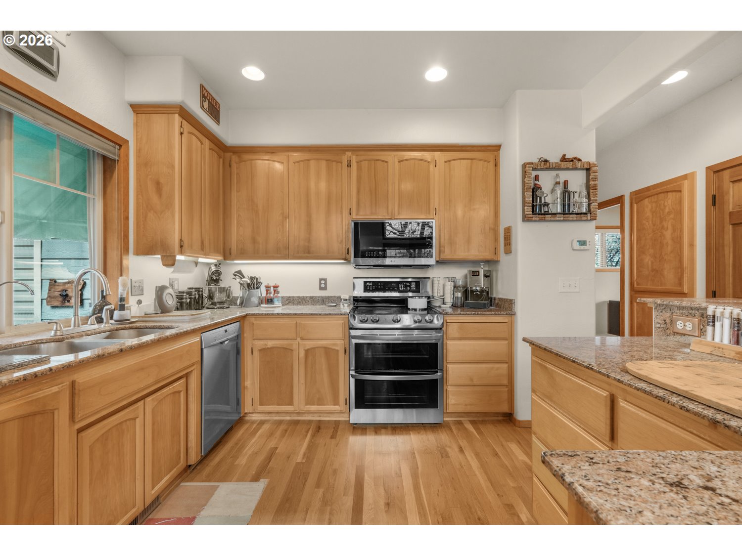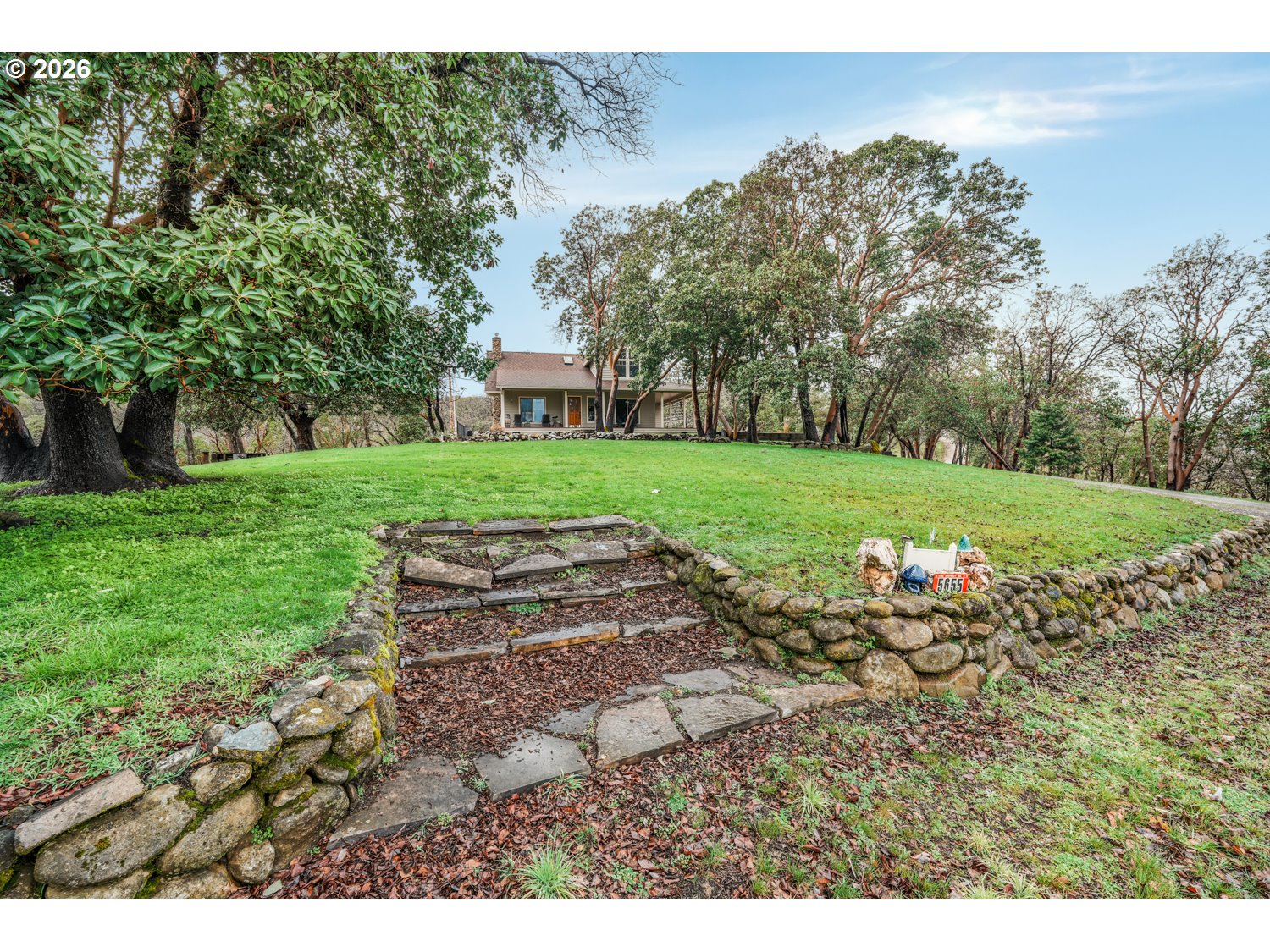 Perched high above the valley on 16.81 private acres, this custom-crafted cabin captures breathtaking views of Table Rock, Mt. McLoughlin, and Mt. Ashland from its expansive 44' x 31' wraparound covered porch. The peaceful setting offers wide-open vistas, abundant wildlife including deer and wild turkey, and even a historic 1800s gold mine that adds character and story to this one-of-a-kind property. Inside, warm hardwood floors span the main living areas, while large windows fill the home with natural light. The inviting living room features a stone wood-burning fireplace and soaring vaulted, beamed ceiling. Just off the living space, the dining area has sliding doors to the covered patio making it perfect for indoor-outdoor living. The kitchen is thoughtfully designed with granite countertops, stainless steel appliances, an island with bar seating and lots of prep space. A main-level bedroom with a double closet and a full bathroom offers flexibility for guests or multi-generational living. There's a convenient laundry room on the main level with a sink and built ins for storage. Upstairs, a loft with a skylight and built-in bookshelves creates an ideal reading nook or home office. The spacious primary suite showcases vaulted ceilings, a walk-in closet, and a private bath complete with dual vanities and a glass walk-in shower. Additional features include a detached bonus room with a vaulted ceiling that's ideal for a studio, office, or fitness space, a distinctive two-car garage that opens on three sides to function as a breezeway, and a detached shop divided into three separate rooms for projects, storage, or workspace. A generous dog run is ready for your four-legged companions. Enjoy the tranquility of country living with the convenience of being just 15 minutes from local restaurants and the Rogue Valley International–Medford Airport. *See updates list in documents.