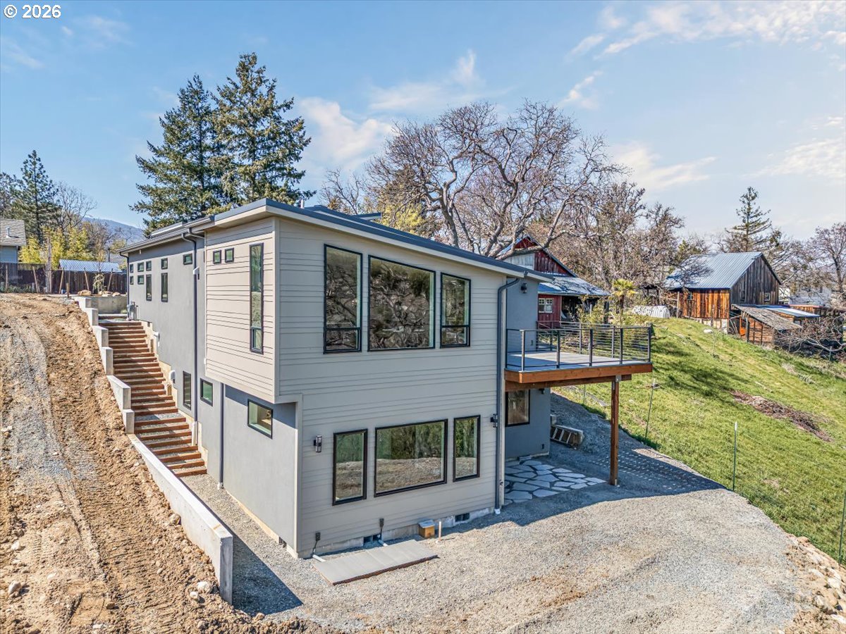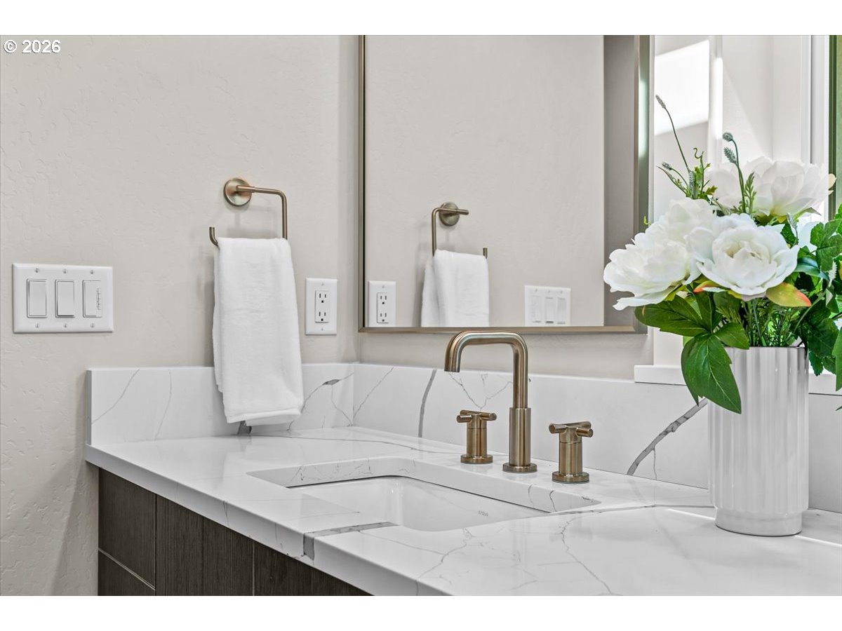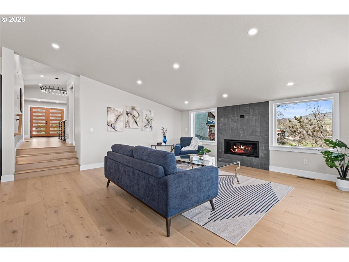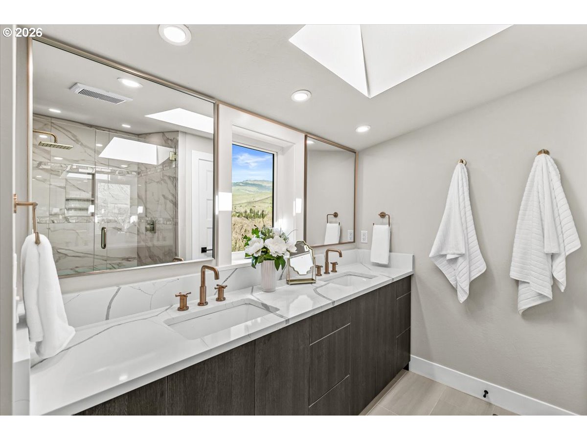 Platinum Earth Advantage home just minutes from downtown, offering 2,750 sq ft of thoughtfully designed 4BR, 3BA + office living space with stunning views of Grizzly Peak and the Cascades. This light-filled residence features 12’ ceilings, expansive windows, quartz surfaces, designer lighting, and blonde wide-plank hardwood floors. The main level features two ensuite bedrooms, highlighted by a luxurious primary suite with radiant heated floors, dual shower system, and two walk-in closets. The chef’s kitchen boasts an 11-ft island, double ovens, gas cooktop, beverage fridge, and walk-in pantry. Enjoy seamless indoor-outdoor living with an 8’ slider to a spacious view deck. Lower level offers 2 bedrooms, office, second laundry, and potential for separate living. Professionally landscaped, private setting with detached 2-car garage, EV charging, and energy-efficient 2-zone HVAC system. Home designed by Vadim Agakhanov.