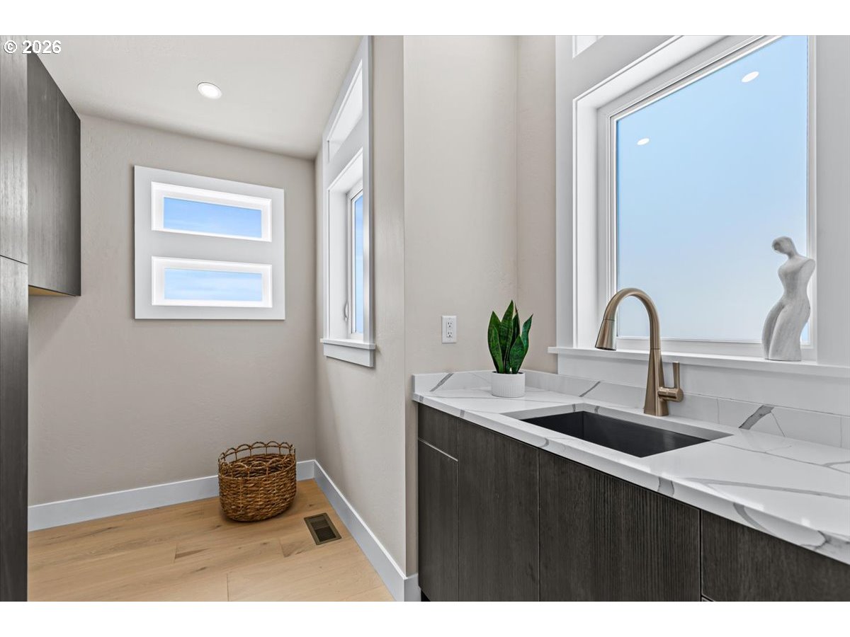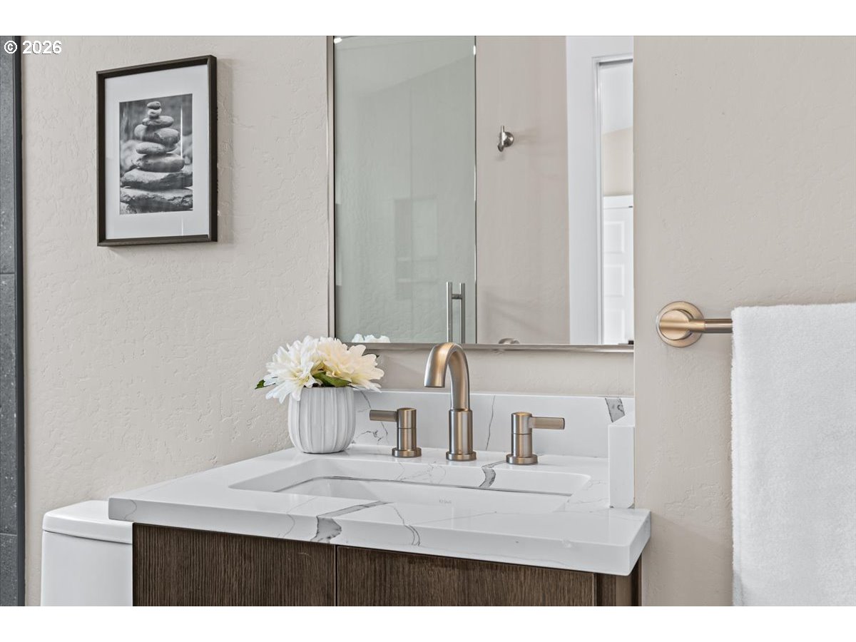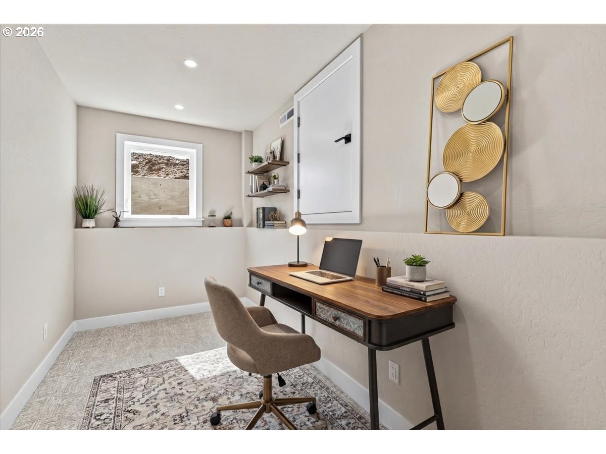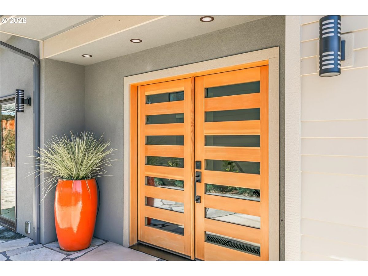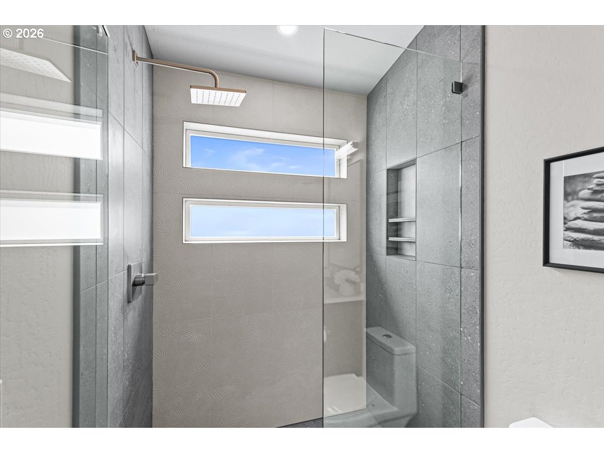 Platinum Earth Advantage home just minutes from downtown, offering 2,750 sq ft of thoughtfully designed 4BR, 3BA + office living space with stunning views of Grizzly Peak and the Cascades. This light-filled residence features 12’ ceilings, expansive windows, quartz surfaces, designer lighting, and blonde wide-plank hardwood floors. The main level features two ensuite bedrooms, highlighted by a luxurious primary suite with radiant heated floors, dual shower system, and two walk-in closets. The chef’s kitchen boasts an 11-ft island, double ovens, gas cooktop, beverage fridge, and walk-in pantry. Enjoy seamless indoor-outdoor living with an 8’ slider to a spacious view deck. Lower level offers 2 bedrooms, office, second laundry, and potential for separate living. Professionally landscaped, private setting with detached 2-car garage, EV charging, and energy-efficient 2-zone HVAC system. Home designed by Vadim Agakhanov.