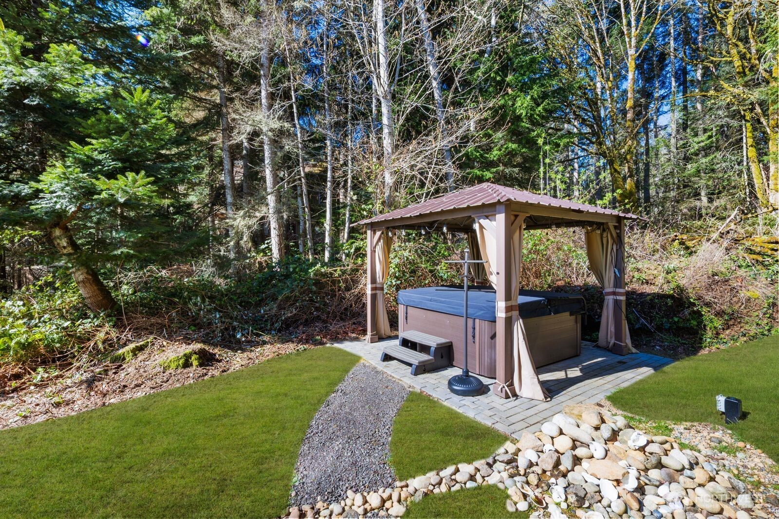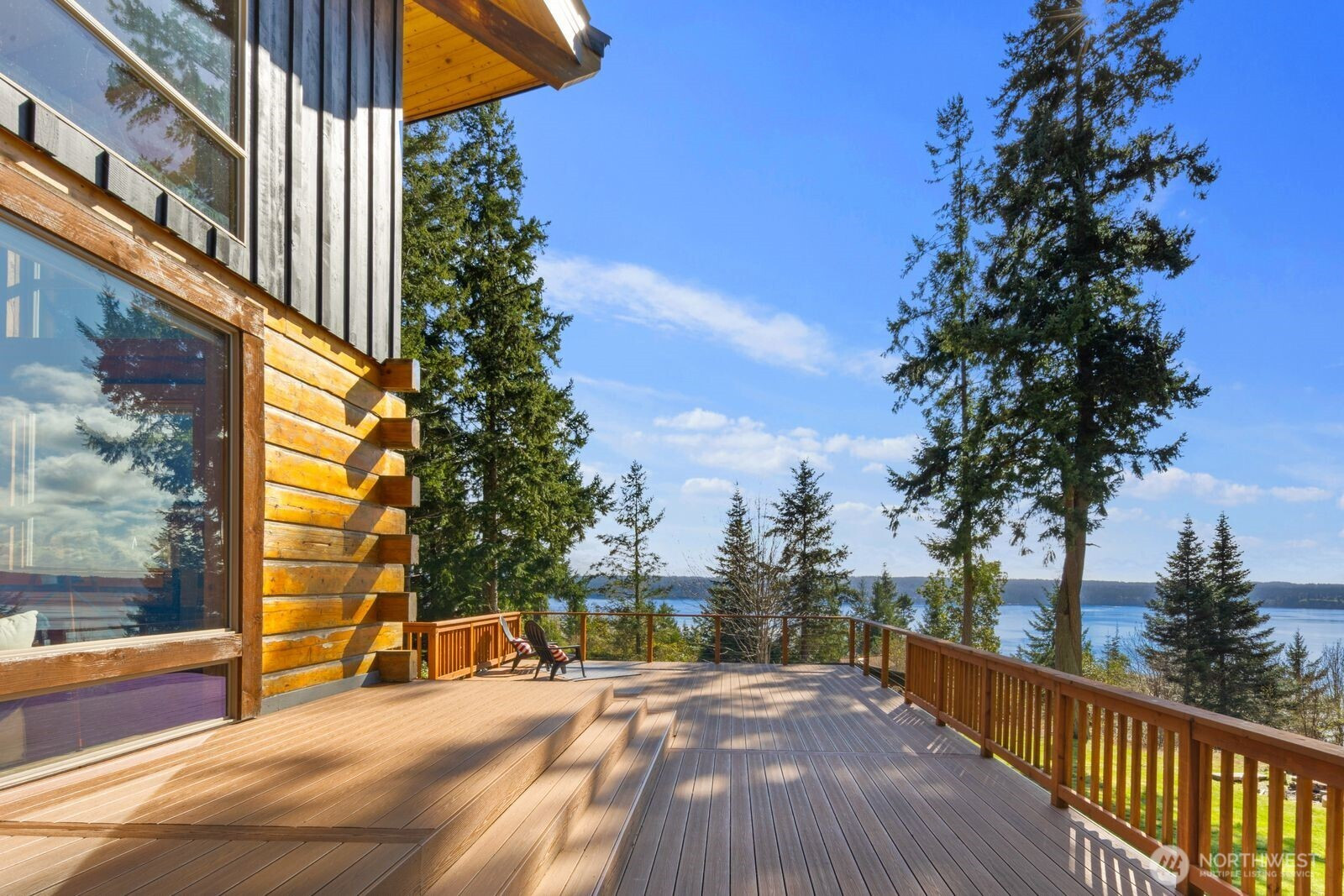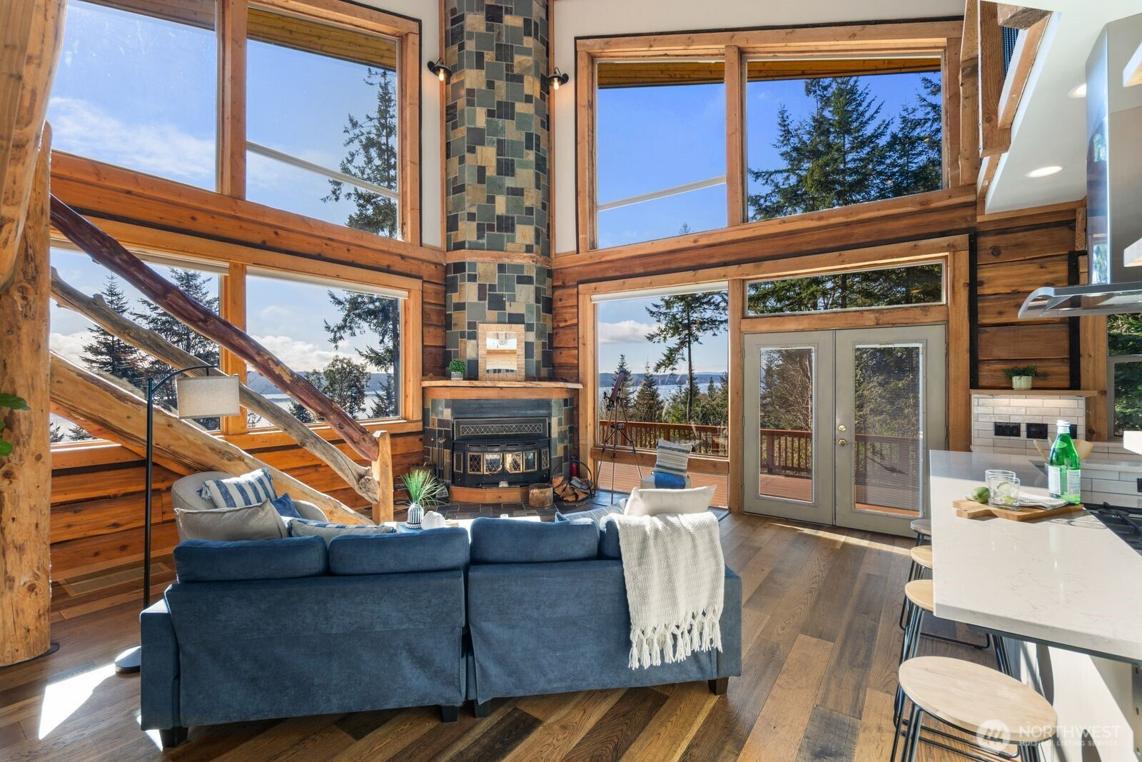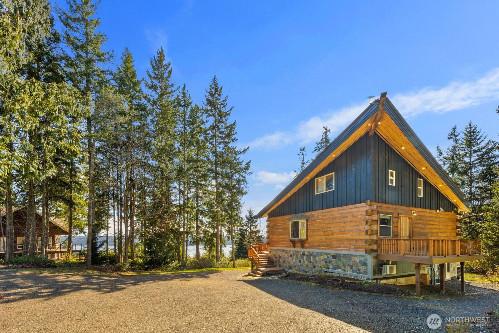Rare waterfront opportunity in Port Ludlow! Set on 5.9 private acres with frontage on Hood Canal, this stunning 3,460 SF home offers breathtaking views of Mount Rainier, the canal, and surrounding natural beauty. Built in 2013 and thoughtfully updated with a new kitchen, siding, expansive deck, hot tub, propane range, and mini-splits for comfort, this home blends modern upgrades with rustic Northwest living. The light-filled main level features an open layout with with conveniently located washer/dryer in the pantry for everyday ease. Second floor with huge loft/bonus space with a stunning view of Mount Rainier and Hood Canal, second primary bedroom with large closet and 3/4 en suite bath. Daylight basement offers a separate entrance and full kitchen—ideal for an ADU, guest suite, or income-generating opportunity. Outdoor living shines with beach access, firepit, water feature, and multiple spaces to relax or entertain while taking in the scenery. Ample covered parking with two carports accommodates up to 6 vehicles, plus additional storage with a detached shed. A rare combination of acreage, waterfront, views, and versatility—this is Pacific Northwest living at its finest!