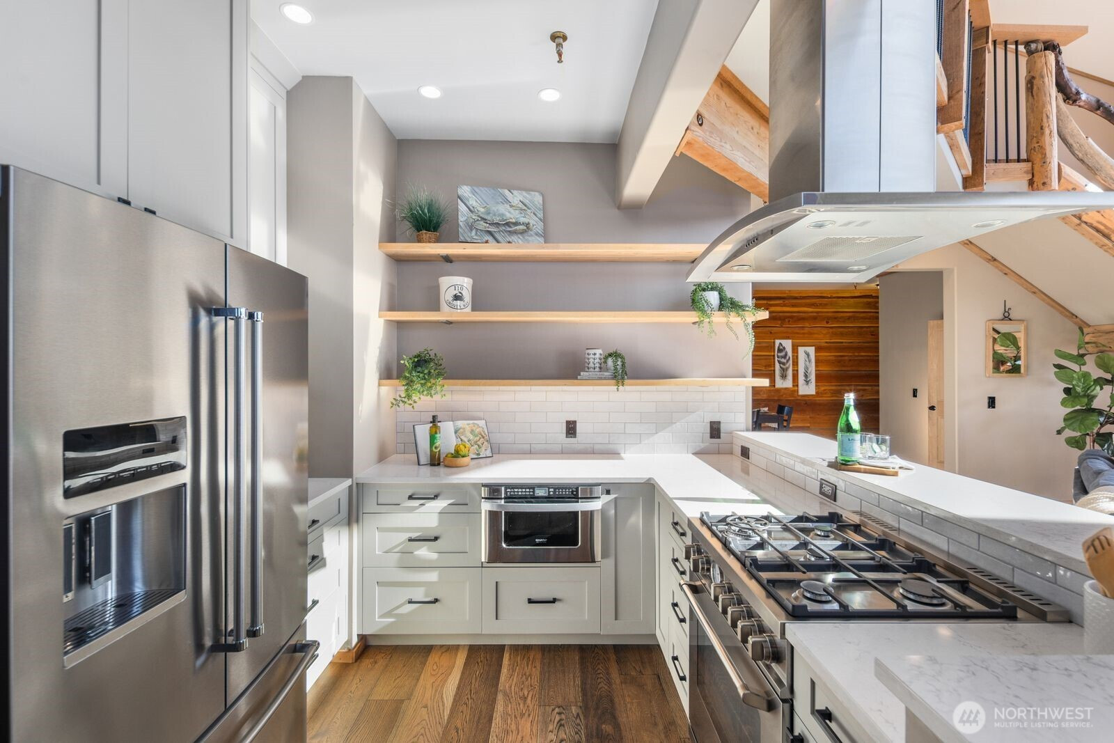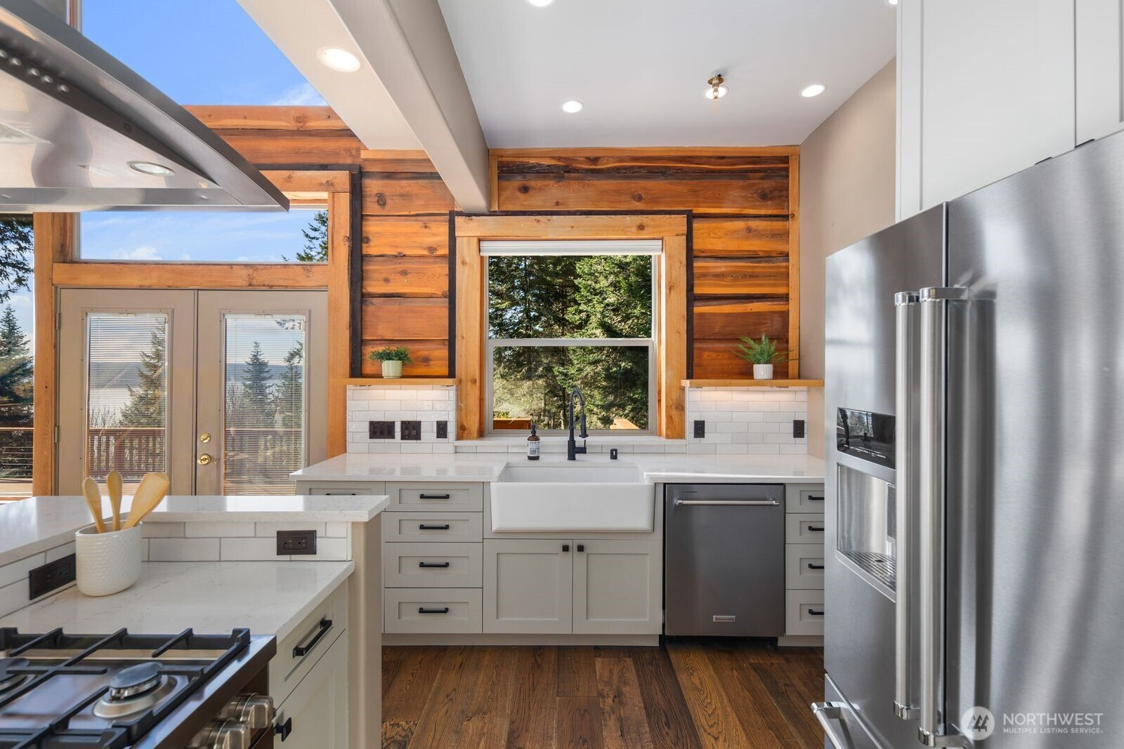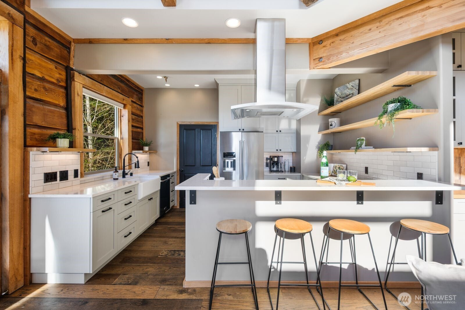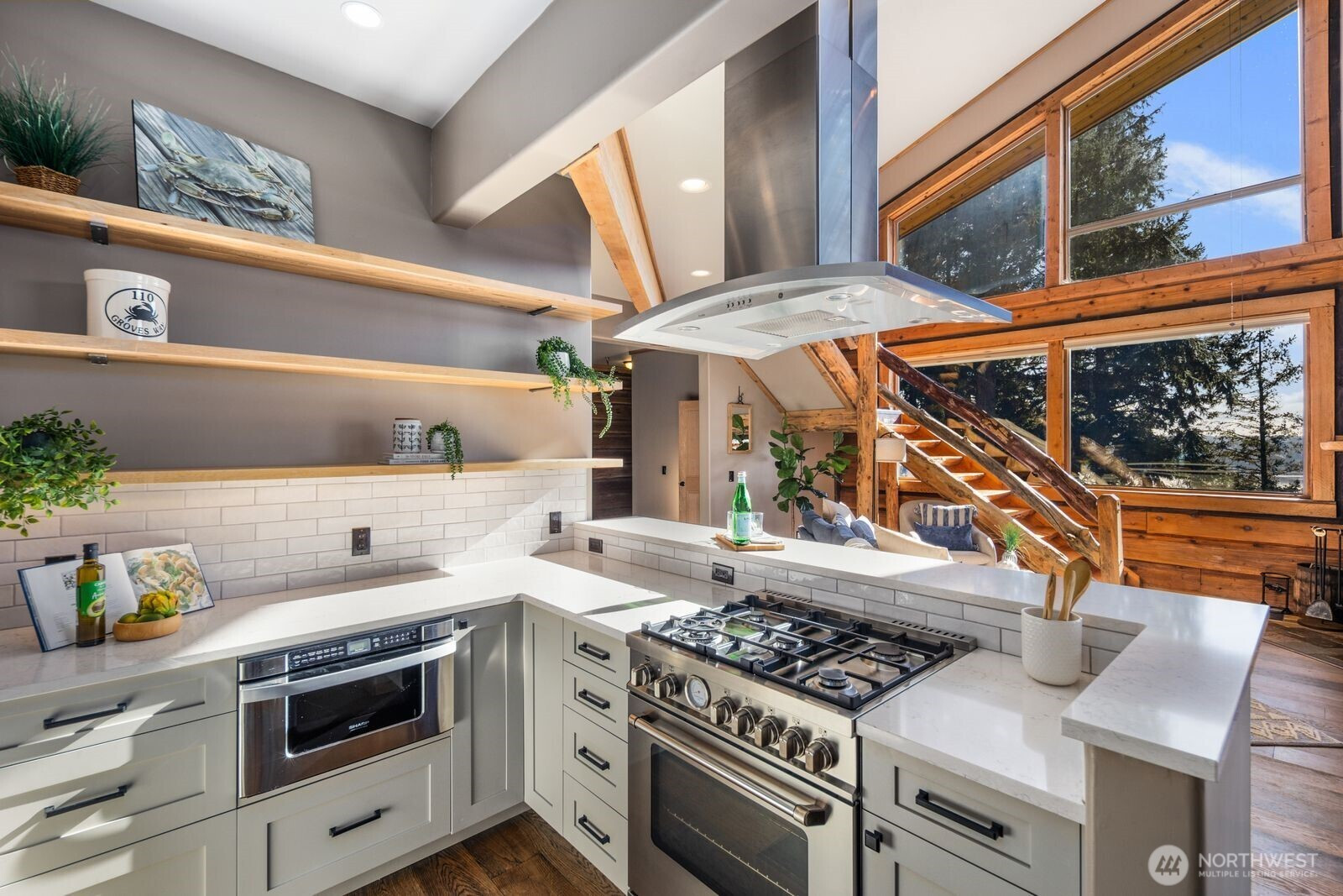 Rare waterfront opportunity in Port Ludlow! Set on 5.9 private acres with frontage on Hood Canal, this stunning 3,460 SF home offers breathtaking views of Mount Rainier, the canal, and surrounding natural beauty. Built in 2013 and thoughtfully updated with a new kitchen, siding, expansive deck, hot tub, propane range, and mini-splits for comfort, this home blends modern upgrades with rustic Northwest living. The light-filled main level features an open layout with with conveniently located washer/dryer in the pantry for everyday ease. Second floor with huge loft/bonus space with a stunning view of Mount Rainier and Hood Canal, second primary bedroom with large closet and 3/4 en suite bath. Daylight basement offers a separate entrance and full kitchen—ideal for an ADU, guest suite, or income-generating opportunity. Outdoor living shines with beach access, firepit, water feature, and multiple spaces to relax or entertain while taking in the scenery. Ample covered parking with two carports accommodates up to 6 vehicles, plus additional storage with a detached shed. A rare combination of acreage, waterfront, views, and versatility—this is Pacific Northwest living at its finest!