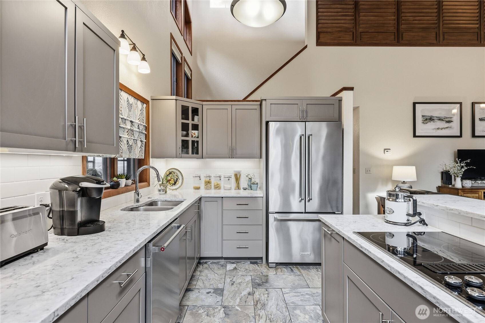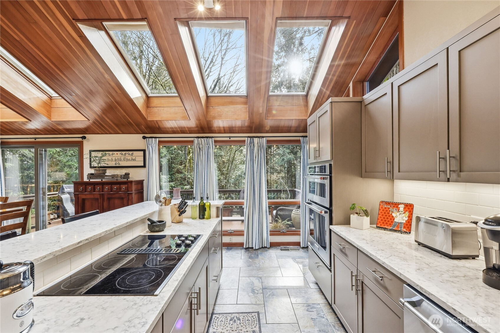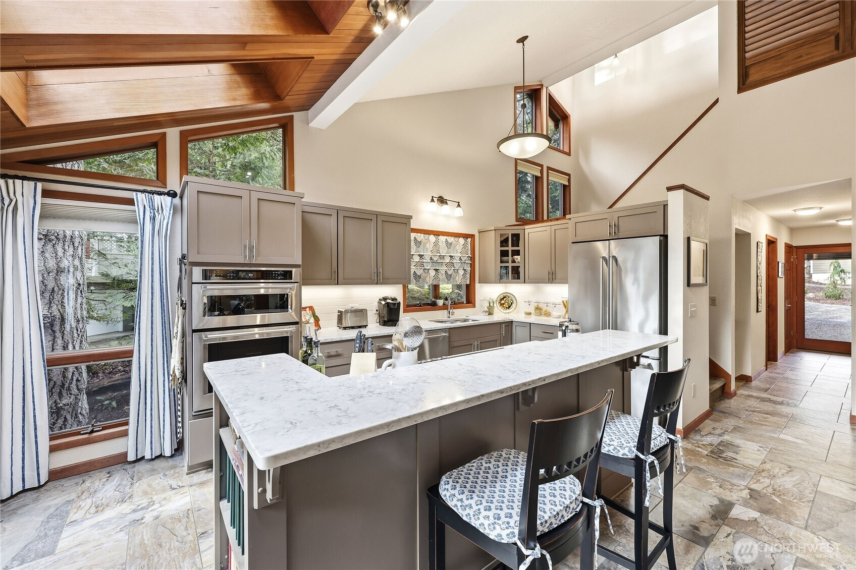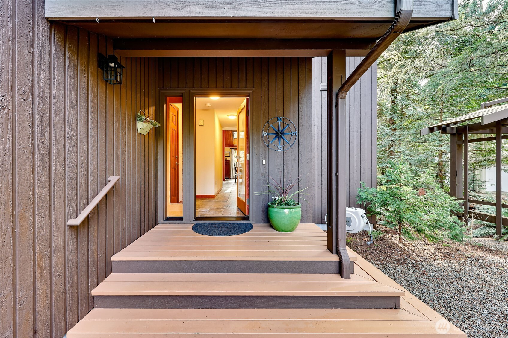 Welcome to this light-filled NW Contemporary gem nestled in a serene & peaceful wooded setting in desirable Port Ludlow! Open-concept living w/vaulted ceilings plus extensive wood-wrapped windows & skylights bring the outdoors in, enfolding you in a cozy environment you will want to call home. The living room features a stone-surround electric fireplace for those cold winter nights. The completely renovated kitchen w/new tile flooring features high-end stainless appliances, quartz countertops & a thoughtful layout that includes bar space for dining w/additional dining space adjacent. The main floor also features a large deck perfect for al fresco dining & entertaining. In addition, there is a good-size bedroom plus a renovated ¾ bath w/walk-in shower & washer/dryer on the main floor. The light-filled primary suite upstairs is expansive in size, features a renovated full bath & includes a walk-in closet. The lower level includes a bedroom, ¾ bath, a family/media room plus craft or office space. There are also new interior/exterior hardwood doors. Access to the lower level deck, terraces, & the beautiful wooded site beyond is from the lower level or via outside stairs. The green belt space between neighbors adds a lovely feeling of privacy for this home. The site also features a darling playhouse/garden shed & the single-car garage has plenty of room for storage. Port Ludlow amenities include golf course, clubhouse, swimming pools, athletic courts & more. Welcome home!