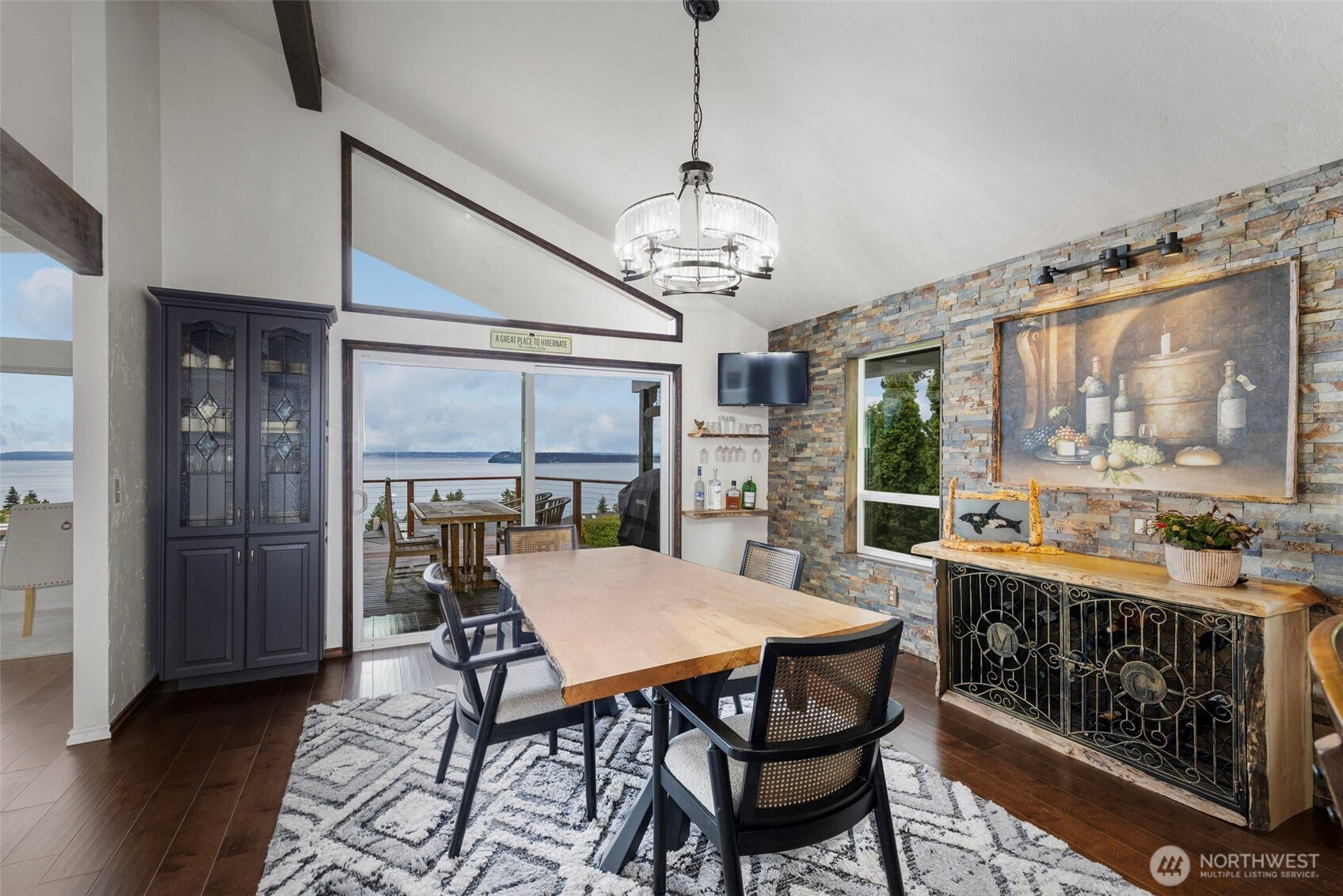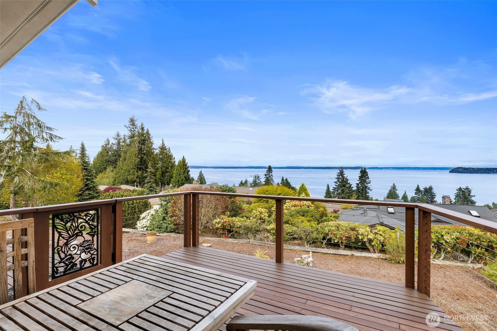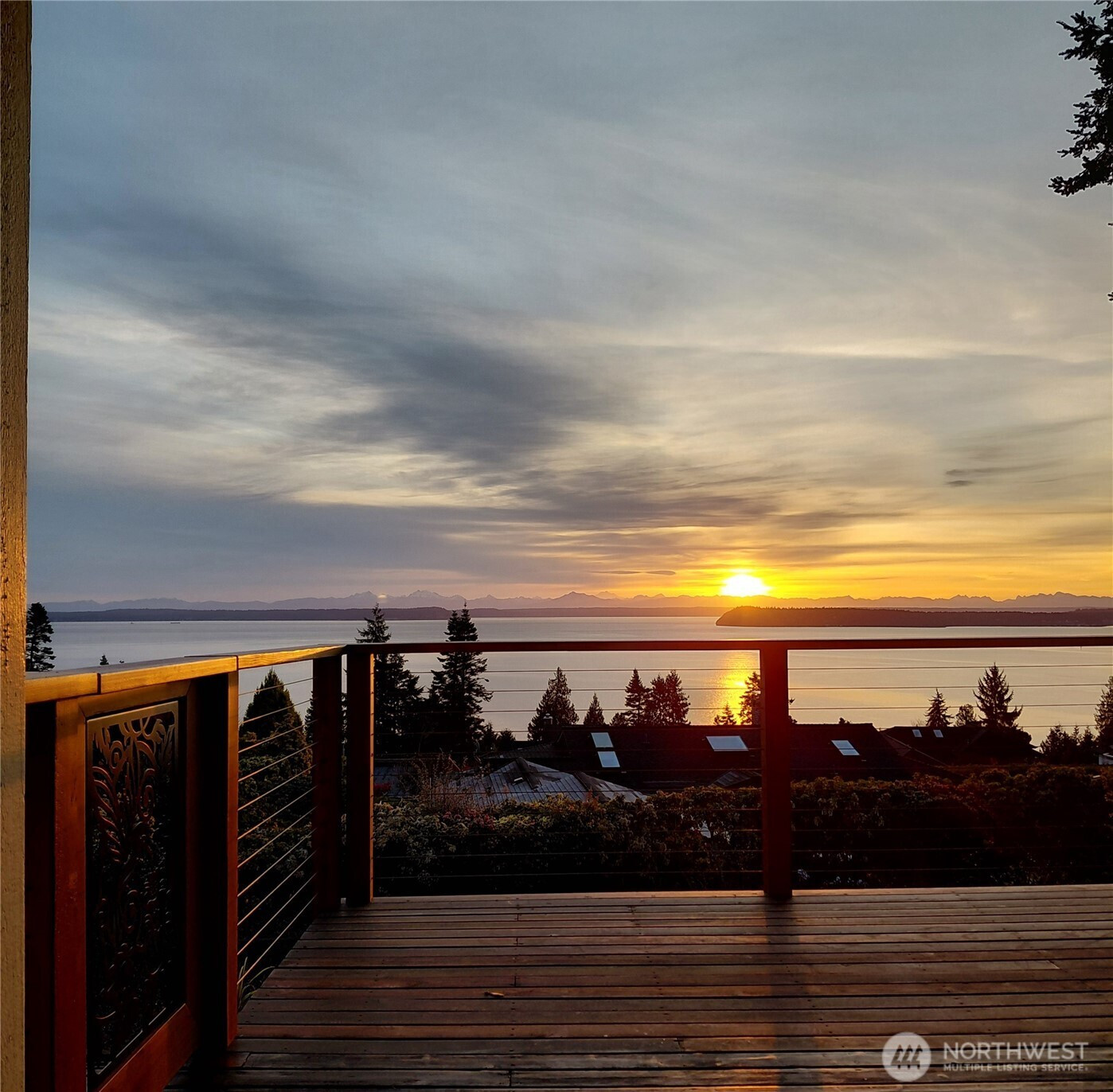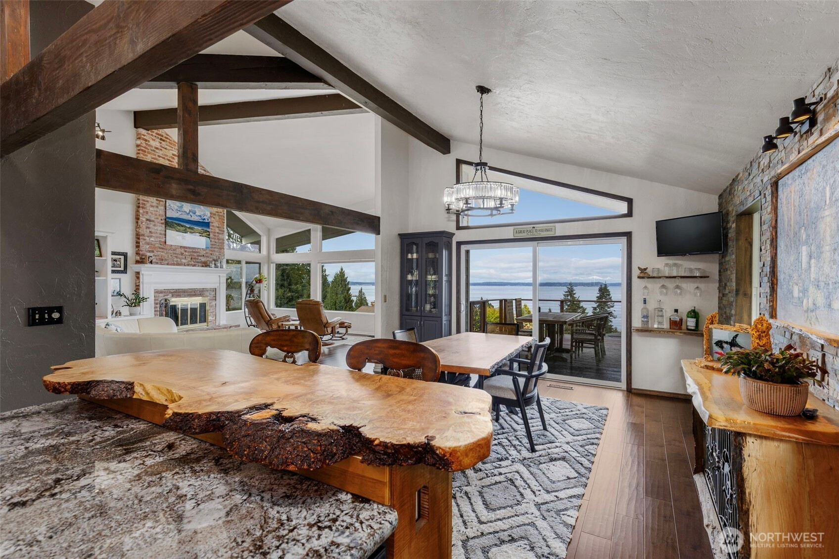 Discover a stunning view home in Port Ludlow capturing breathtaking 160° panoramic views of Admiralty Inlet, Puget Sound and the Cascade Mountains. This architecturally inspired residence blends artistic design with everyday comfort, featuring vaulted ceilings, engineered hardwood floors, and expansive walls of windows that flood the home with natural light and showcase unforgettable sunrise vistas. The chef’s kitchen is a showpiece with a one of a kind live-edge breakfast bar, built-in live-edge wine bar, and seamless flow to the dining area and covered deck—perfect for year-round indoor-outdoor entertaining. The main-level primary suite offers a private retreat with custom art feature wall, its own secluded deck, en-suite with soaking tub, tiled walk-in shower & heated floors. The lower-level walk-out basement is ideal for multi-generational living, guests, or flexible use, featuring two additional bedrooms, a spacious living room, wet and dry bar, and an updated bathroom. The private over-the-edge home theater with built-in seating and surround sound creates an exceptional entertainment experience! Settle in for the drama! Outside, enjoy easy-care landscaping, multiple view decks & built-in firepit—perfect for relaxing under the stars. Located in the heart of Port Ludlow, this home offers a rare combination of luxury, privacy, and Pacific Northwest lifestyle with world-class views, outdoor recreation, marina access, private club, and nearby golf amenities.