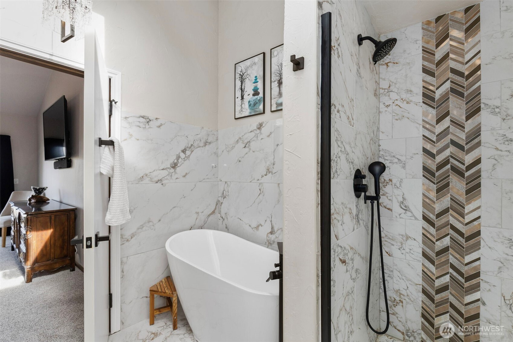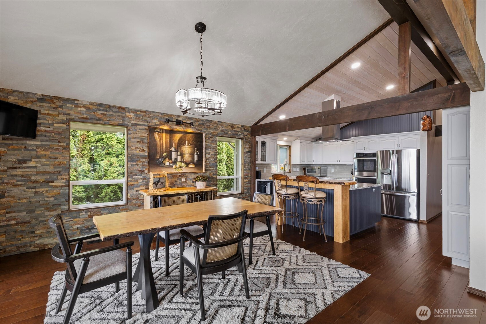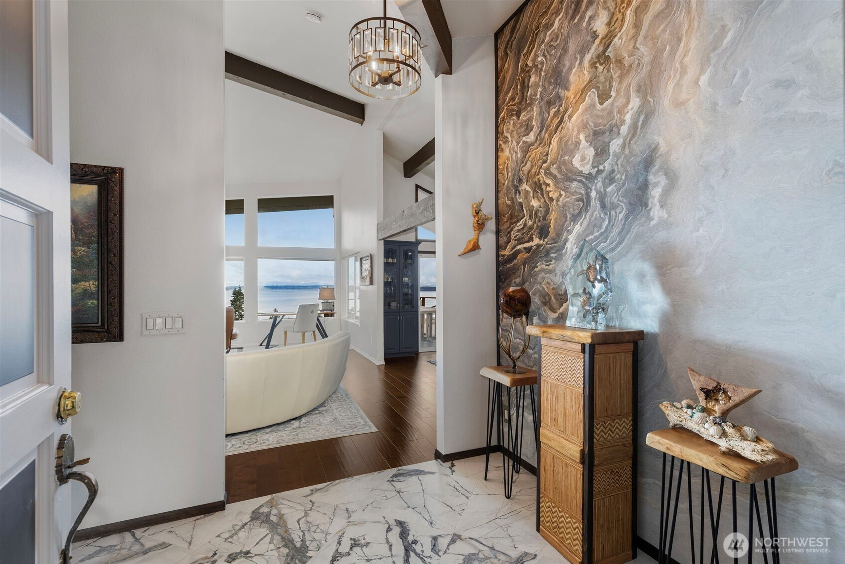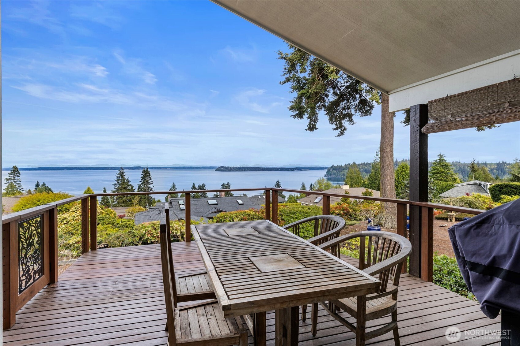 Discover a stunning view home in Port Ludlow capturing breathtaking 160° panoramic views of Admiralty Inlet, Puget Sound and the Cascade Mountains. This architecturally inspired residence blends artistic design with everyday comfort, featuring vaulted ceilings, engineered hardwood floors, and expansive walls of windows that flood the home with natural light and showcase unforgettable sunrise vistas. The chef’s kitchen is a showpiece with a one of a kind live-edge breakfast bar, built-in live-edge wine bar, and seamless flow to the dining area and covered deck—perfect for year-round indoor-outdoor entertaining. The main-level primary suite offers a private retreat with custom art feature wall, its own secluded deck, en-suite with soaking tub, tiled walk-in shower & heated floors. The lower-level walk-out basement is ideal for multi-generational living, guests, or flexible use, featuring two additional bedrooms, a spacious living room, wet and dry bar, and an updated bathroom. The private over-the-edge home theater with built-in seating and surround sound creates an exceptional entertainment experience! Settle in for the drama! Outside, enjoy easy-care landscaping, multiple view decks & built-in firepit—perfect for relaxing under the stars. Located in the heart of Port Ludlow, this home offers a rare combination of luxury, privacy, and Pacific Northwest lifestyle with world-class views, outdoor recreation, marina access, private club, and nearby golf amenities.