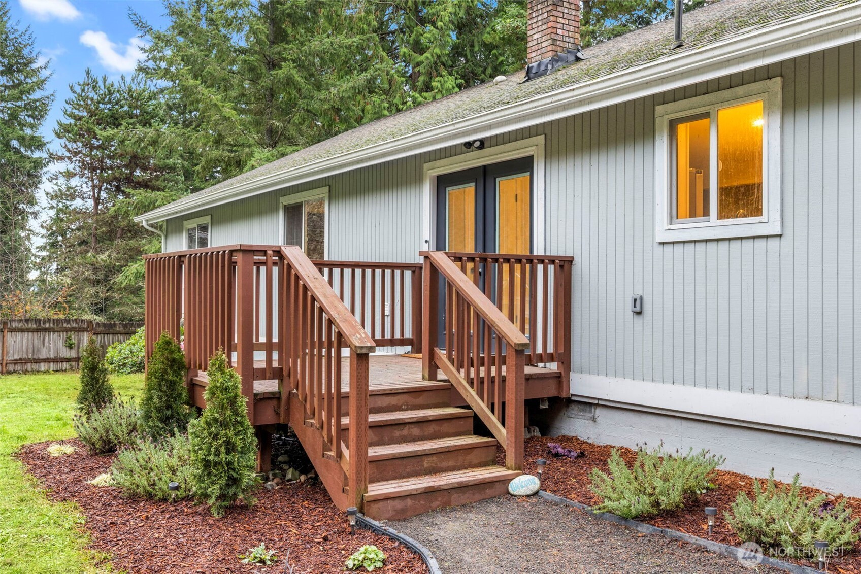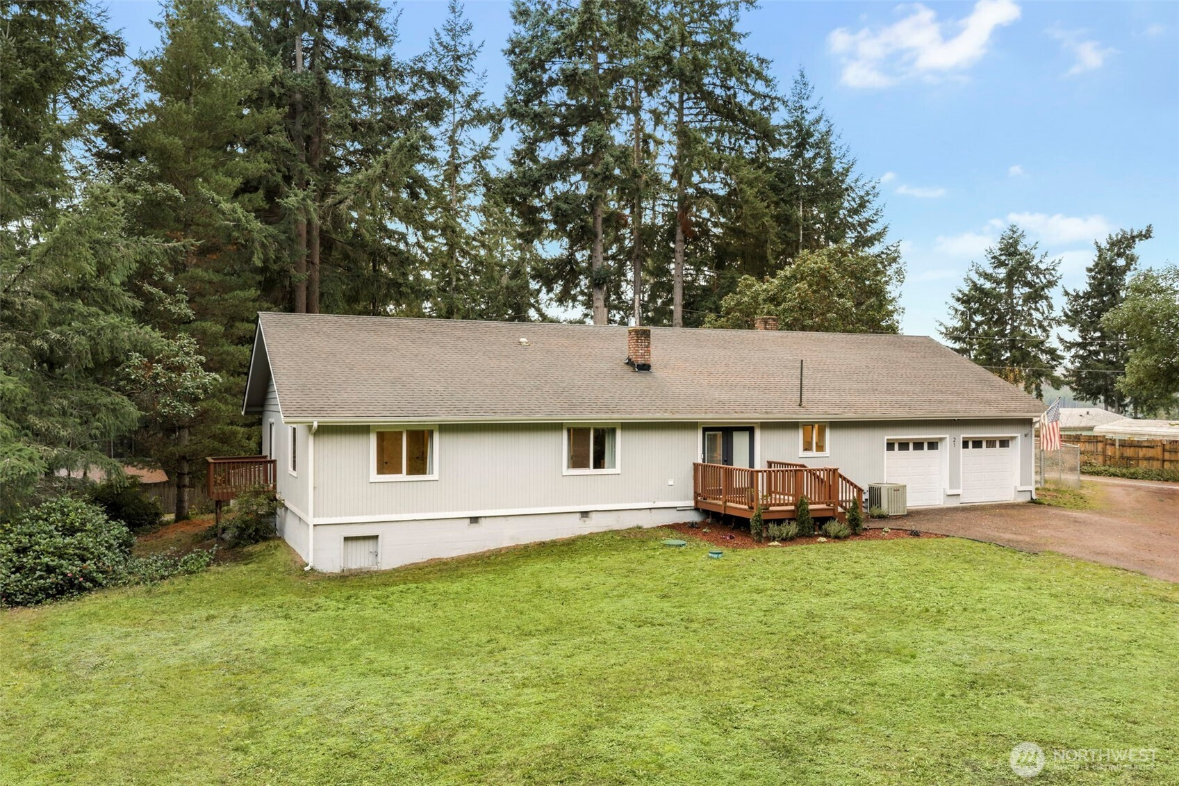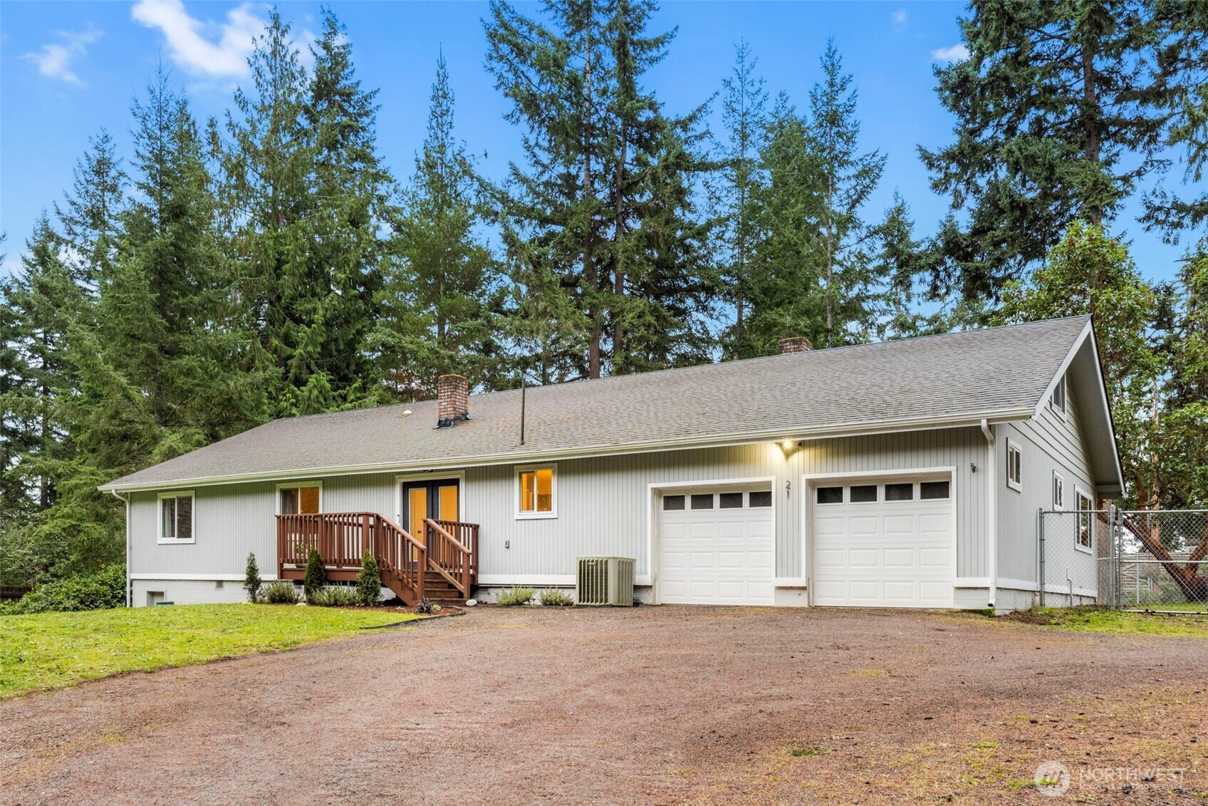 Turnkey rambler on a spacious 0.59-acre lot with room for animals, RV parking, gardening, or a potential shop. This single-level home offers 3 bedrooms + den, 2 full baths, and two living areas for flexible living. The updated kitchen features white shaker cabinets, quartz countertops, stainless steel appliances, and a brand-new dishwasher. The large primary suite includes a walk-in closet, updated bathroom and private deck access. Enjoy peaceful surroundings with easy freeway access, 5-minute drive to the Hood Canal Bridge and conveniently near Teal Lake & PL Golf Course offering easy access to fishing, kayaking, golfing and endless outdoor fun. Move-in ready and beautifully updated!
