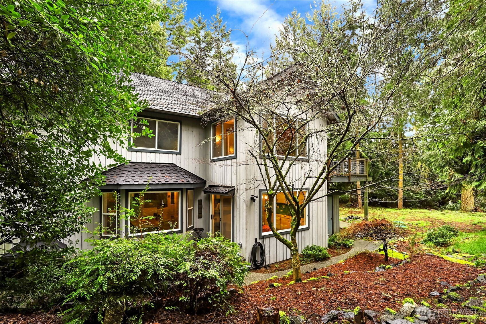 Introducing 211 Baycliff, a spacious home set on 1 acre in the desirable gated Kala Point community. Designed for both comfort & versatility, this property offers space to gather, relax, and create lasting memories. Set well back from the road the home welcomes you into a peaceful, private setting surrounded by mature evergreens, where the beautifully wooded landscape provides a serene, nature filled backdrop that captures the essence of Pacific Northwest living. A welcoming covered front porch creates a warm first impression and offers the perfect space to relax and enjoy the tranquil surroundings. Inside, the recently upgraded kitchen features newer flooring-cabinetry-granite countertops-updated appliances-and a built in wine cooler, ideal for everyday living and entertaining. Custom shutter blinds throughout add a touch of elegance while enhancing light and privacy. The expansive 3 car garage offers generous space for vehicles, storage, or a workshop. Above, a versatile bonus room provides endless possibilities including a theatre room, studio, hobby space, or guest retreat. The primary suite offers a spacious bath w/soaking tub & a private deck creating a peaceful place to unwind and take in the surrounding natural beauty. With its solid features and flexible layout this home presents a wonderful opportunity to add your own personal touches. As part of Kala Point residents enjoy exceptional amenities including a pool-clubhouse-beach access-pickleball-tennis courts & more.