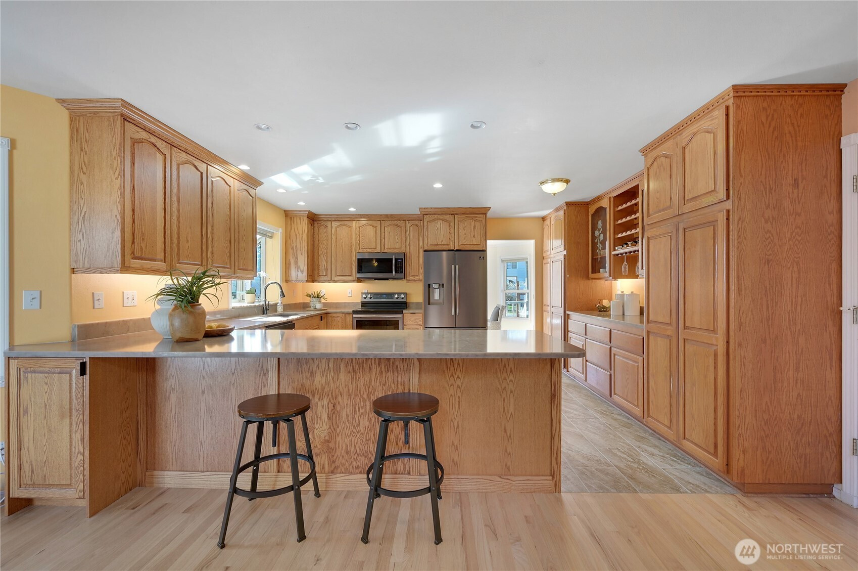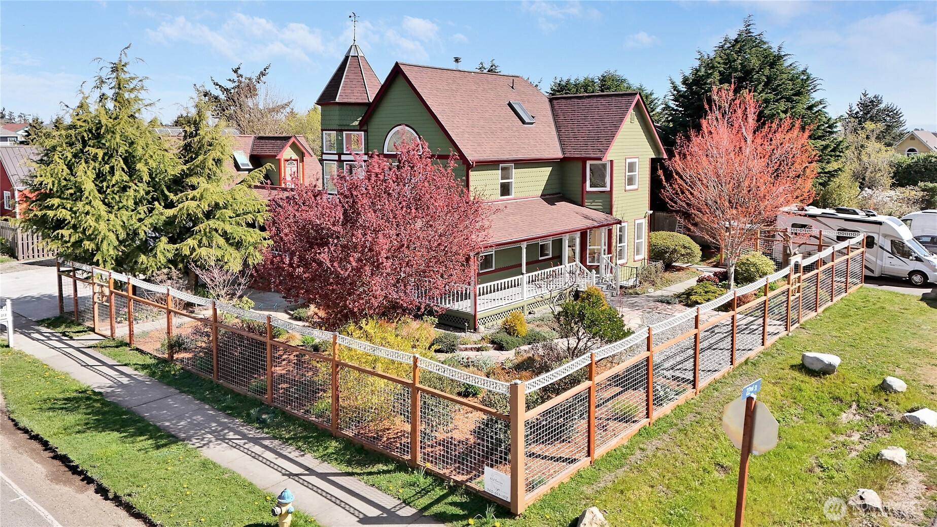 A landmark Port Townsend residence, 2212 Sheridan, offers rare flexibility for multi-generational living, home business, or income opportunities. This 5+ bedroom, 4.25 bath, 4,800± sq ft home spans three thoughtfully designed levels plus a large bonus suite over the garage. Expansive main-floor living and dining spaces are wrapped in windows, opening to a covered wraparound porch and beautifully landscaped, deer-fenced gardens. The generous kitchen, updated in 2020 with quartz countertops and abundant storage, flows to a skylit dining area, a rear deck, a ramp, and a mudroom entry. Upstairs, the vaulted primary suite features a spa bath with soaking tub, dual shower and vanities, a walk-in closet with custom shelving, and an enchanting second-floor private deck. Two additional bedrooms share a jack-and-jill bath and walk-in closets, with finished attic storage above. The finished lower level lives like its own apartment with two more bedrooms, a full bath, a family room with a wood stove, laundry, and exterior entry. Separate bonus room with ¾ bath over the garage, chair lifts to upper and lower floors, ramps, central vacuum, full-house intercom, dual 200-amp panels, portable generator, new roofs (2025) and paint, and extensive parking complete this exceptionally adaptable property.