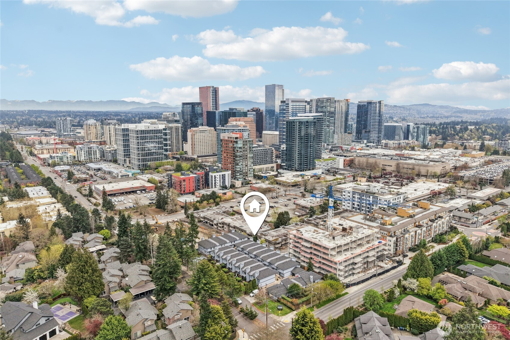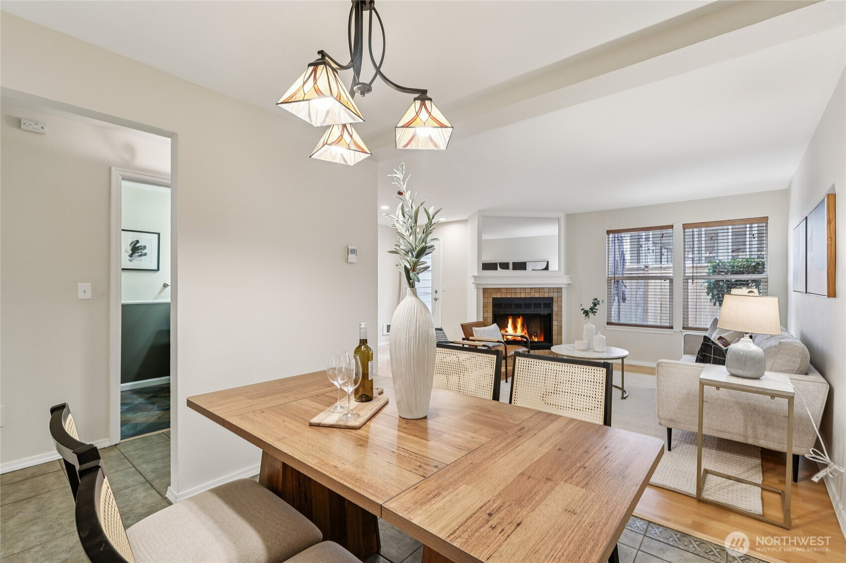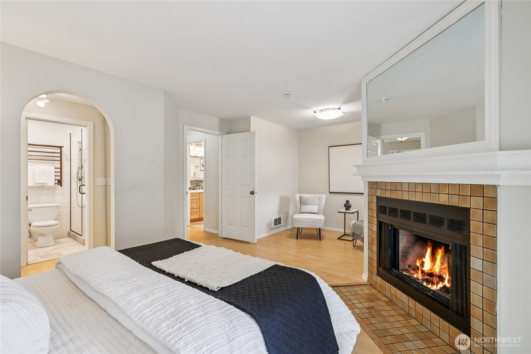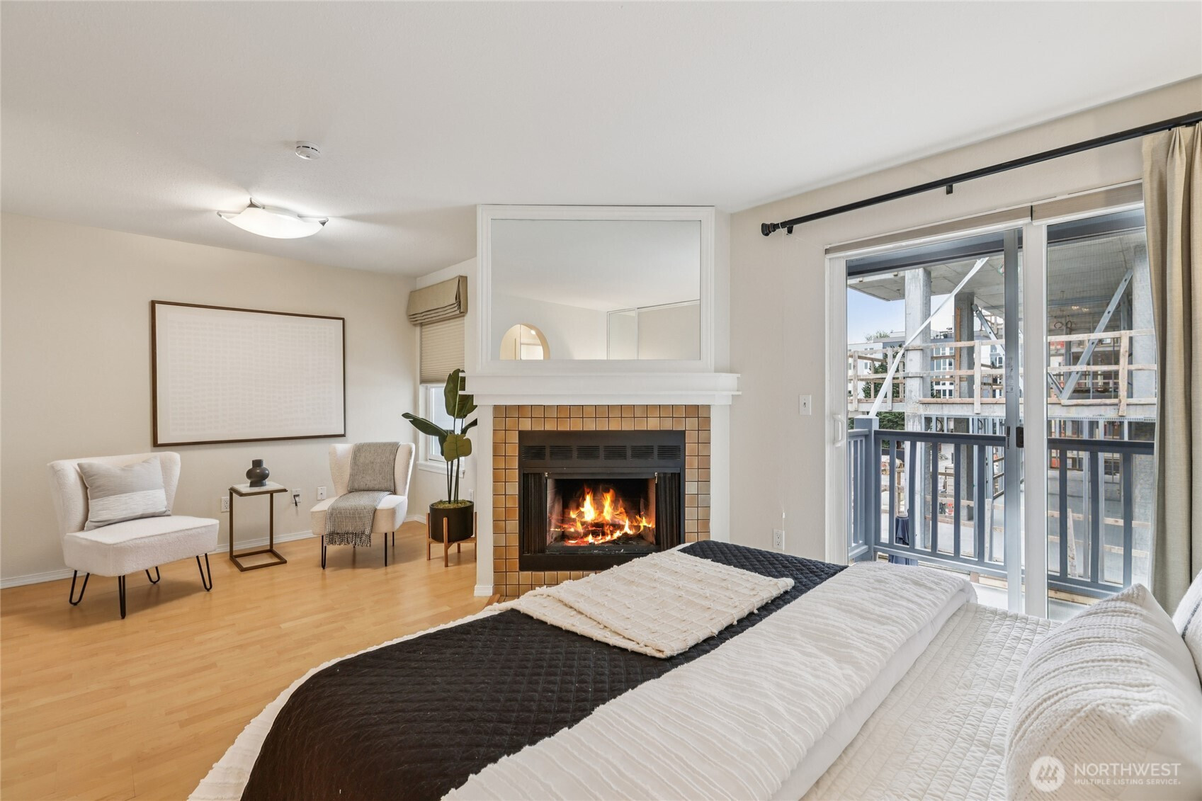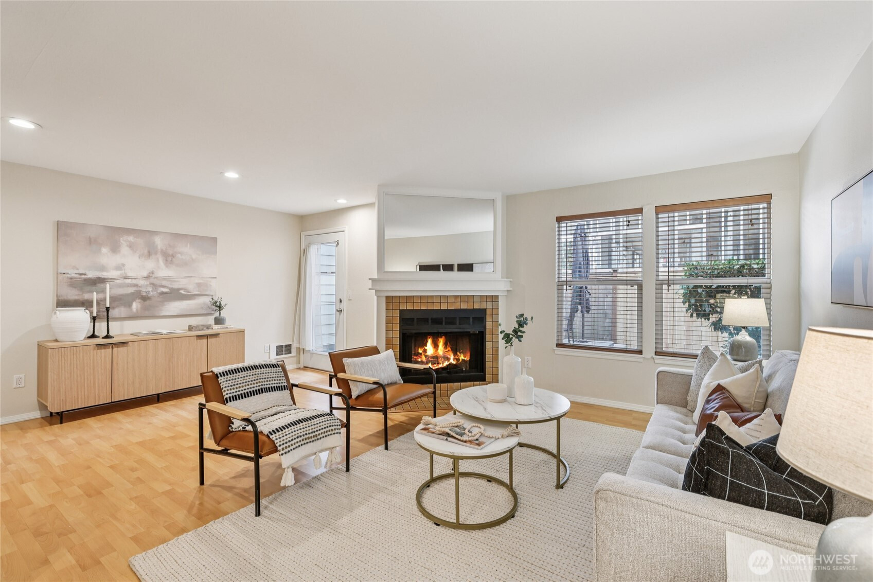 Tastefully updated 2 Bed/ 2.5 Bath townhome conveniently located in the heart of downtown Bellevue! The open main level is ideal for entertaining and centers around a cozy wood-burning fireplace. Remodeled kitchen features quartz counters, subway-tile backsplash, shaker cabinets and stainless steel appliances. Half bath with laundry on main level. Light-filled stairwell with big windows and recently installed plush carpet leads you up to two spacious bedrooms and two bathrooms. Large primary suite features dual closets, a second wood-burning fireplace and a balcony with city views. Fully updated en-suite bath with spacious walk-in shower and heated towel rack. Partially fenced back patio with Trex deck provides plenty of space for a BBQ and outdoor seating. Recent building updates include roof and exterior paint with courtyard improvements underway. Secured garage with two designated parking spaces and a large storage room. Investor friendly with no rental cap! Unbeatable location with easy access to shopping, restaurants, parks, freeways and top-rated Bellevue schools!
