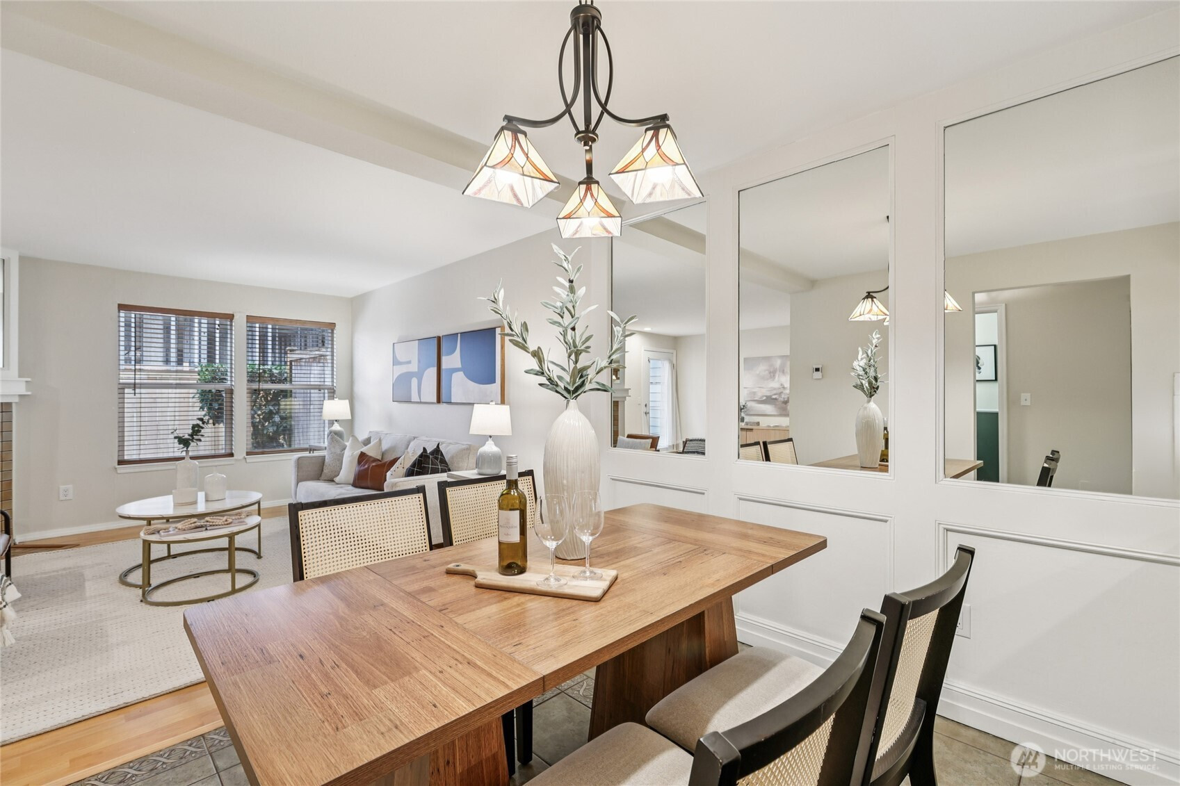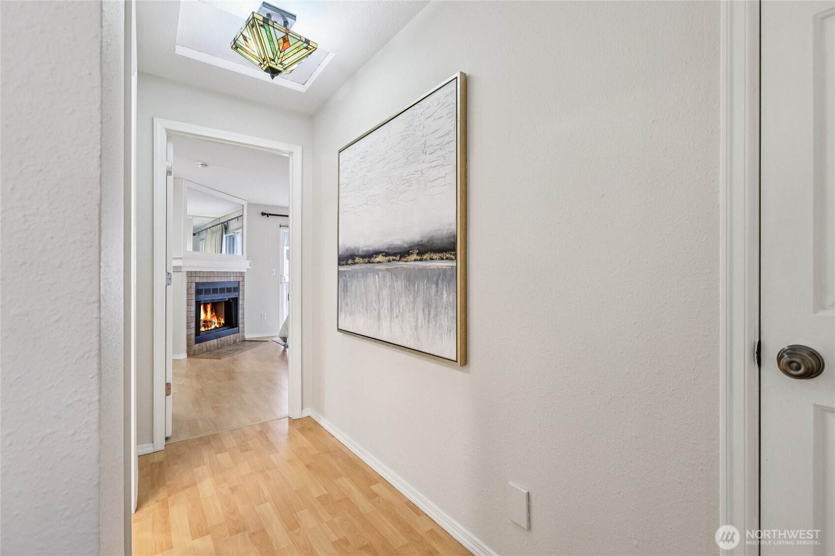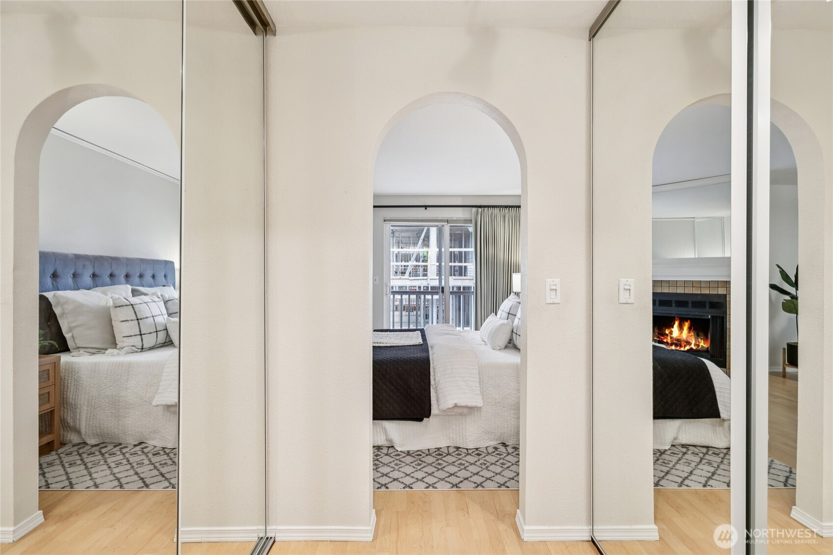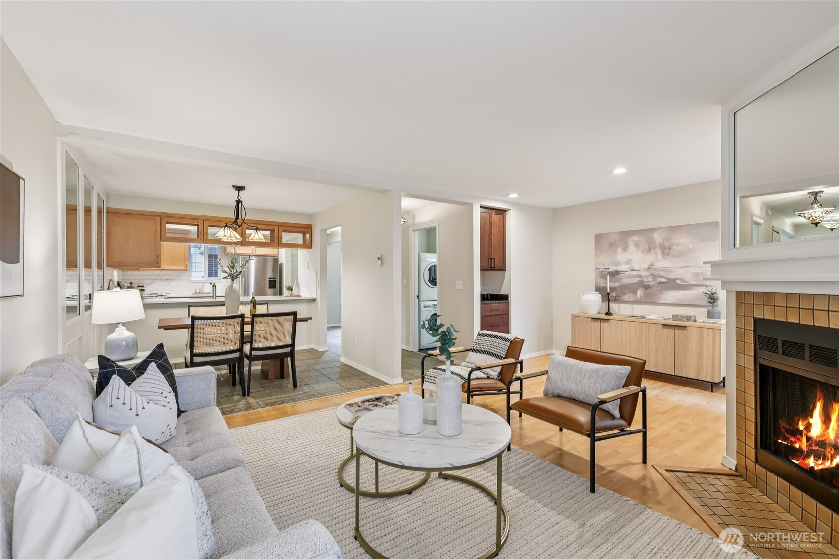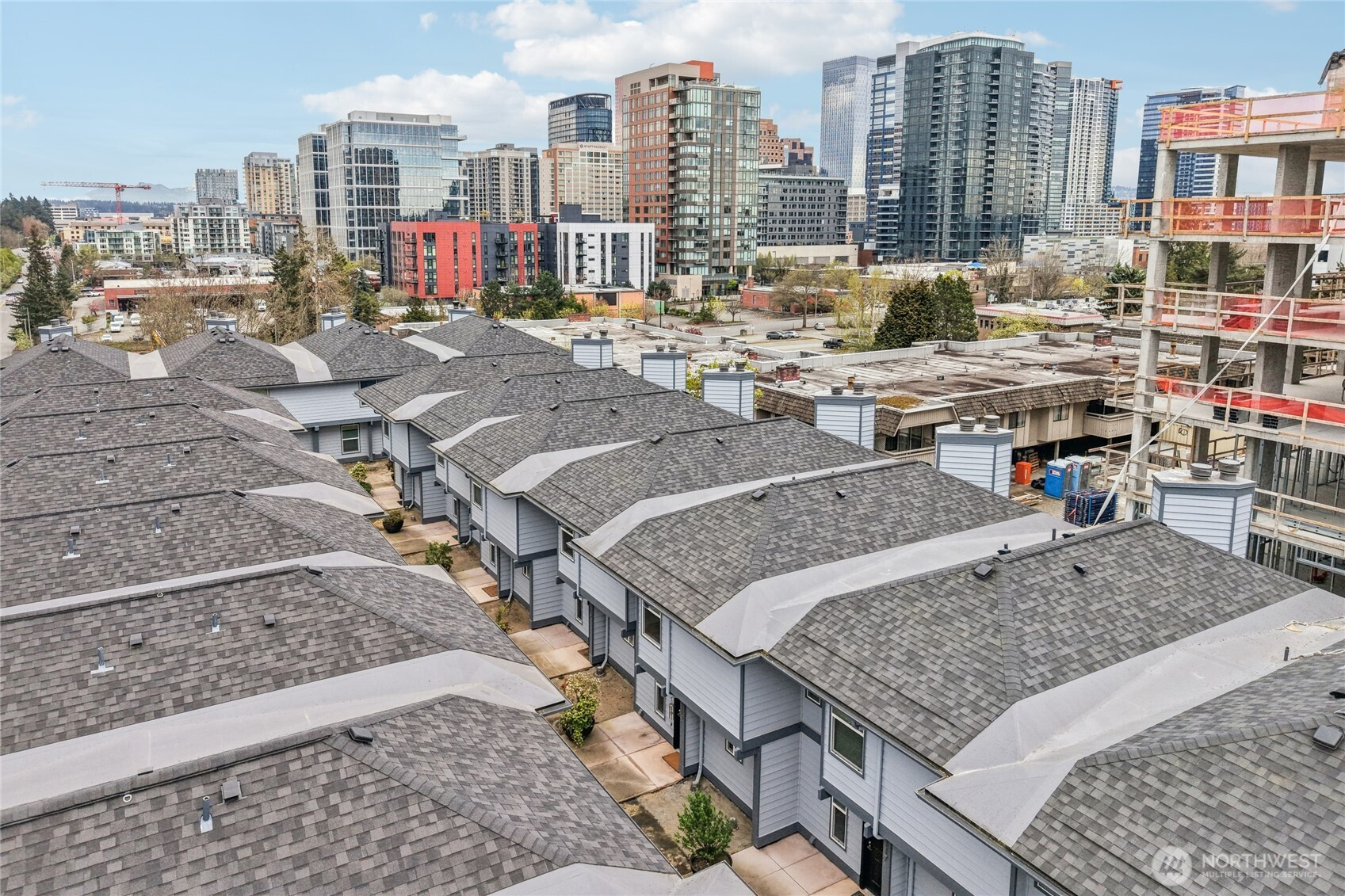 Tastefully updated 2 Bed/ 2.5 Bath townhome conveniently located in the heart of downtown Bellevue! The open main level is ideal for entertaining and centers around a cozy wood-burning fireplace. Remodeled kitchen features quartz counters, subway-tile backsplash, shaker cabinets and stainless steel appliances. Half bath with laundry on main level. Light-filled stairwell with big windows and recently installed plush carpet leads you up to two spacious bedrooms and two bathrooms. Large primary suite features dual closets, a second wood-burning fireplace and a balcony with city views. Fully updated en-suite bath with spacious walk-in shower and heated towel rack. Partially fenced back patio with Trex deck provides plenty of space for a BBQ and outdoor seating. Recent building updates include roof and exterior paint with courtyard improvements underway. Secured garage with two designated parking spaces and a large storage room. Investor friendly with no rental cap! Unbeatable location with easy access to shopping, restaurants, parks, freeways and top-rated Bellevue schools!