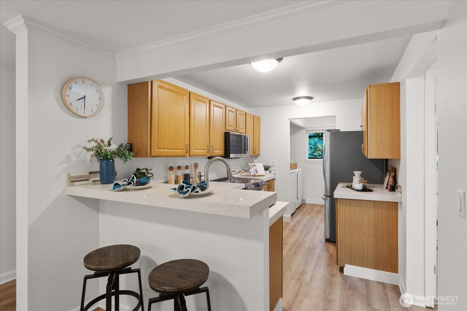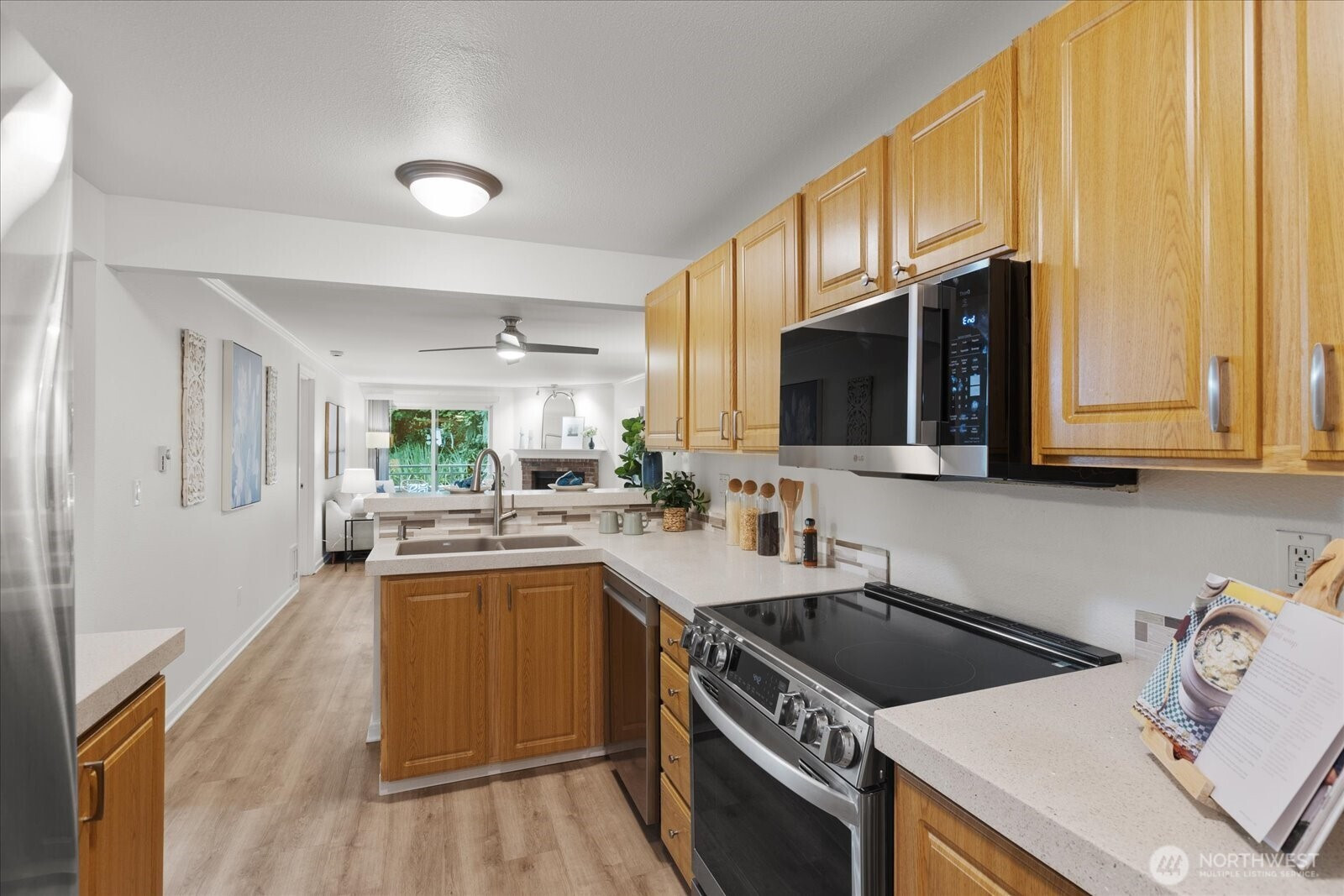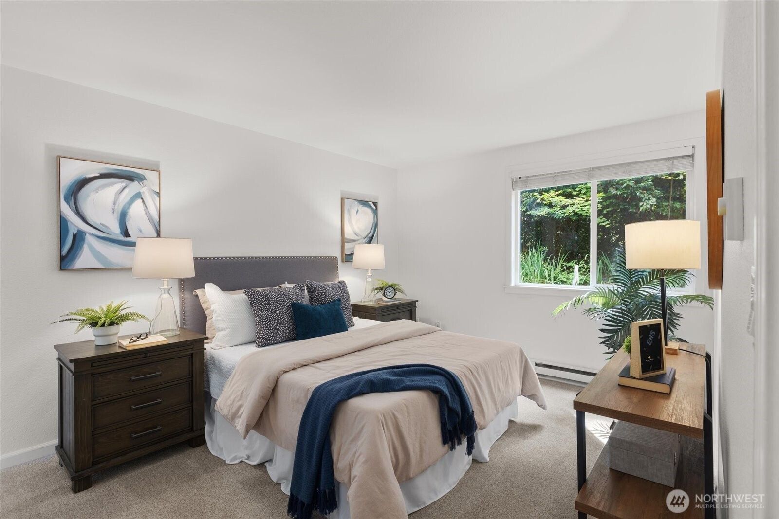 Welcome to your retreat in the heart of the Juanita NH! Nestled at the Kirkland Springs community, this charming home offers a perfect blend of comfort and convenience. With 980 sqft, the home features 2 spacious bdrms & 2 baths. Inside, you'll find an open-concept living area w/ new SS appliances & in-unit washer + dryer. Relax on the back patio next to the beautiful water feature after a day at work or running errands. NO RENTAL CAP offers flexibility for future investment/income producing opportunities. Totem Lake Village is nearby where you can enjoy shopping, dining, and movies. A seamless commute to Seattle/Redmond/Woodinville/Bothell. Modern living meets effortless convenience, this home is a true gem! Make it your own. Tour Today!